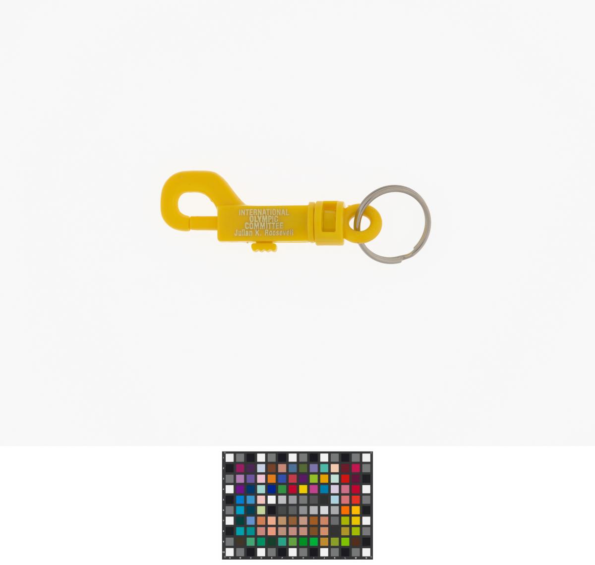 Porte-clés jaune avec légende: "INTERNATIONAL / OLYMPIC / COMMITTEE / Julian K. Roosevelt".