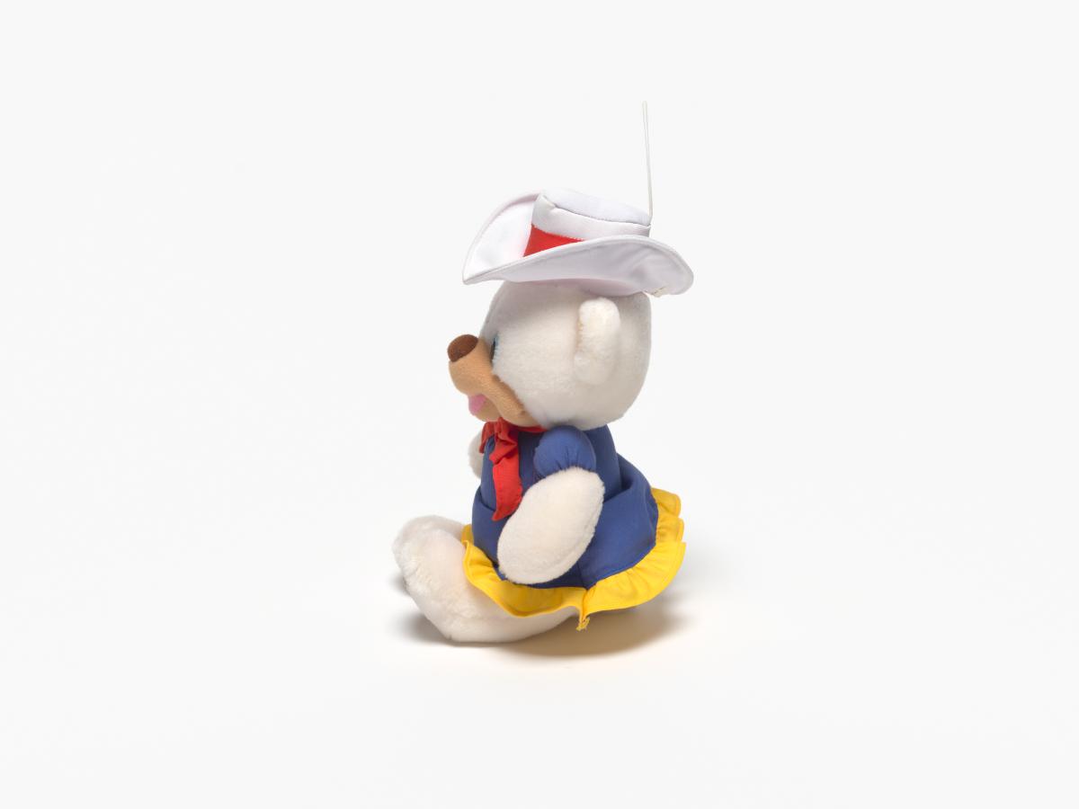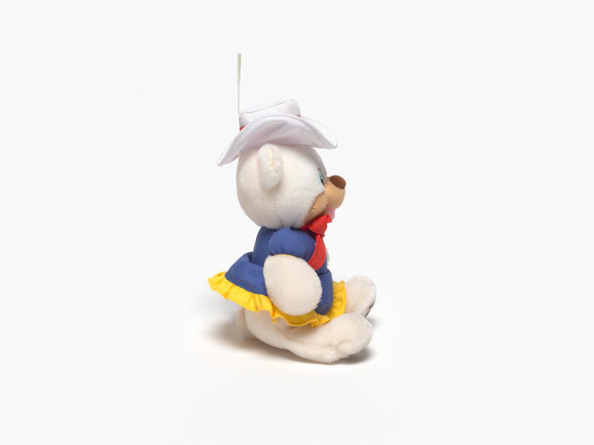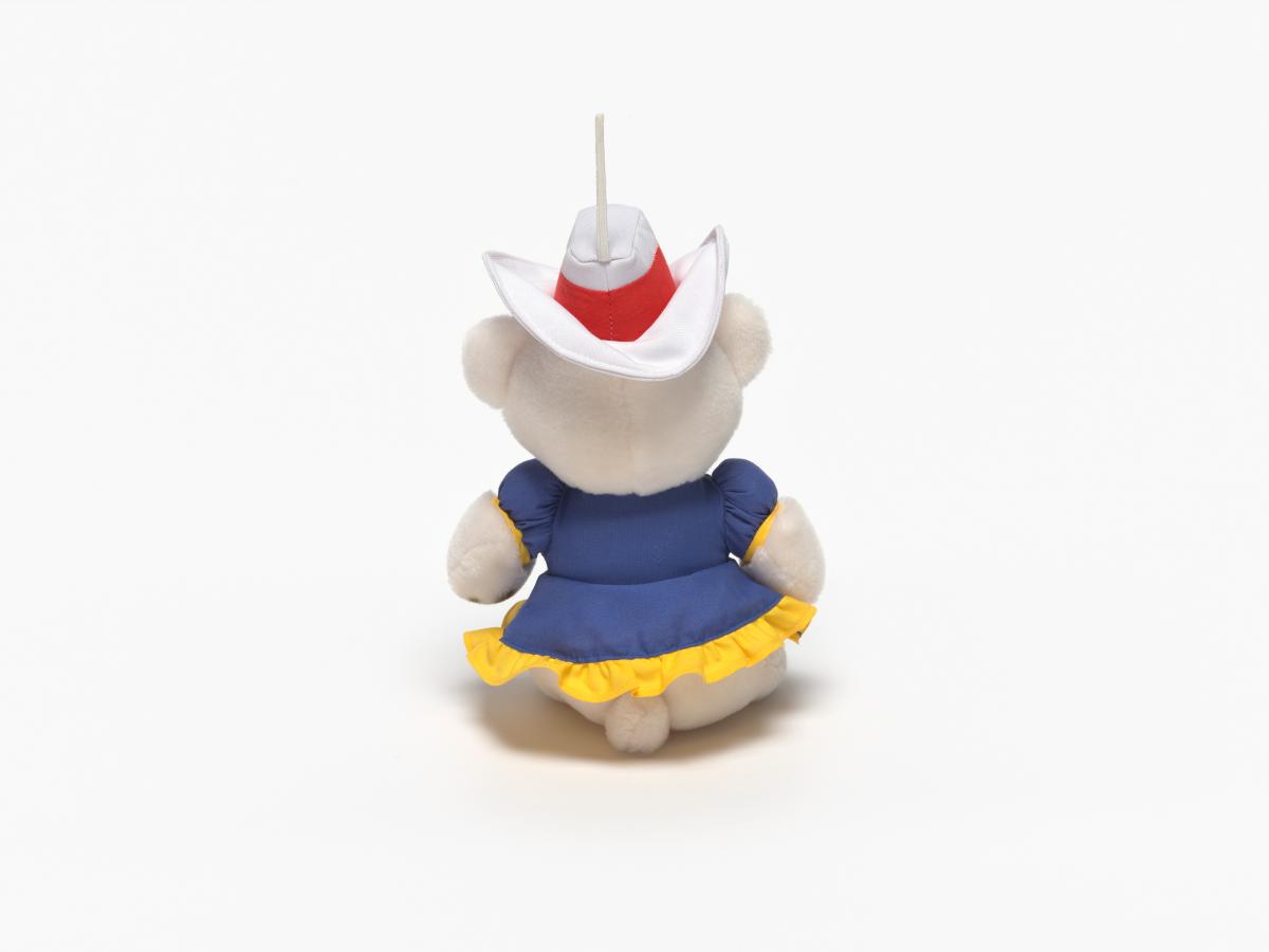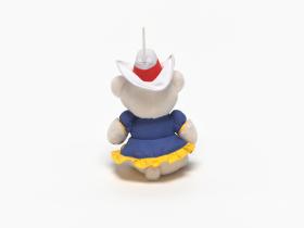 Ours en peluche avec un chapeau blanc et une robe bleue.