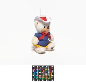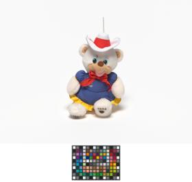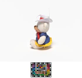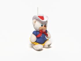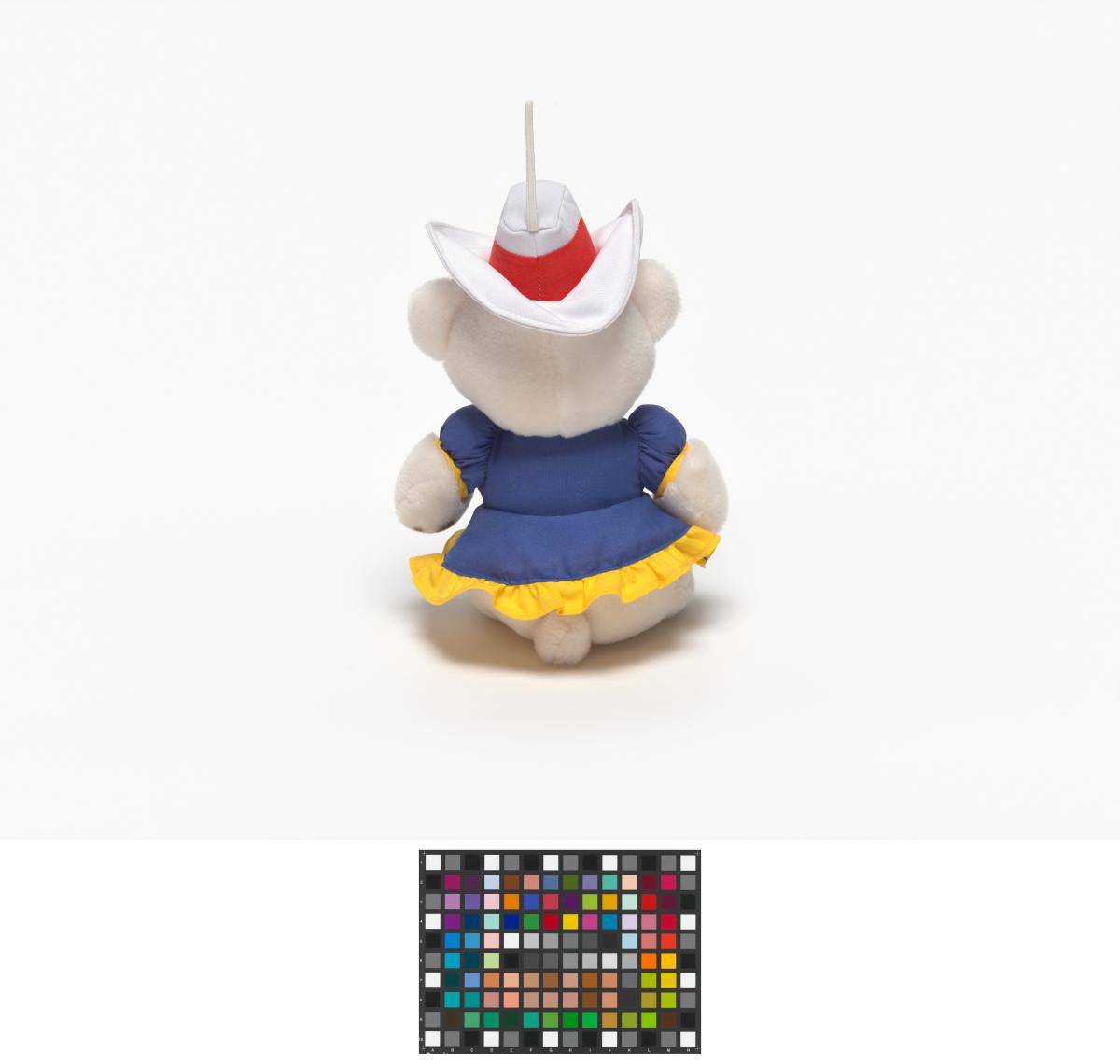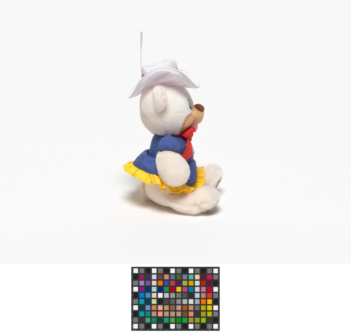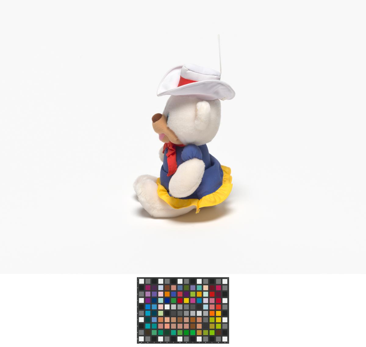 Ours en peluche avec un chapeau blanc et une robe bleue.