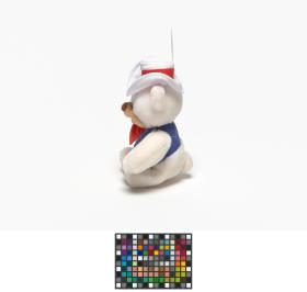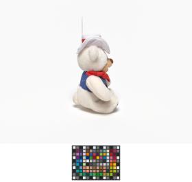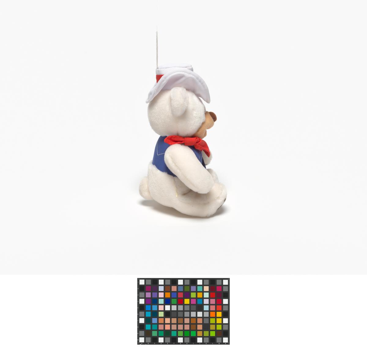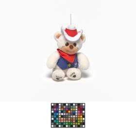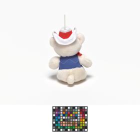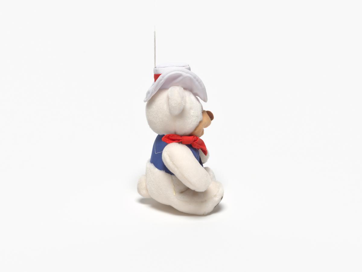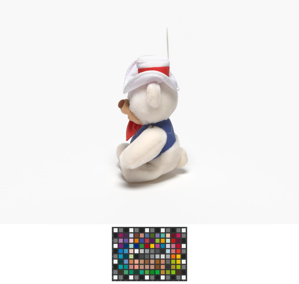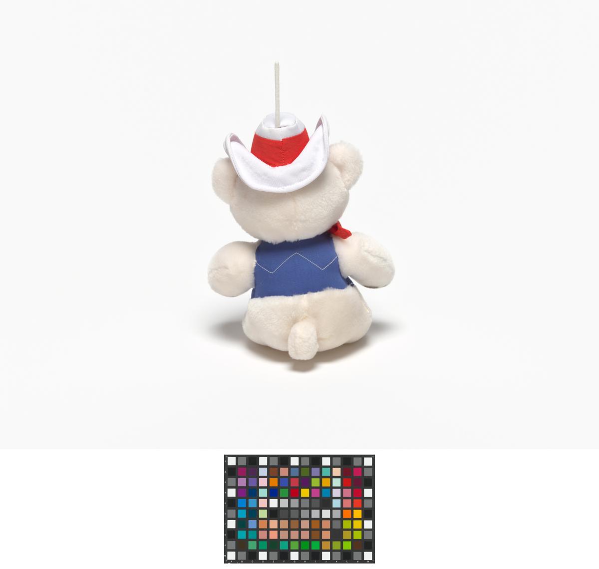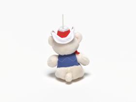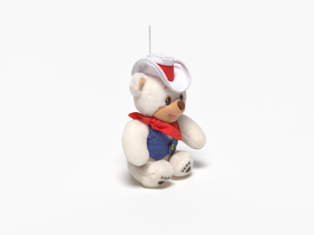 Ours en peluche avec un chapeau blanc et une petite veste bleue.