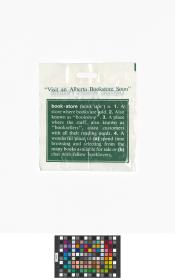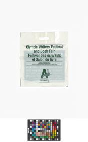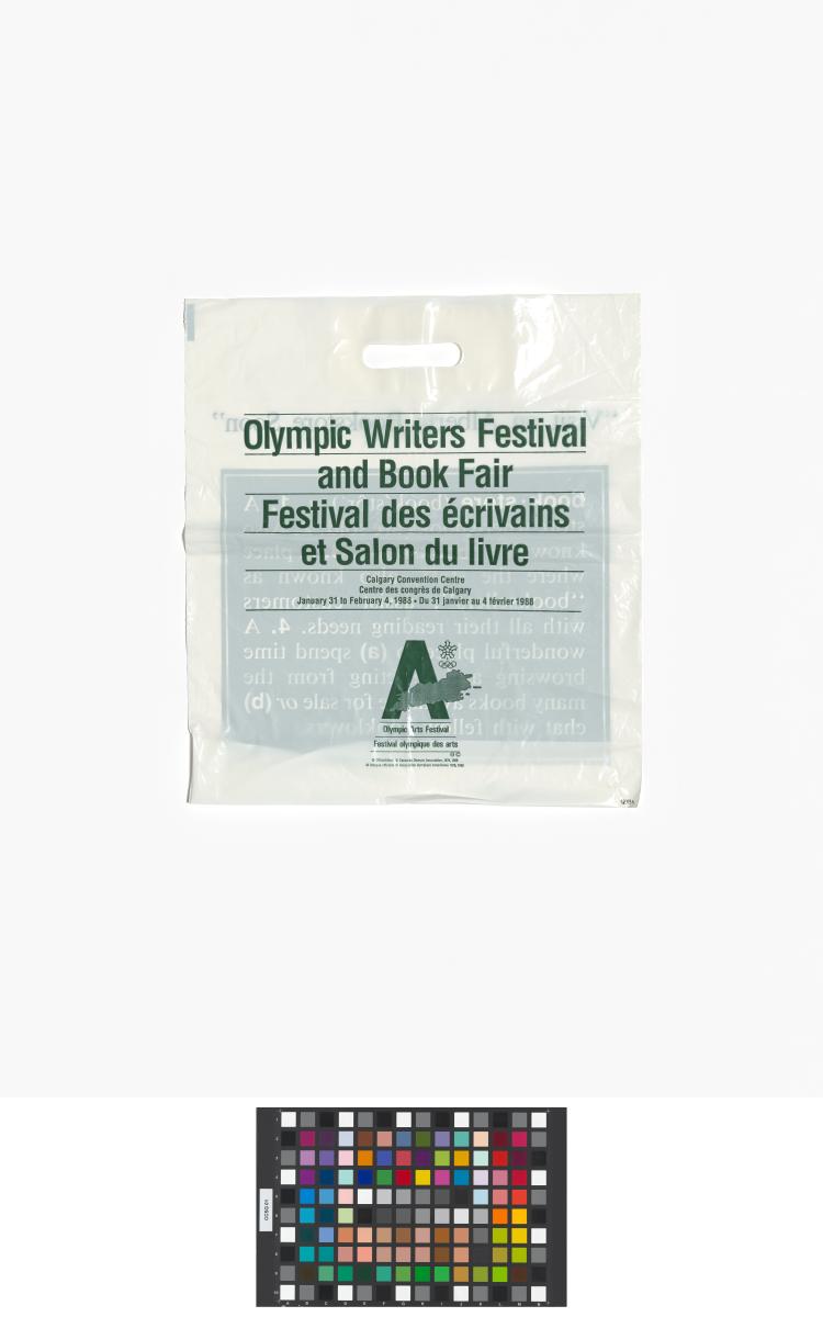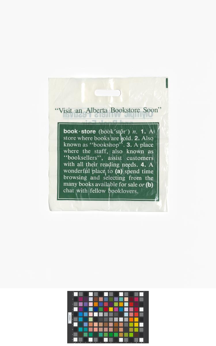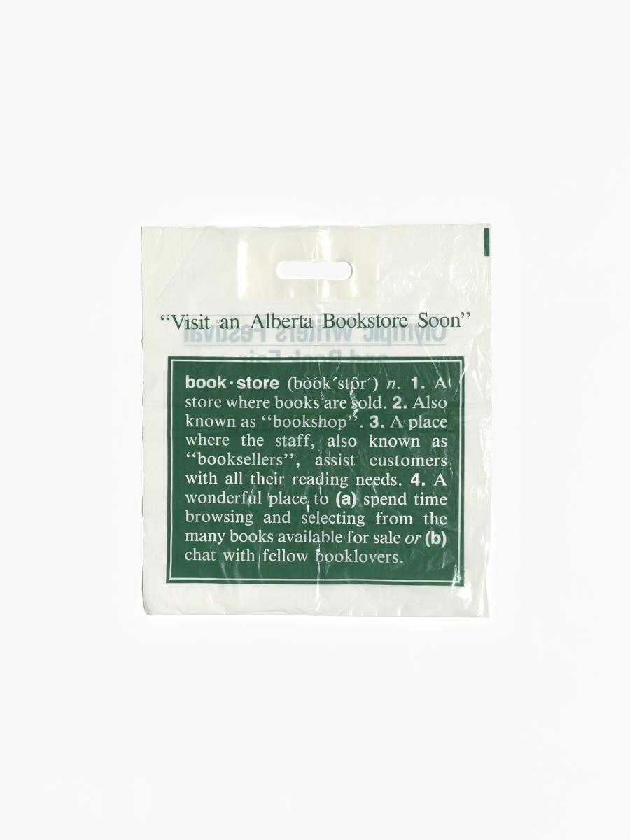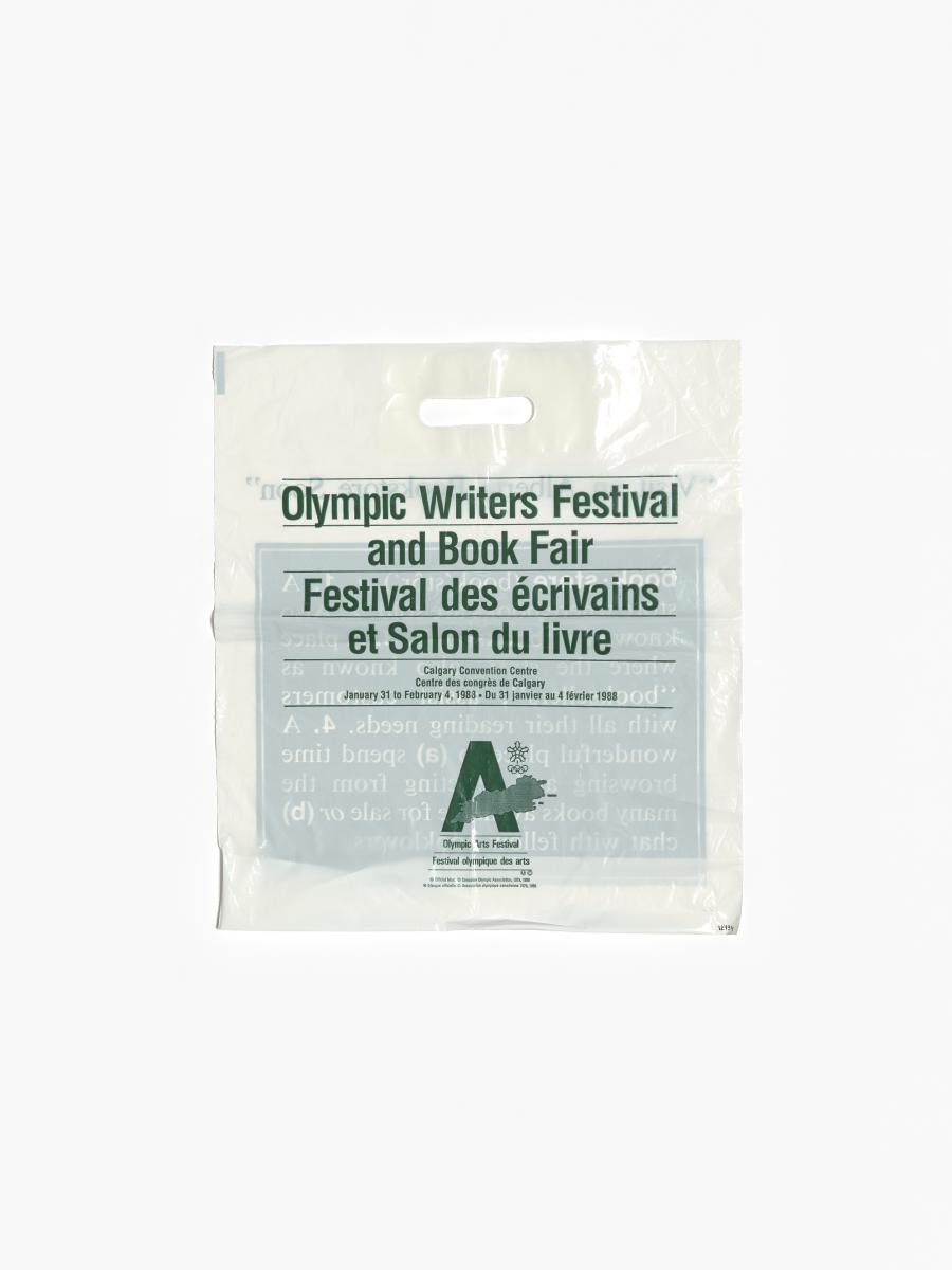 Sac blanc en plastique. Légende: "Olympic Writers Festival / and Book Fair / Festival des écrivains / et Salon du livre / Calgary Convention Centre / Centre de congrès de Calgary / January 31 to February 4, 1988 · Du 31 janvier au 4 février 1988". En bas, logo de la manifestation. Derrière, extrait d'un dictionnaire donnant la définition de "bookstore".