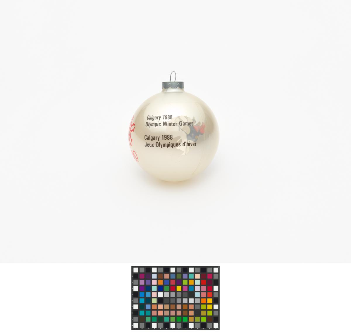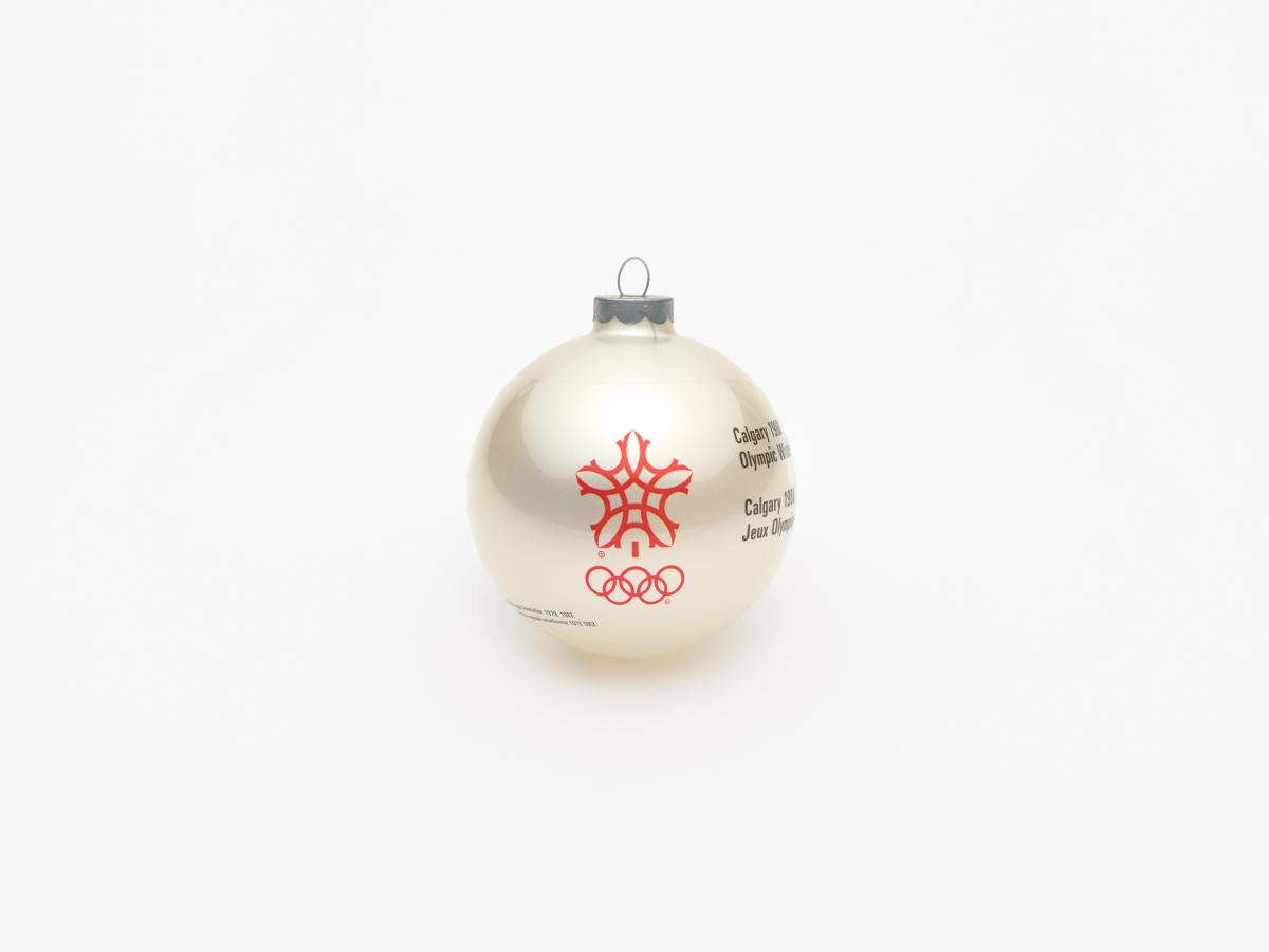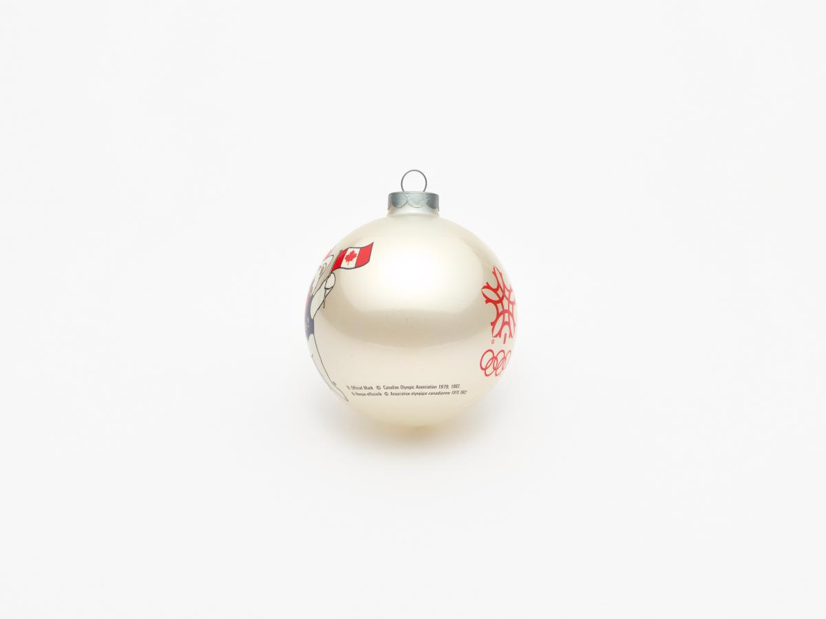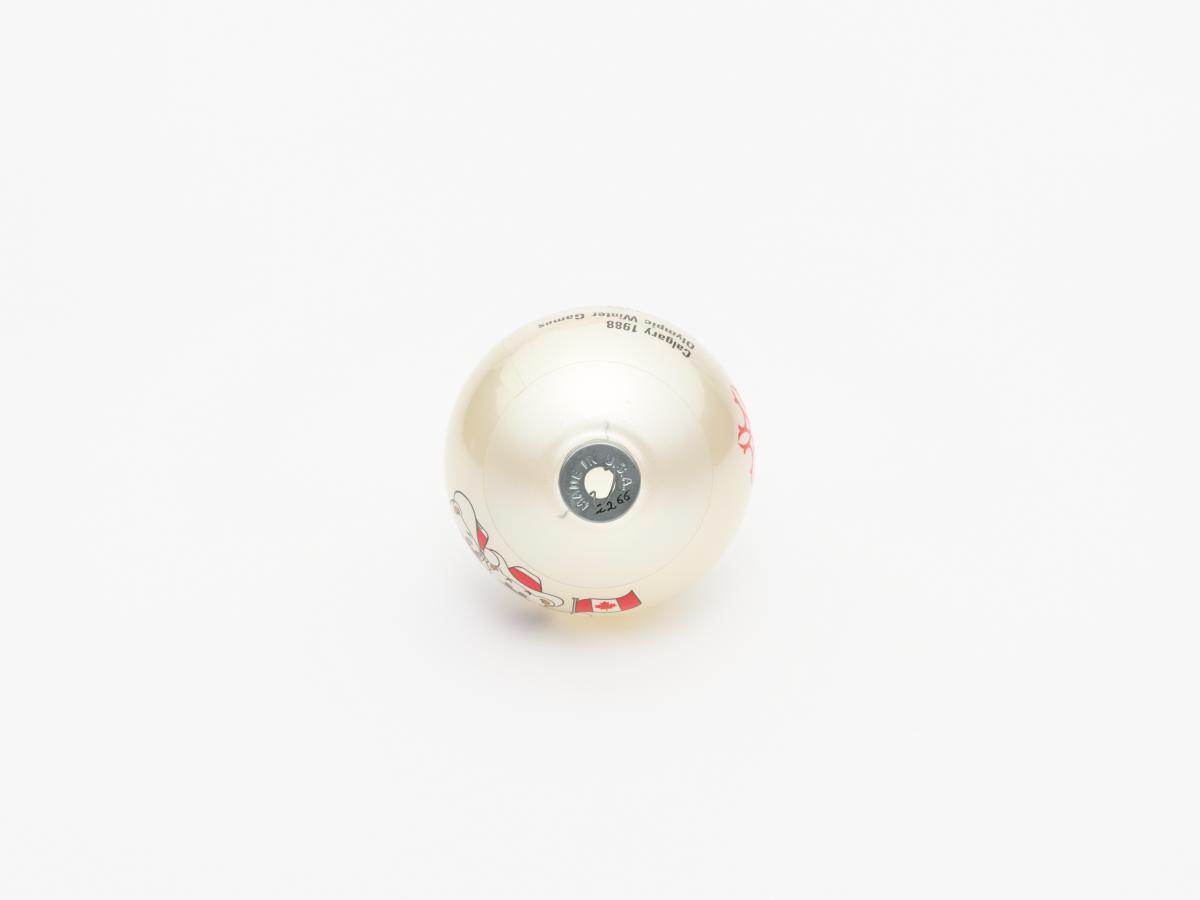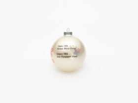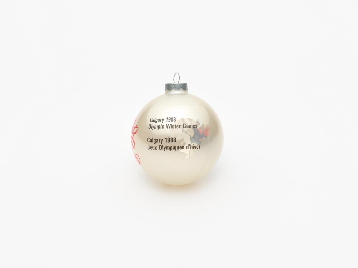 Boule de Noël avec Hidy et Howdy, les mascottes des Jeux. Emblème des Jeux et légende: "Calgary 1988 / Olympic Winter Games / Calgary 1988 / Jeux Olympiques d'hiver".