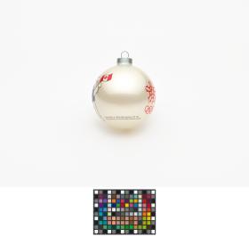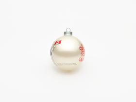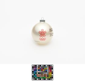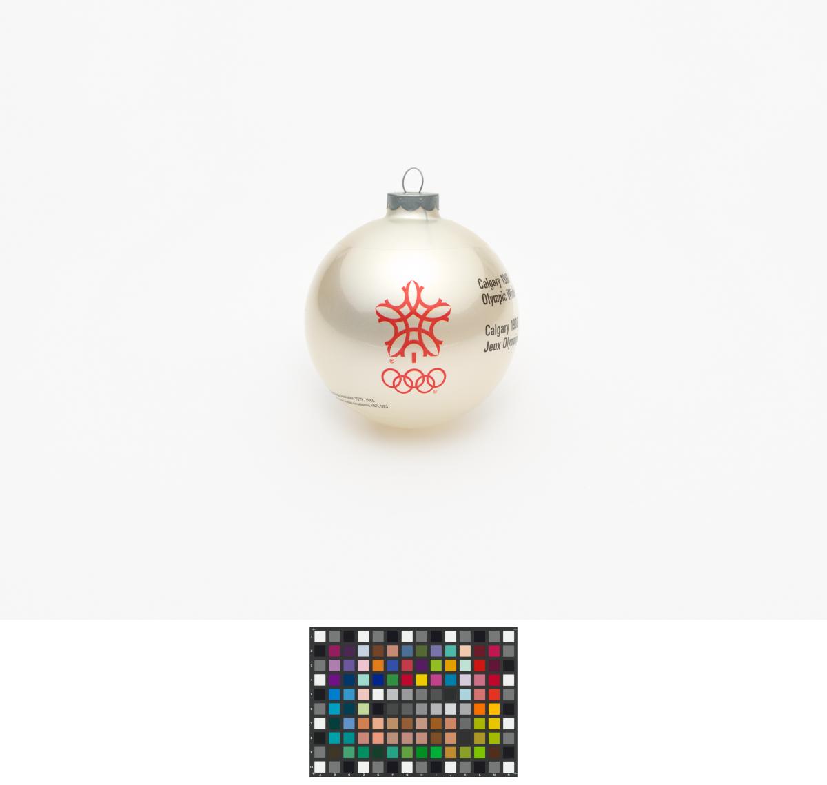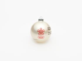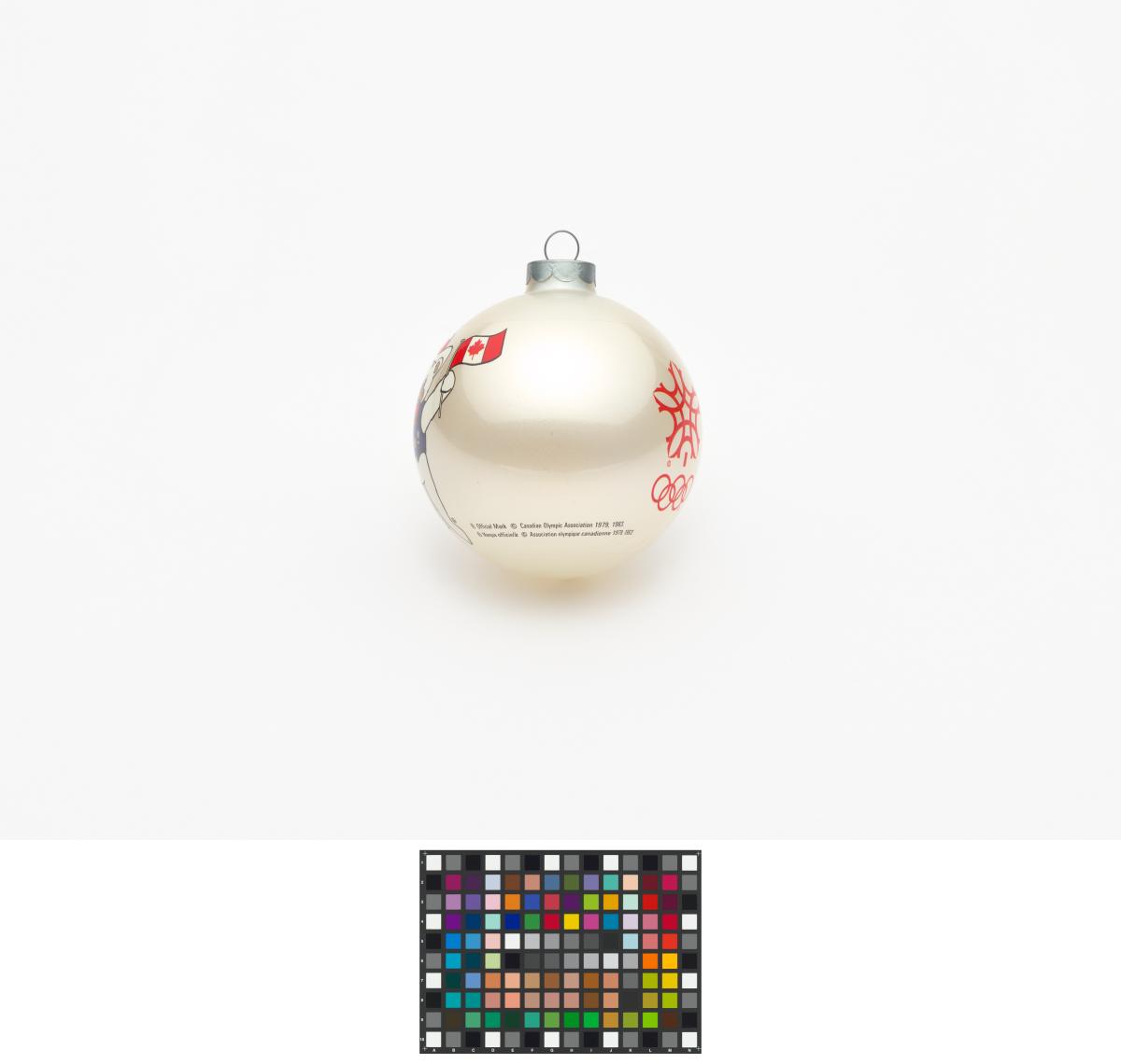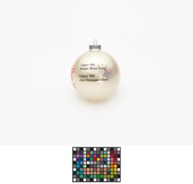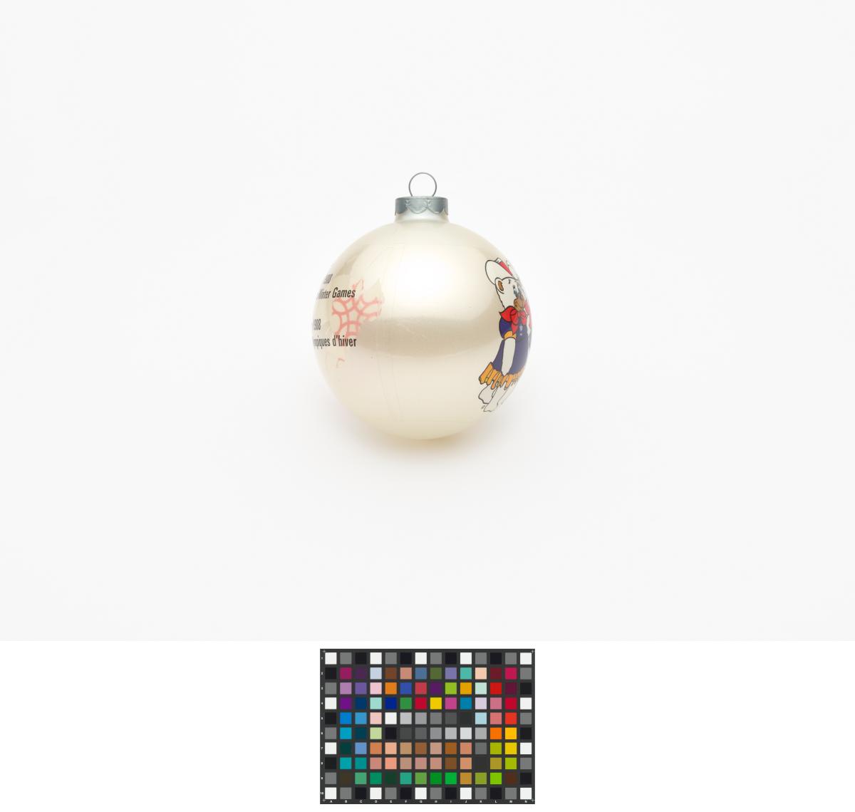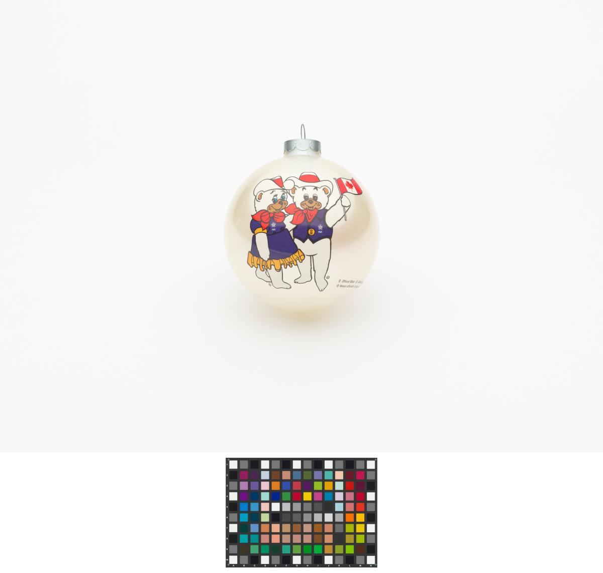 Boule de Noël avec Hidy et Howdy, les mascottes des Jeux. Emblème des Jeux et légende: "Calgary 1988 / Olympic Winter Games / Calgary 1988 / Jeux Olympiques d'hiver".