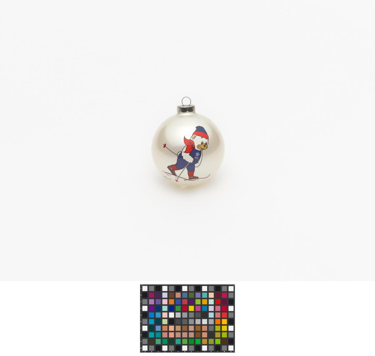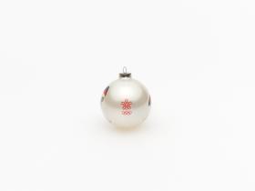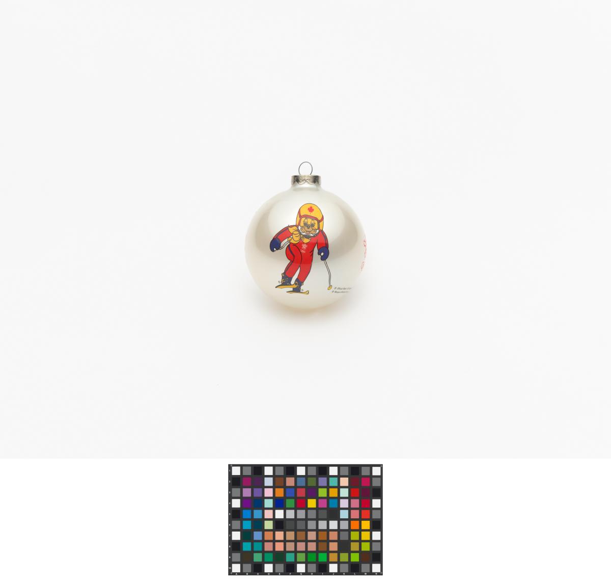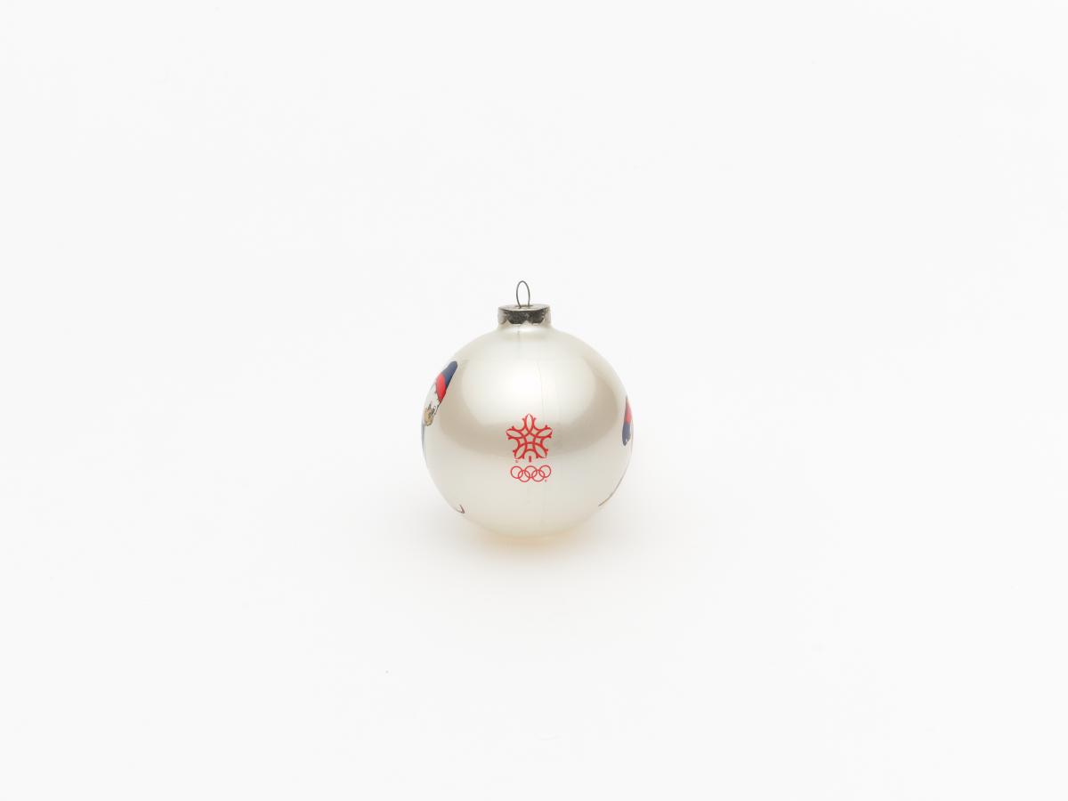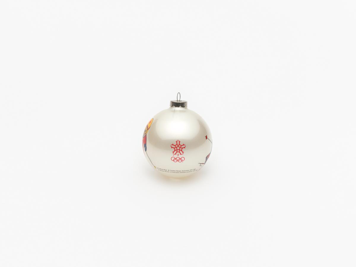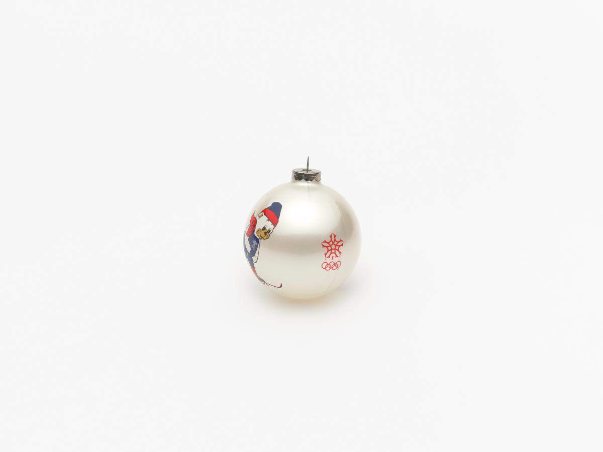 Boule de Noël avec l'emblème des Jeux et Hidy et Howdy, les mascottes des Jeux, faisant du ski.