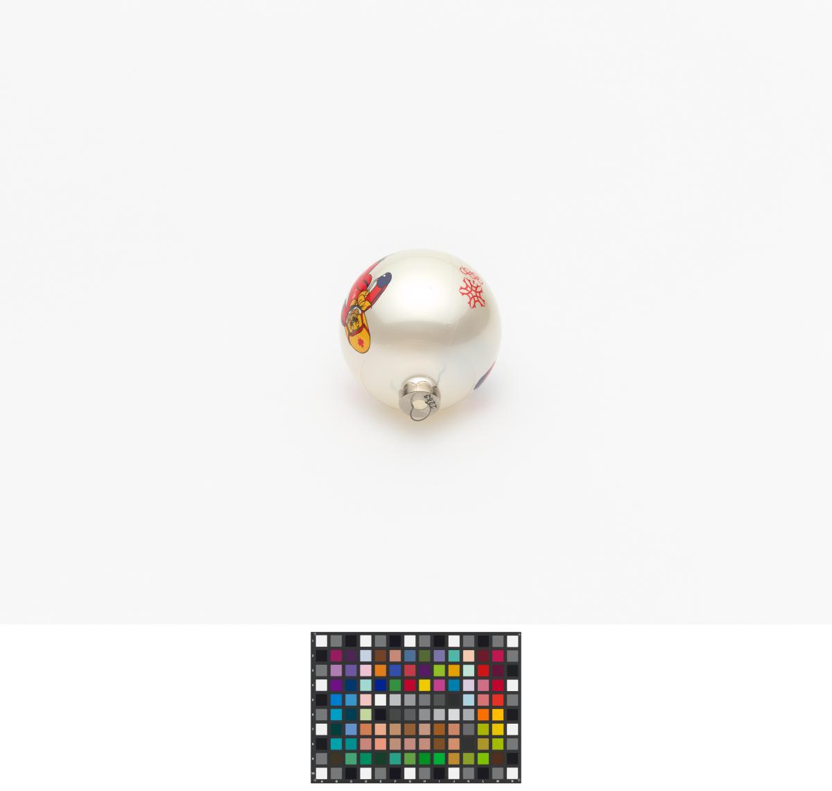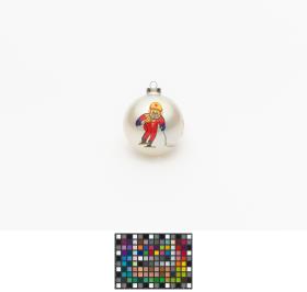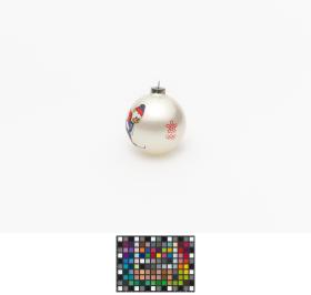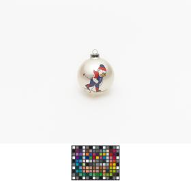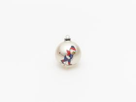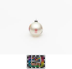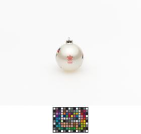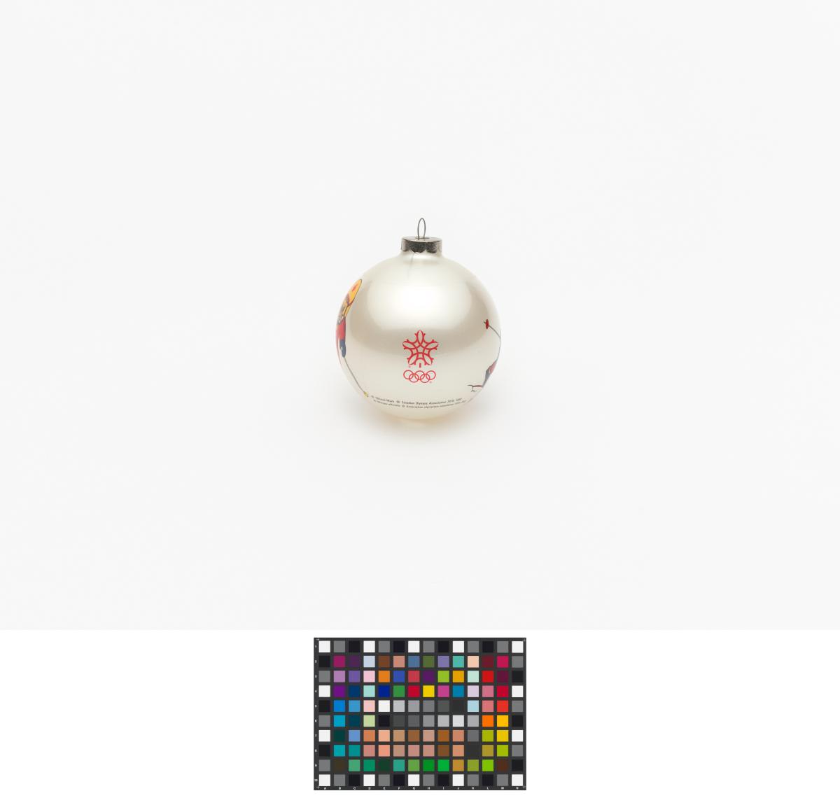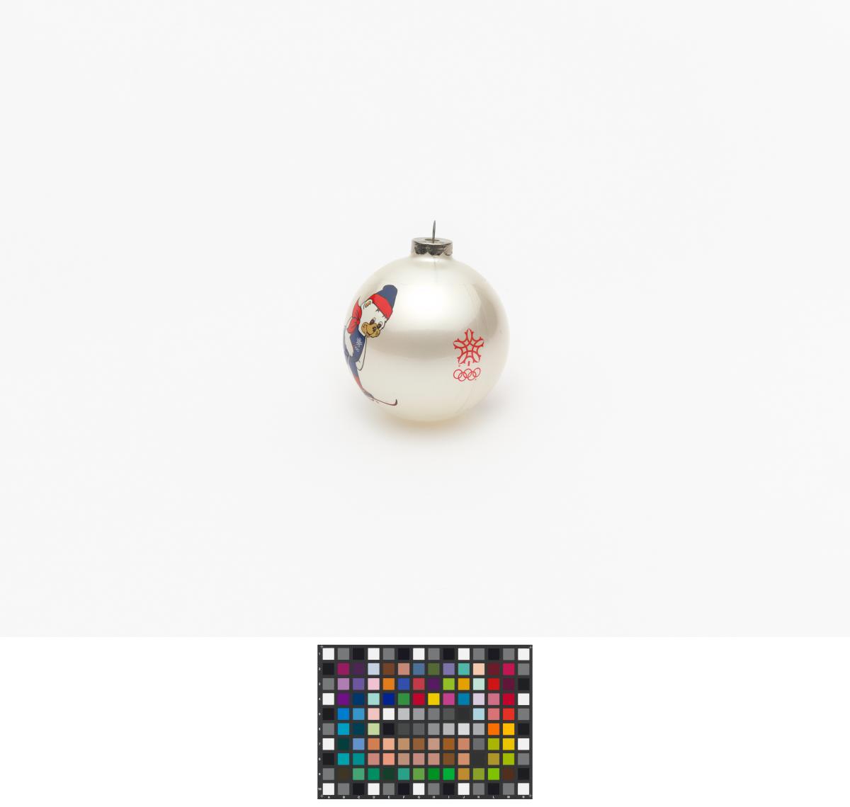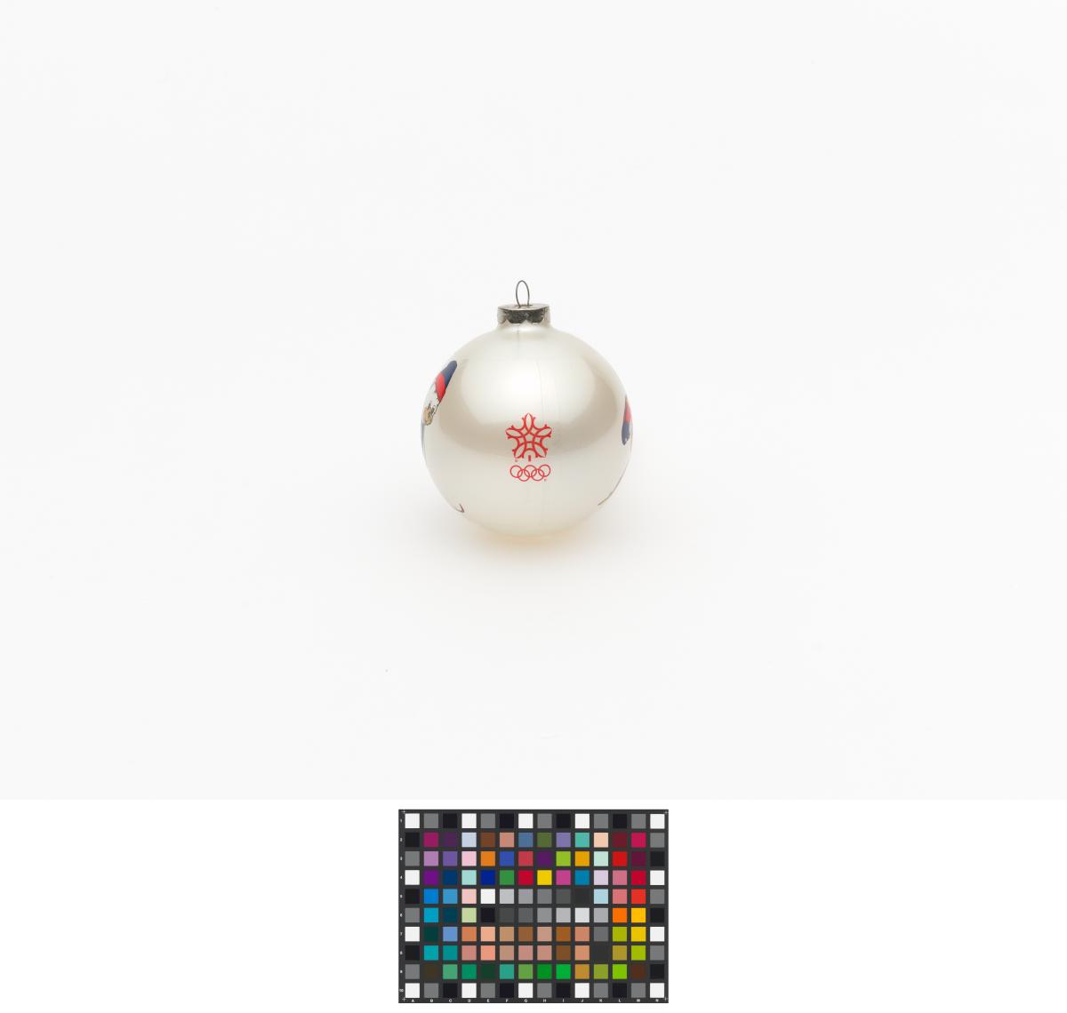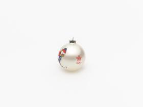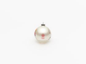 Boule de Noël avec l'emblème des Jeux et Hidy et Howdy, les mascottes des Jeux, faisant du ski.