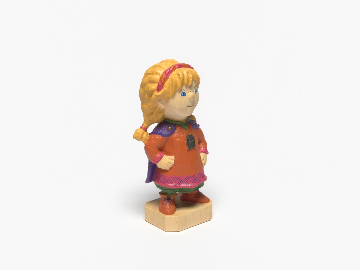 Statuette en bois portant des habits du Moyen-âge avec l'Emblème des Jeux.