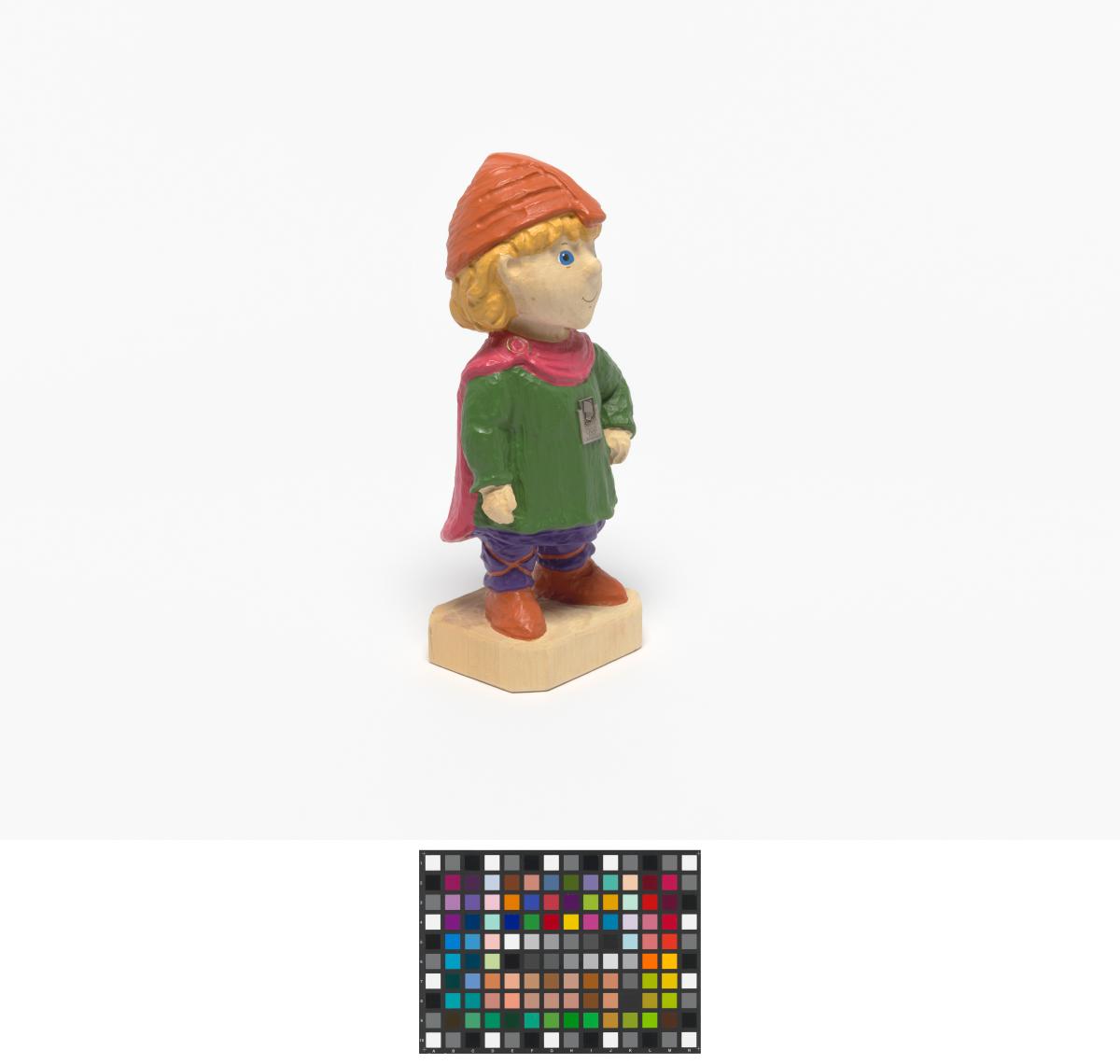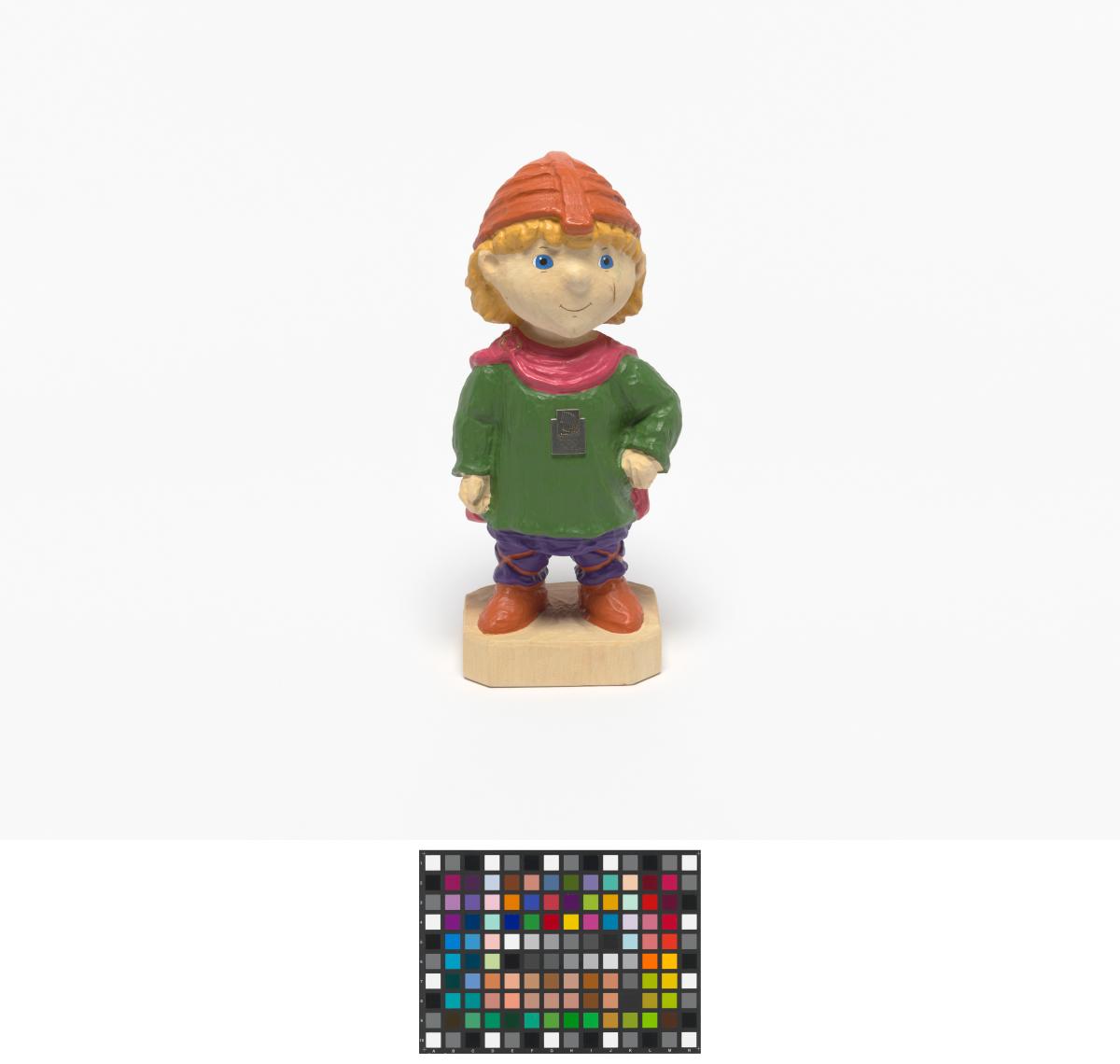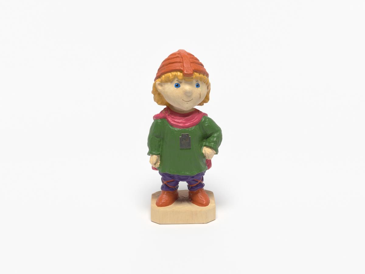 Statuette en bois portant des habits du Moyen-âge avec l'Emblème des Jeux.