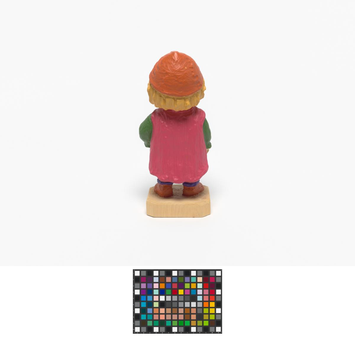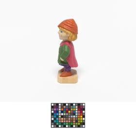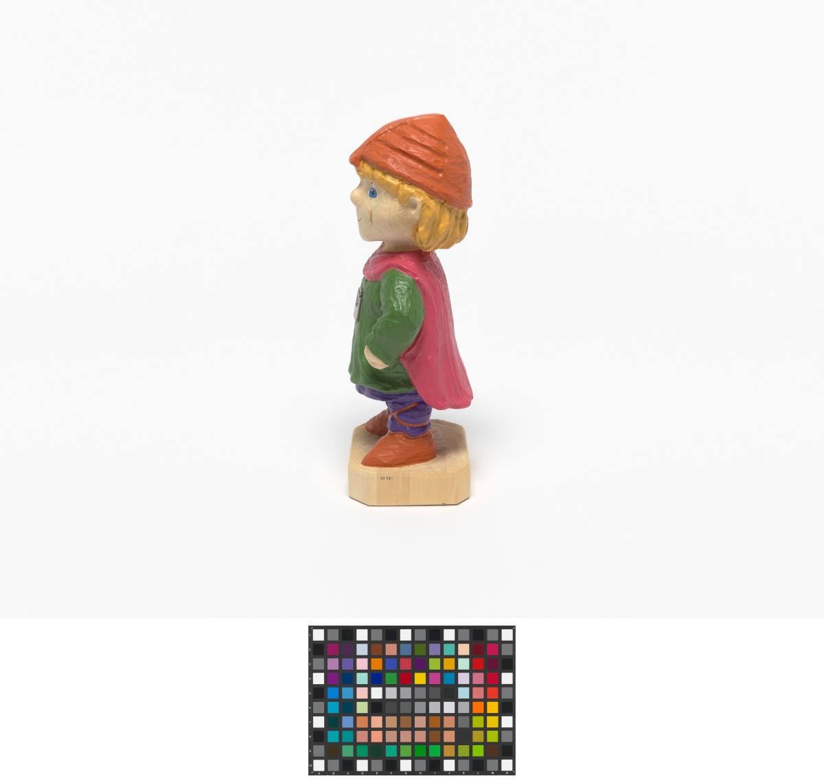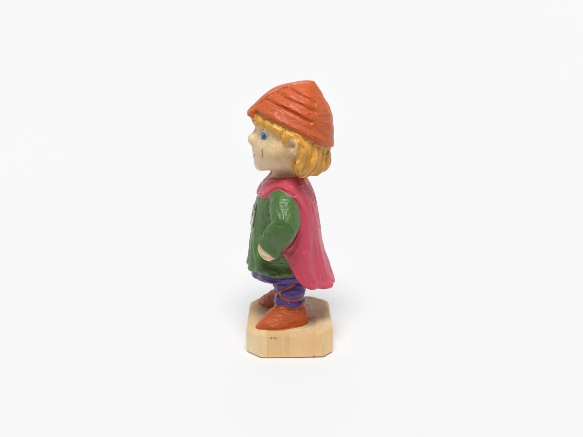 Statuette en bois portant des habits du Moyen-âge avec l'Emblème des Jeux.