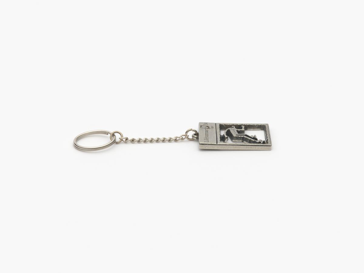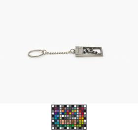 Porte-clés rectangulaire avec le pictogramme du patinage de vitesse. En haut, emblème des Jeux.