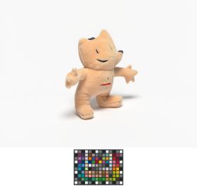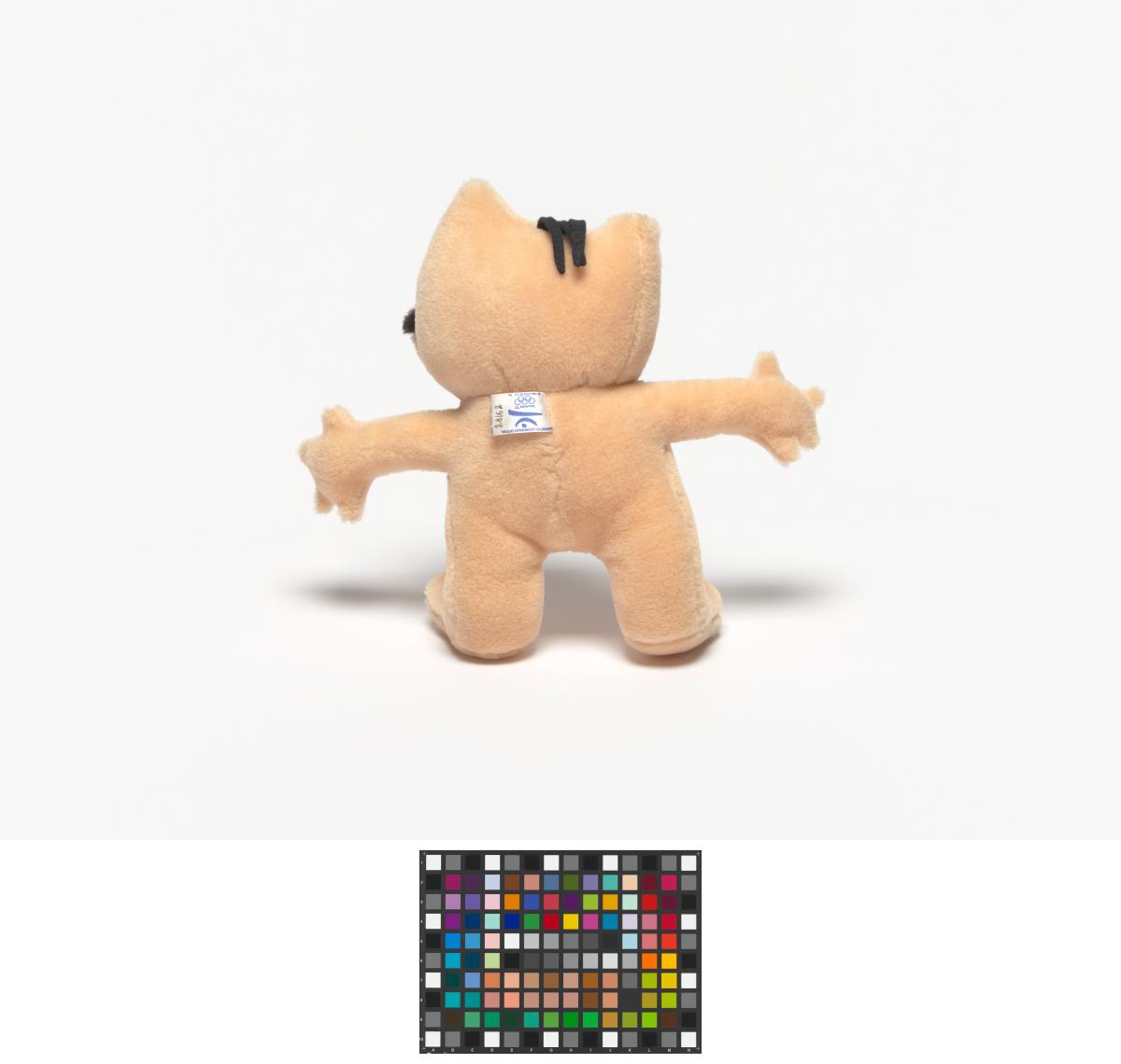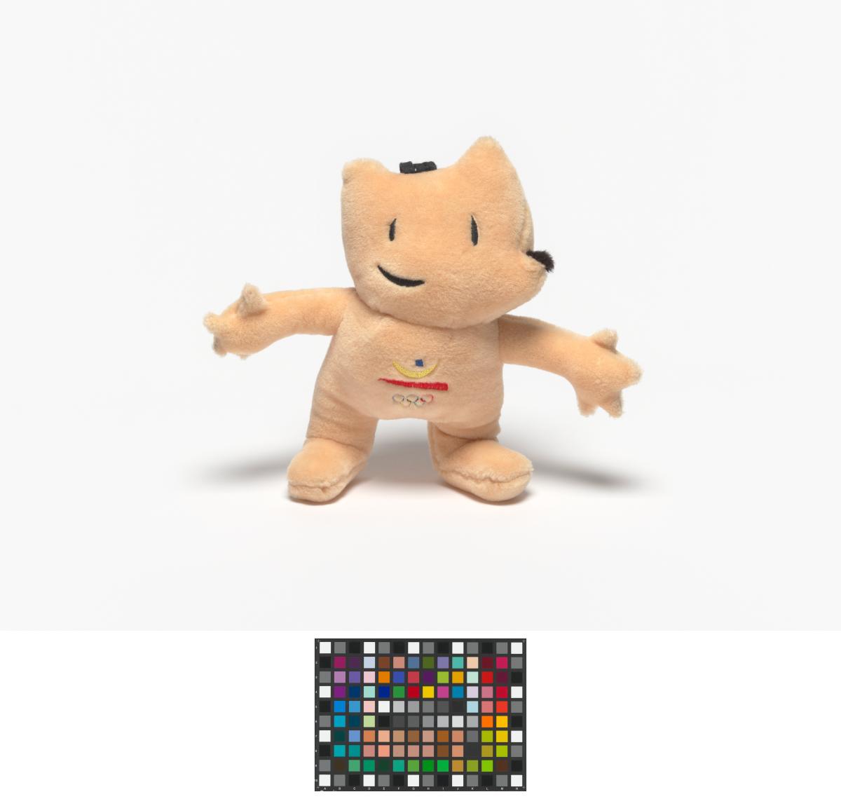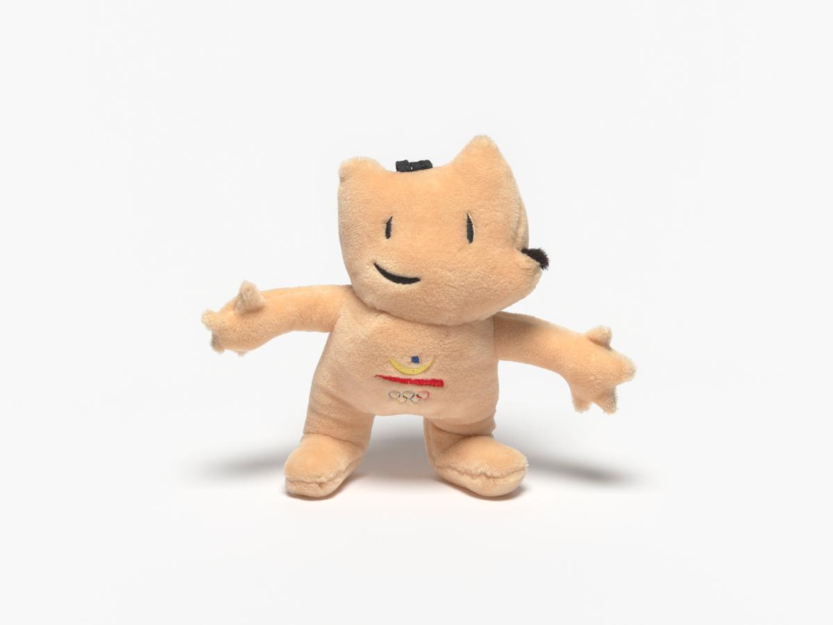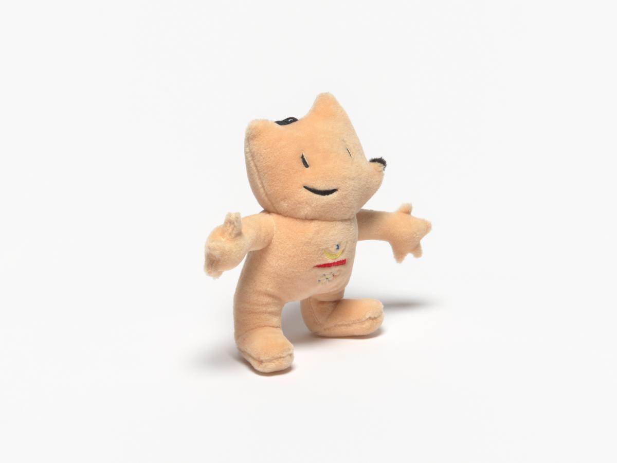 Mascotte en peluche avec l'Emblème des Jeux sur le ventre.