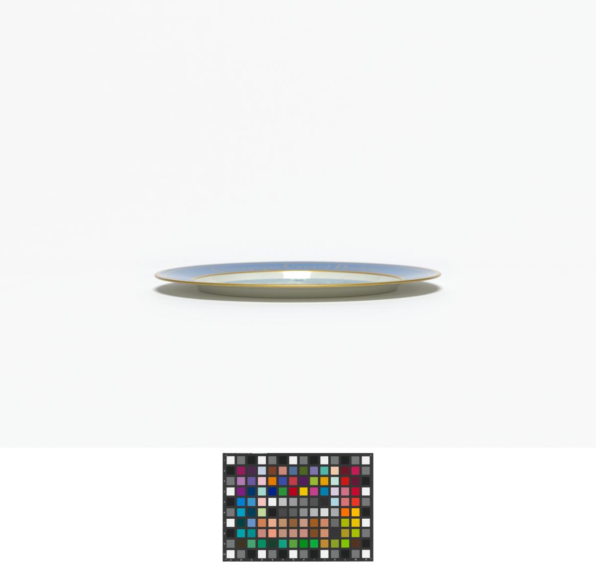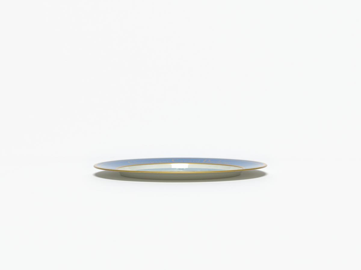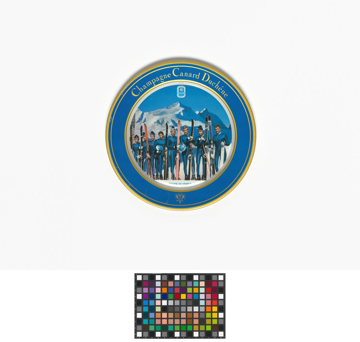 Photographie de l'équipe française de ski alpin devant les montagnes de Grenoble. Légende sur le bord de l'assiette: "Champagne Canard Duchêne" et le logo de la marque.