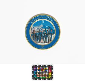 Grenoble 1968, assiette métallique avec la photo de l'équipe française de ski alpin.
