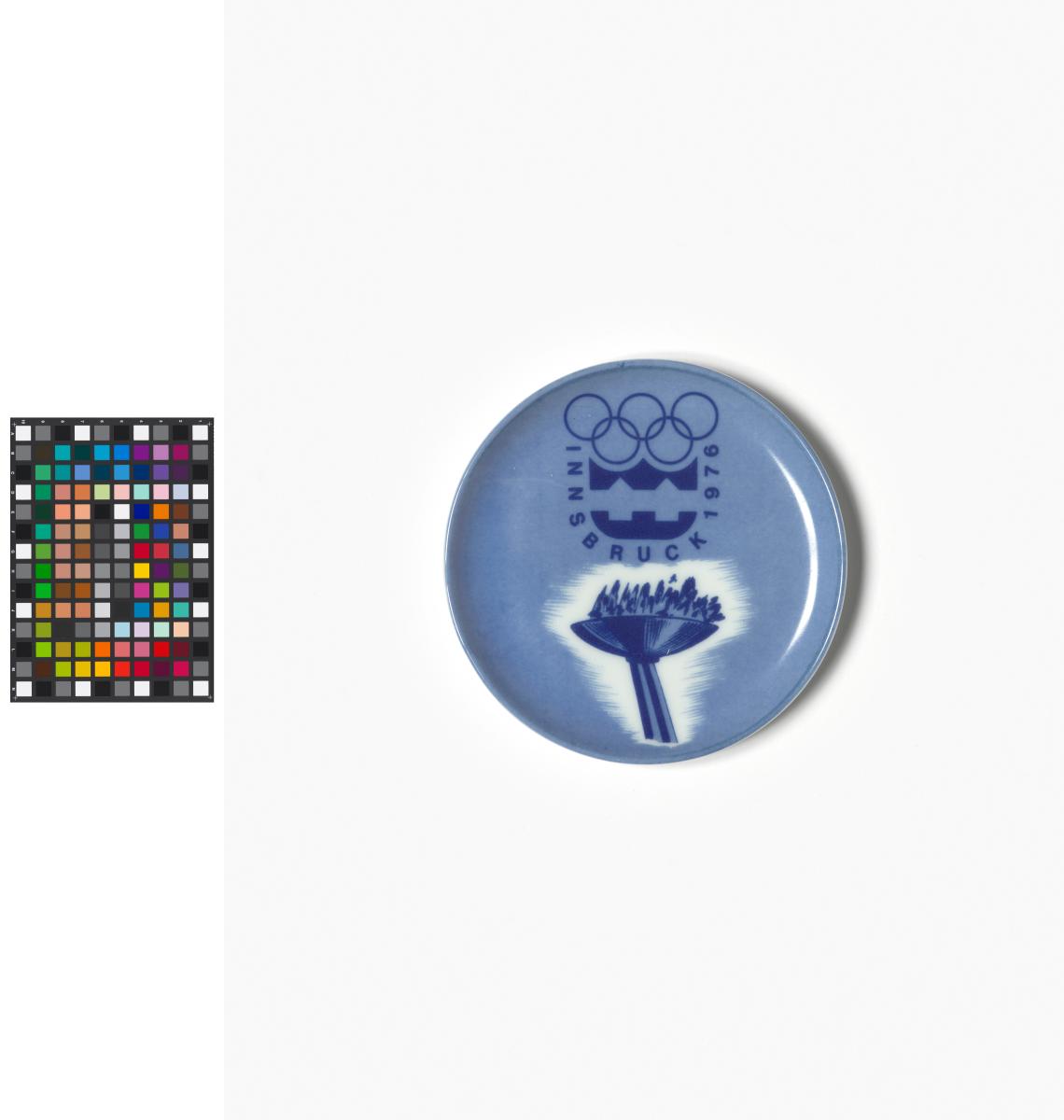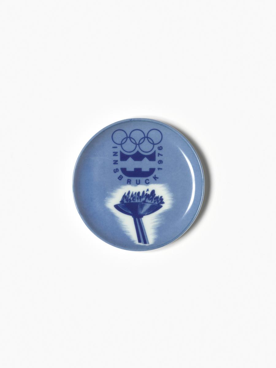 Innsbruck 1976, coupelle avec l'emblème des Jeux et la flamme olympique.