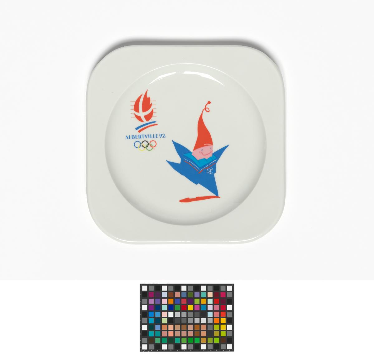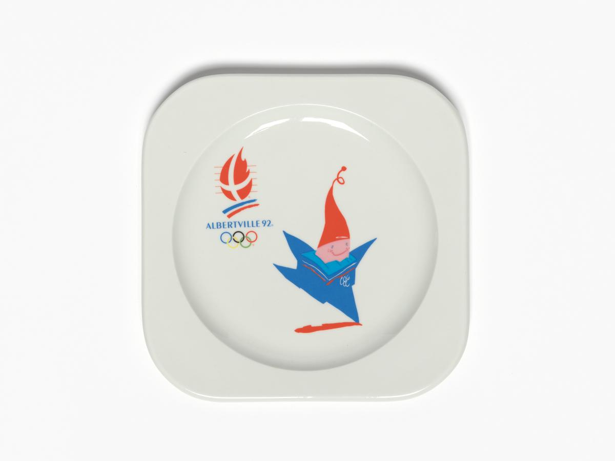 Albertville 1992, assiette carrée avec Magique, la mascotte des Jeux.