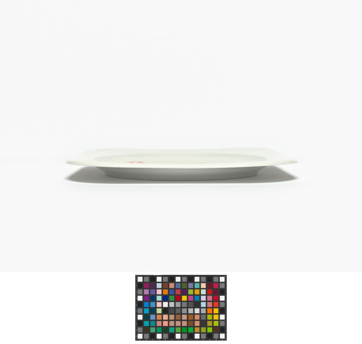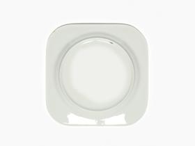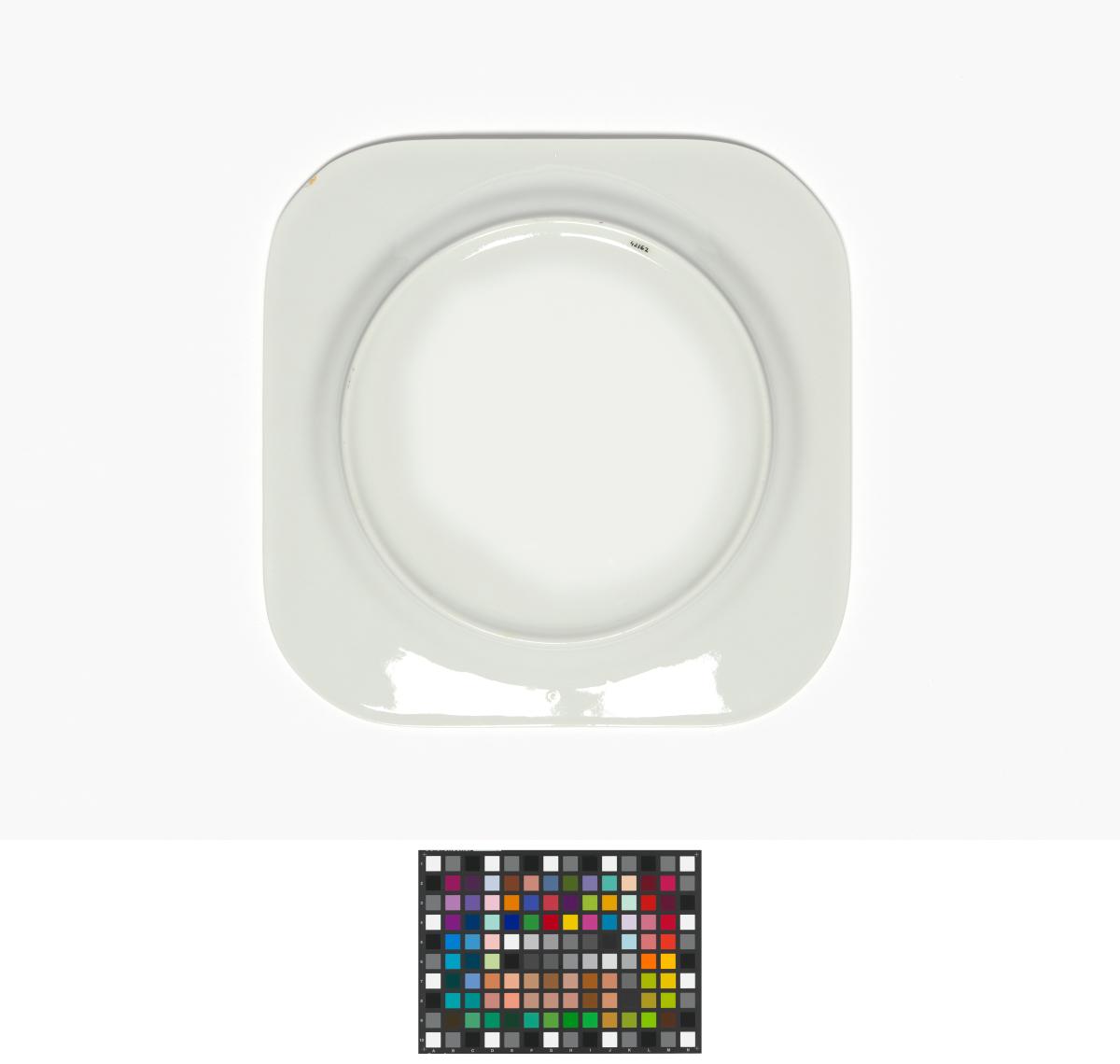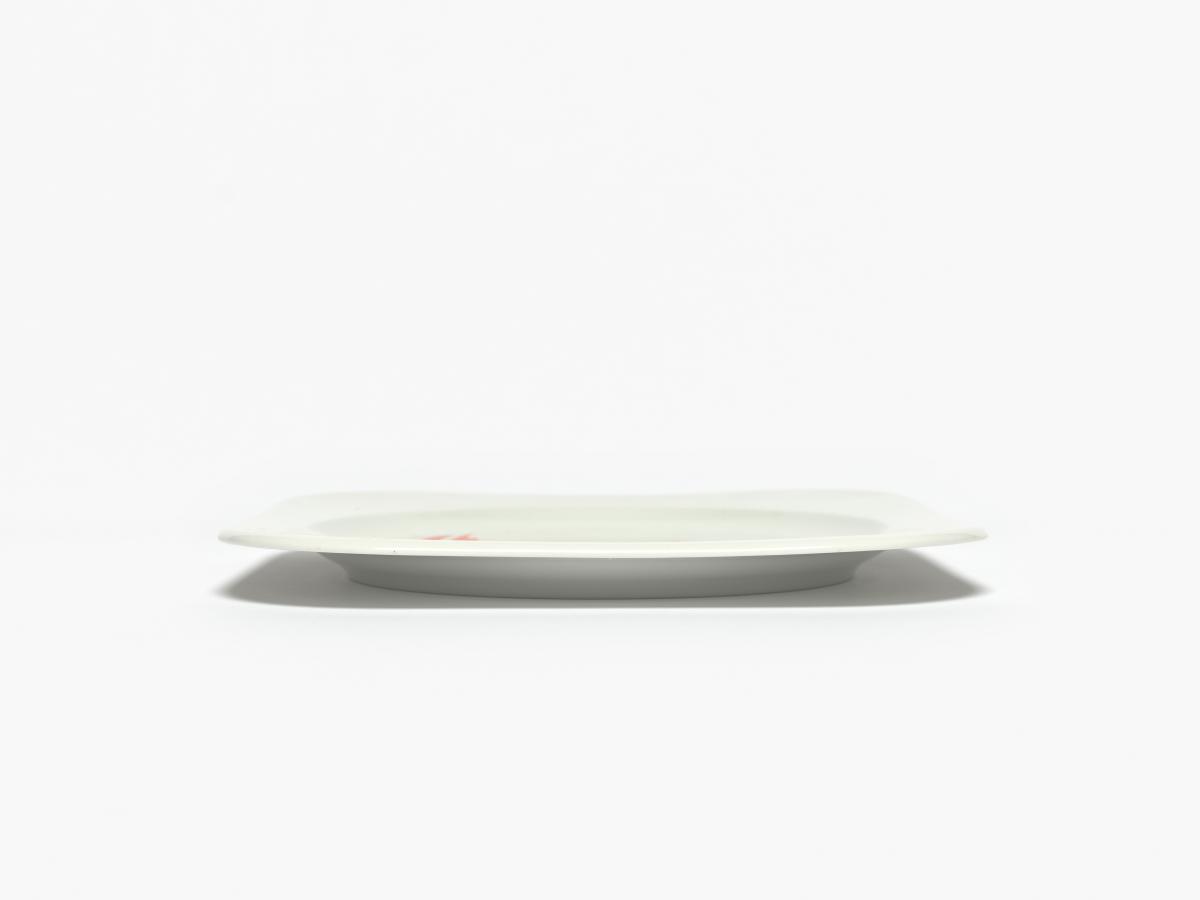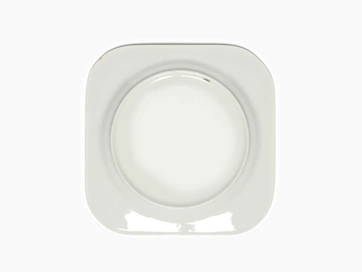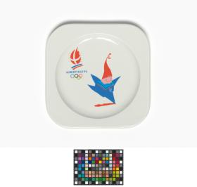 Assiette carrée avec l'emblème des Jeux et Magique, la mascotte des Jeux.