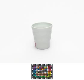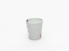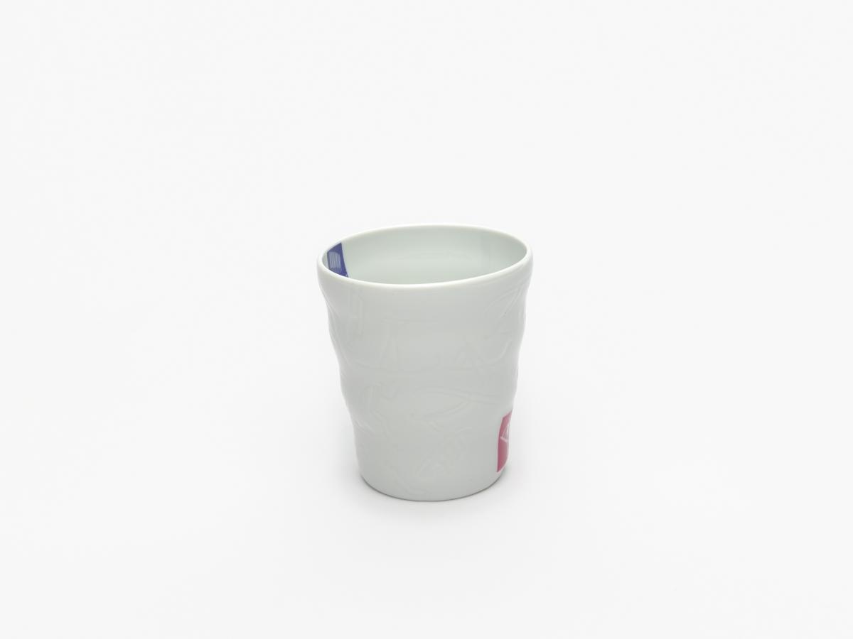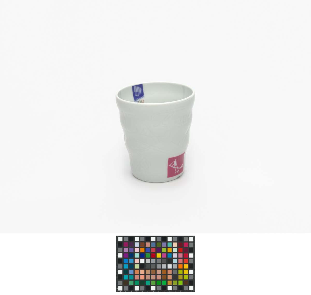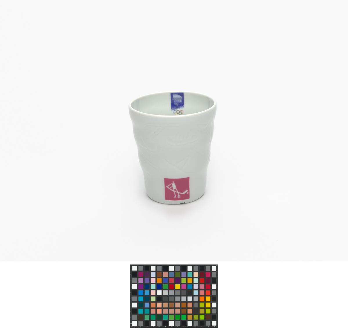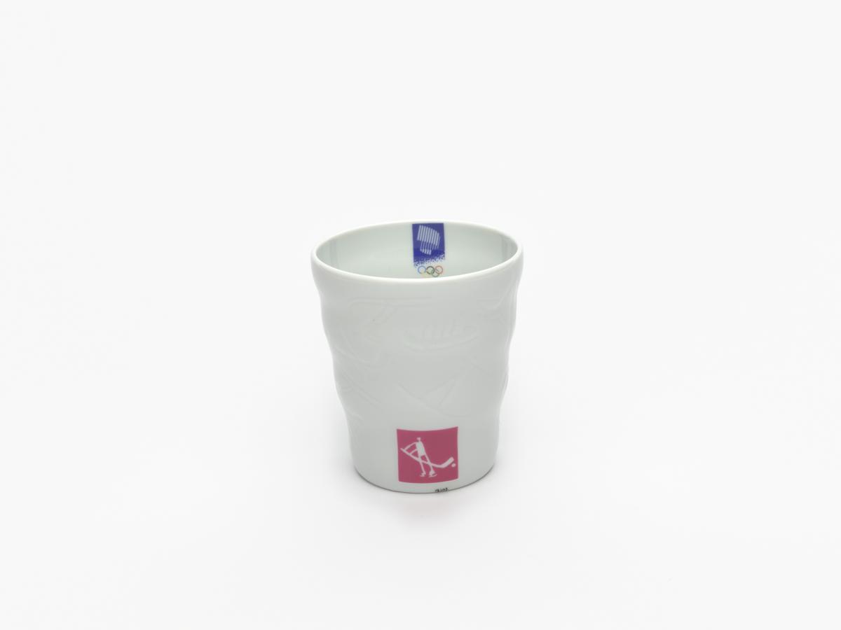 Gobelet en porcelaine blanche ondulé avec le pictogramme du hockey sur glace et l'emblème des Jeux.