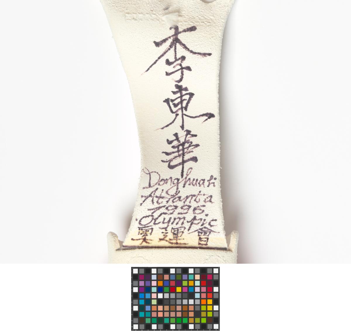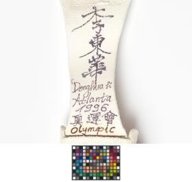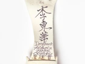 Ce cheval d’arçon a été utilisé par le champion olympique lors de sa préparation pour les Jeux. Sous le cheval d'arçon, vous verrez que Donghua LI a écrit: « WM 1996.4 ; EM 1996.5 ; OS 1996.8 », ce qui correspond à ses trois objectifs de l'année : gagner les Championnats du Monde (Weltmeisterschaften) en avril, les Championnats d'Europe (Europameisterschaften) en mai et les Jeux Olympiques (Olympischen Spielen) en août. Ce qu'il a en effet réussi puisqu'il a gagné la médaille d'argent aux Mondiaux, la médaille d'or aux Européens et aux Jeux.
