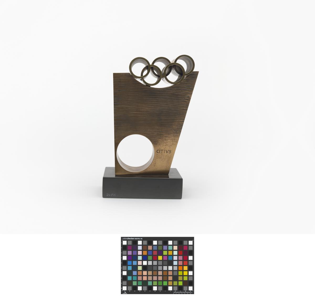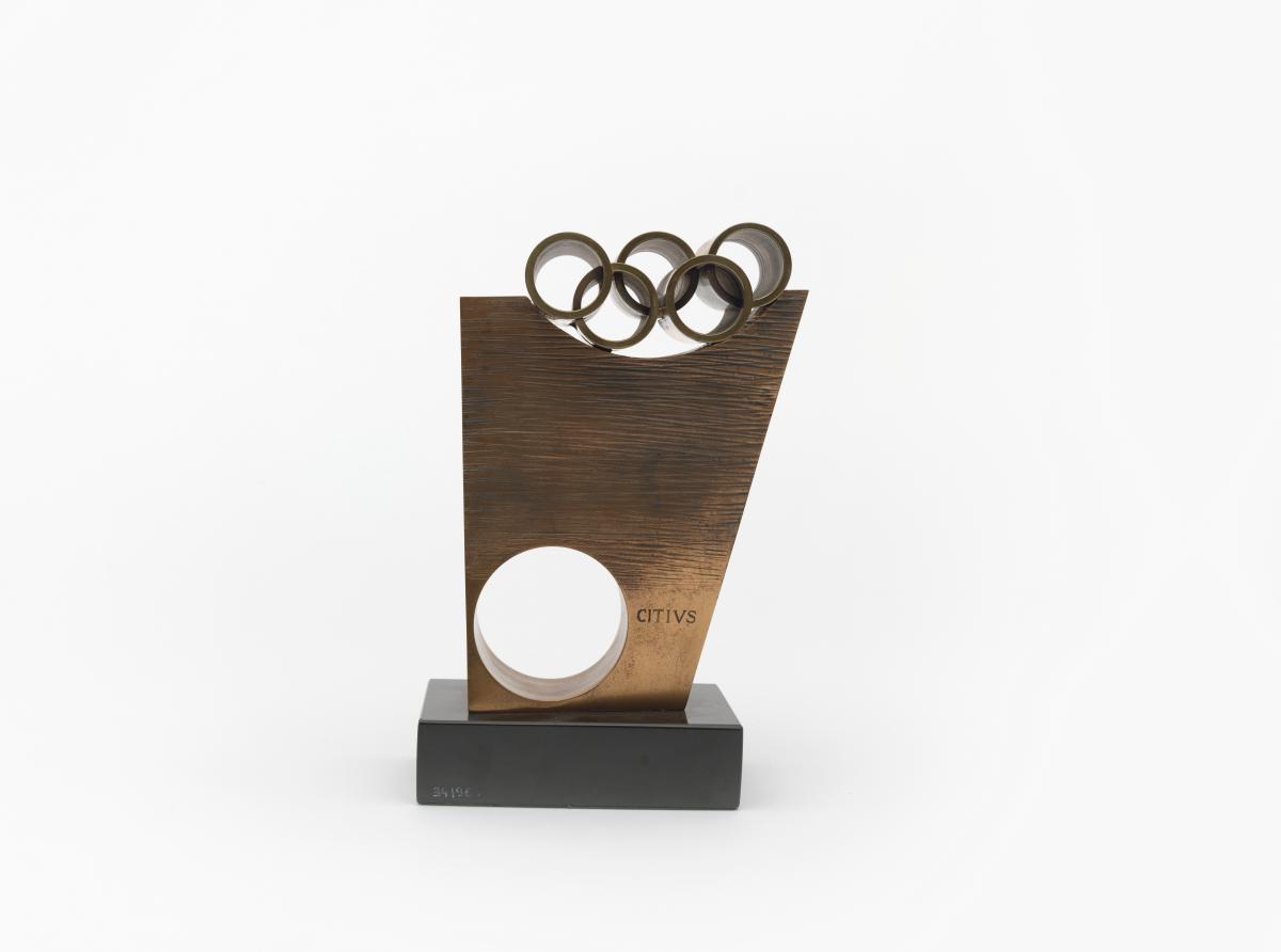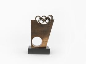 Masse plus ou moins rectangulaire percée d'un trou circulaire et surplombée par les anneaux olympiques. Légende "Citius Altius Fortius".