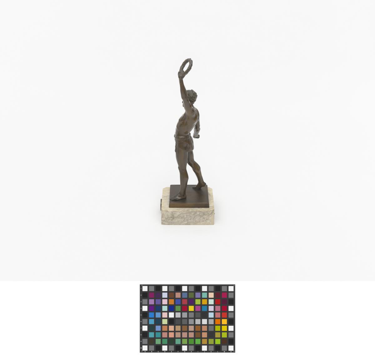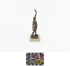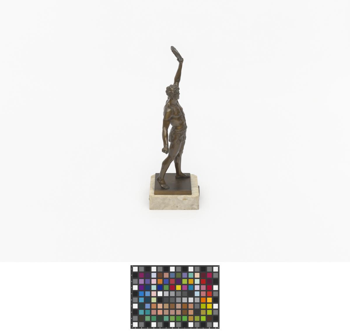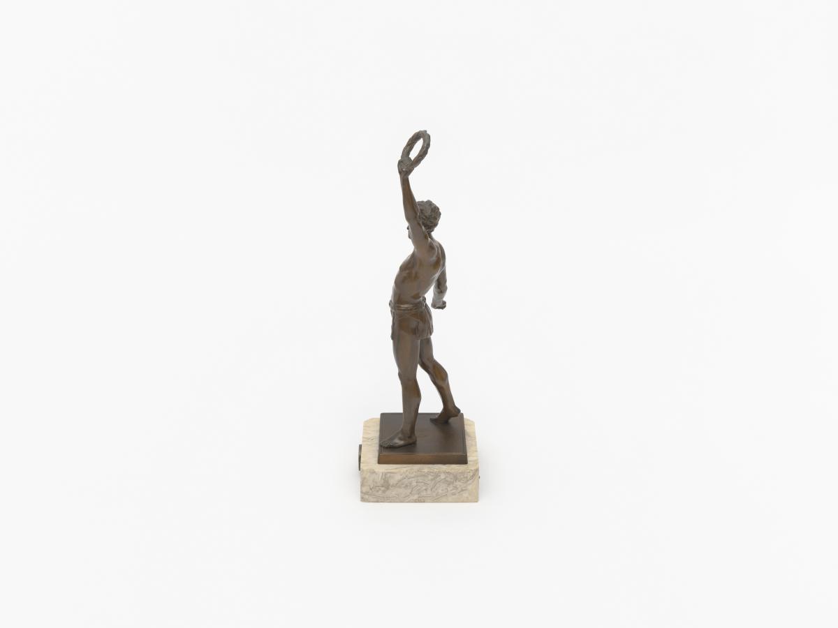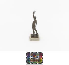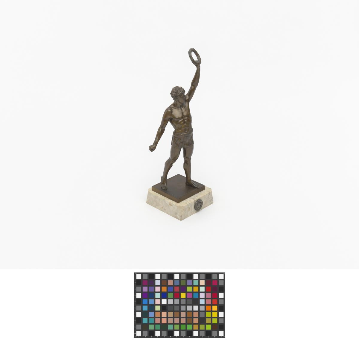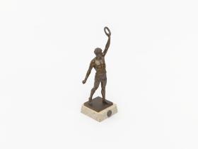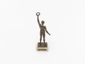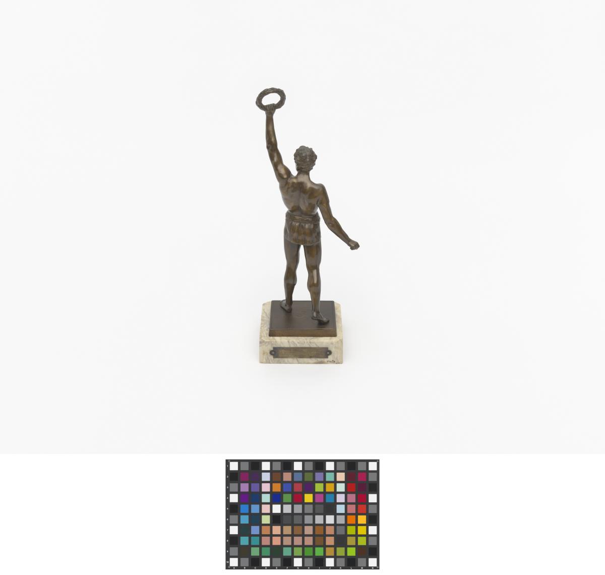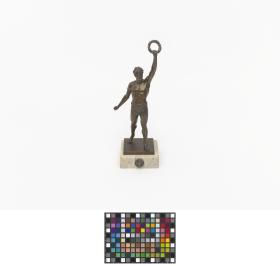 Athlète le bras droit levé, une couronne de lauriers dans sa main. Sur le socle, plaquette avec une croix gammée et la légende : "Für Leistungen in der CH".