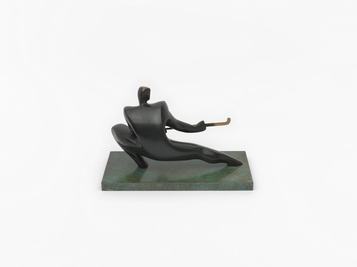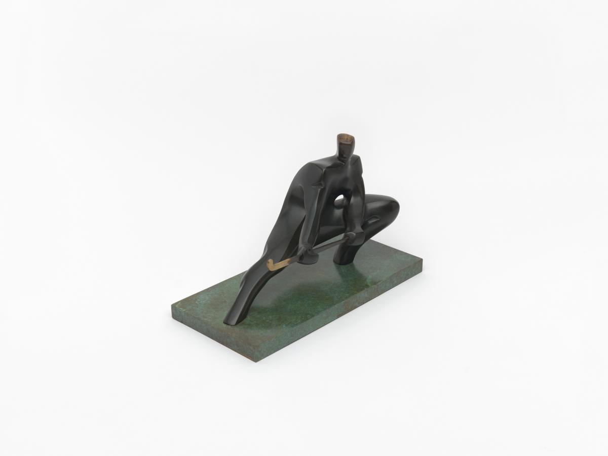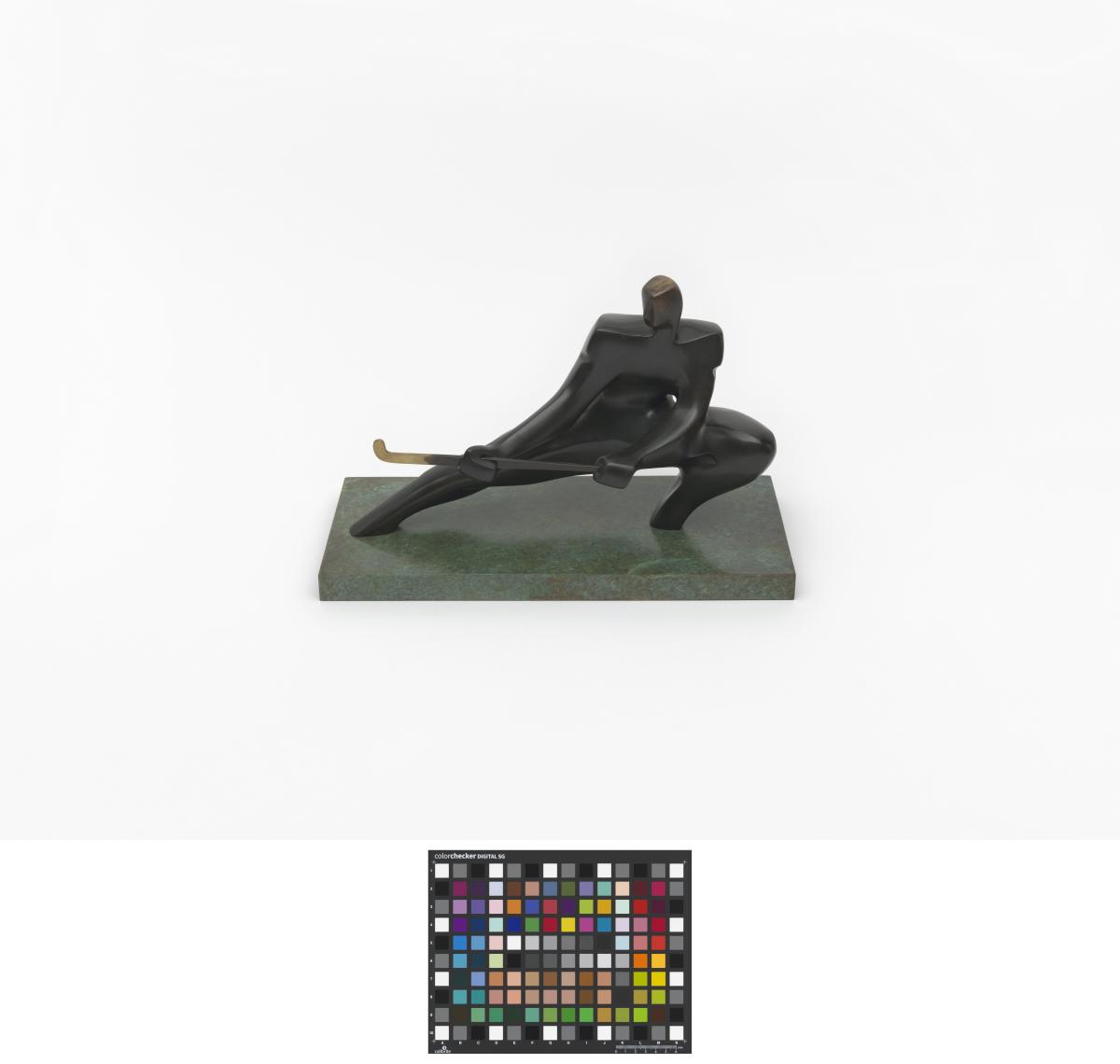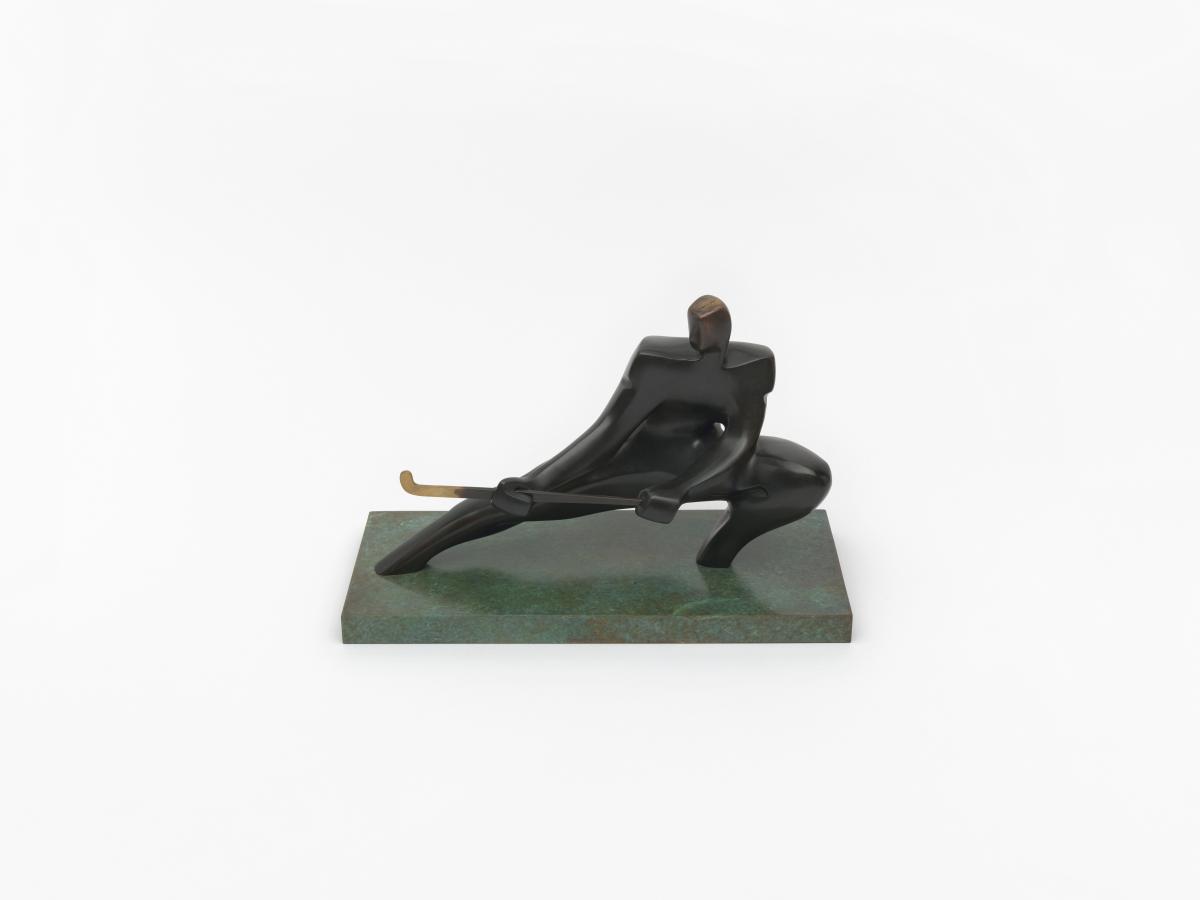 Sur le socle , plaquette avec légende: "Le CIO à la F.I.H. tournoi olympique 1992". Signé: Rosa Serra. Bronze patiné passé à l'or brillant pour les accessoires.