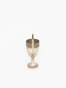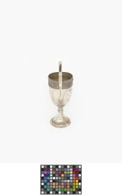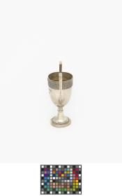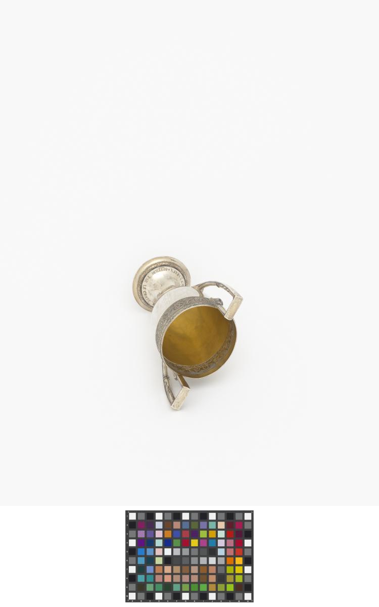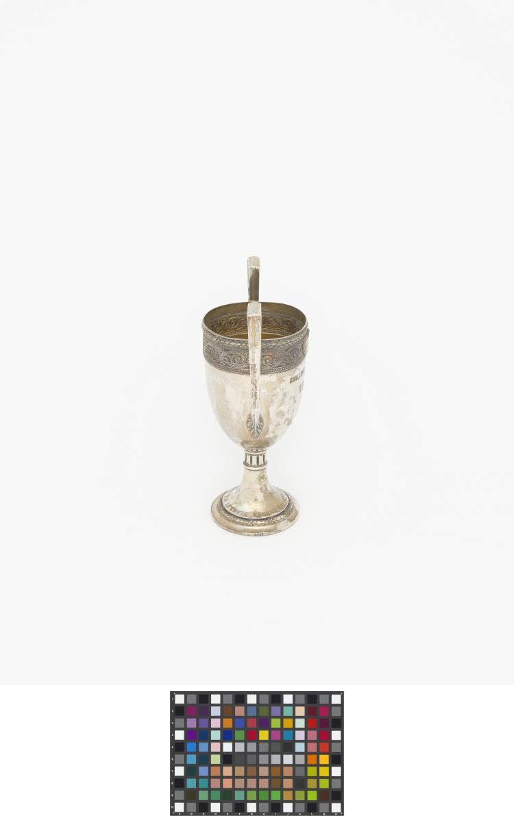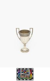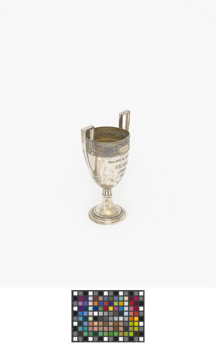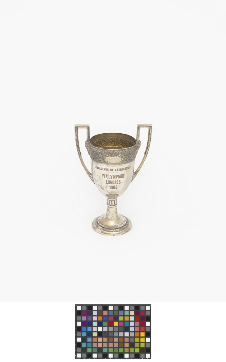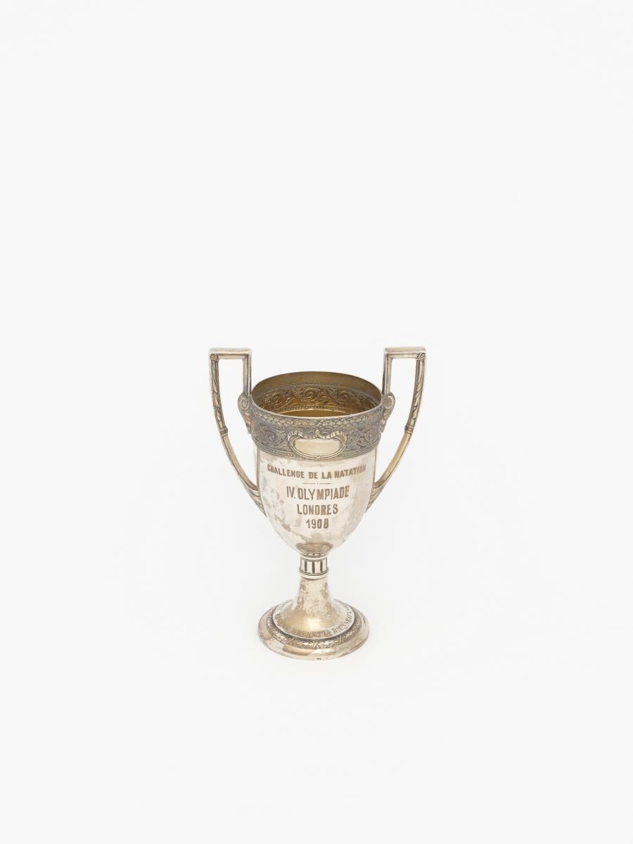 Coupe à deux anses ayant la forme d'un kantharos grec (coupe avec deux anses verticales dont les extrémités s'élèvent souvent au dessus du bord de la coupe) avec les légende : "Challenge de la natation IV Olympiade Londres 1908 ; offerte par le comte Eugène Brunetta d'Usseaux". Poinçon représentant un cheval cabré.