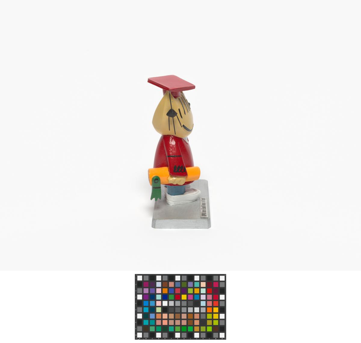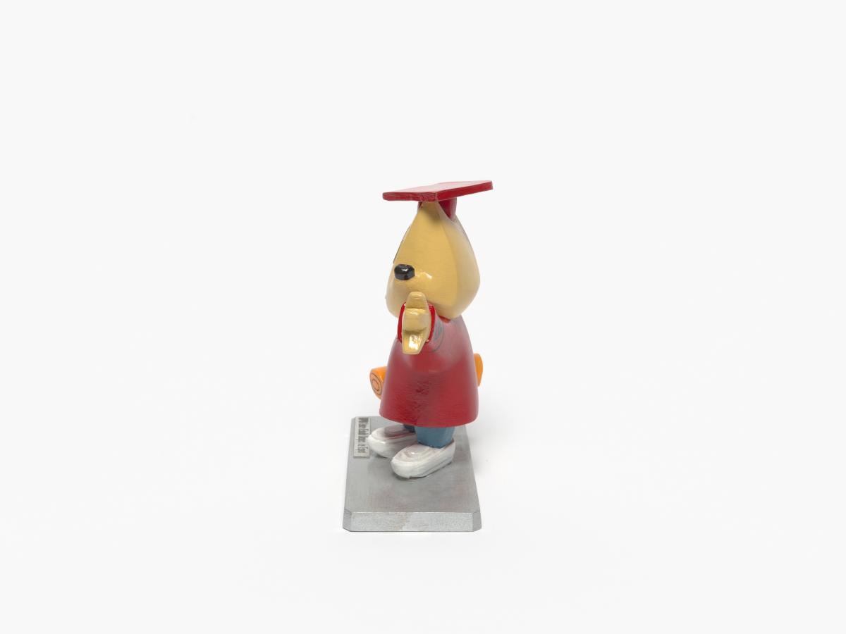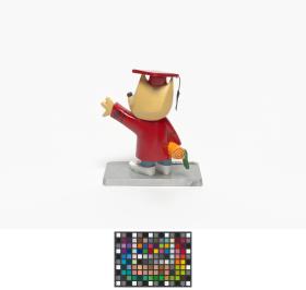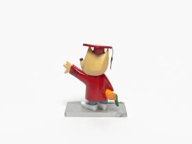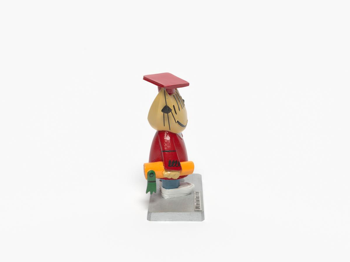 La mascotte CoBi habillée avec le costume de fin d'études.