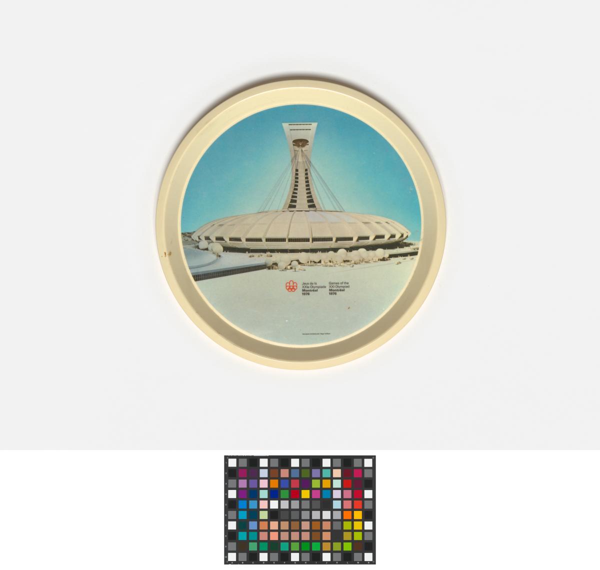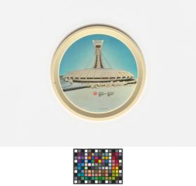 Plateau rond avec une photo de la maquette du stade olympique. Légende: "Jeux de la ; XXIe Olympiade ; Montréal ; 1976".