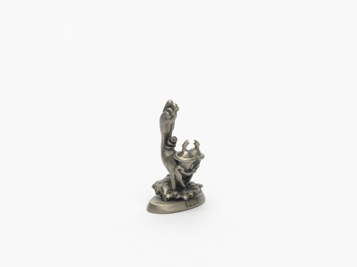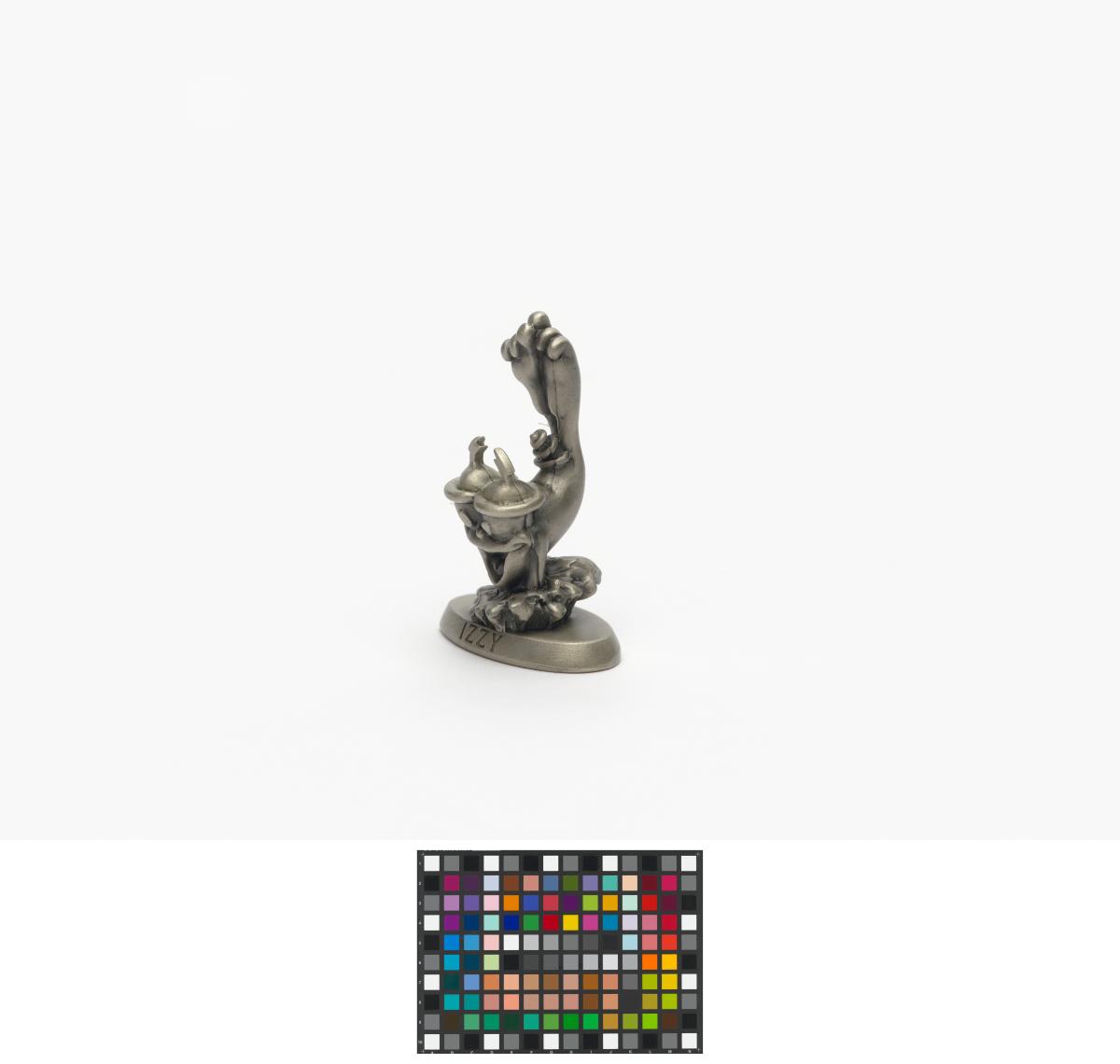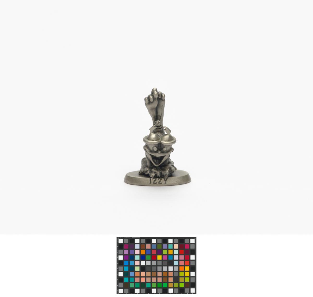 Mascotte sur une base avec la légende: "Izzy".