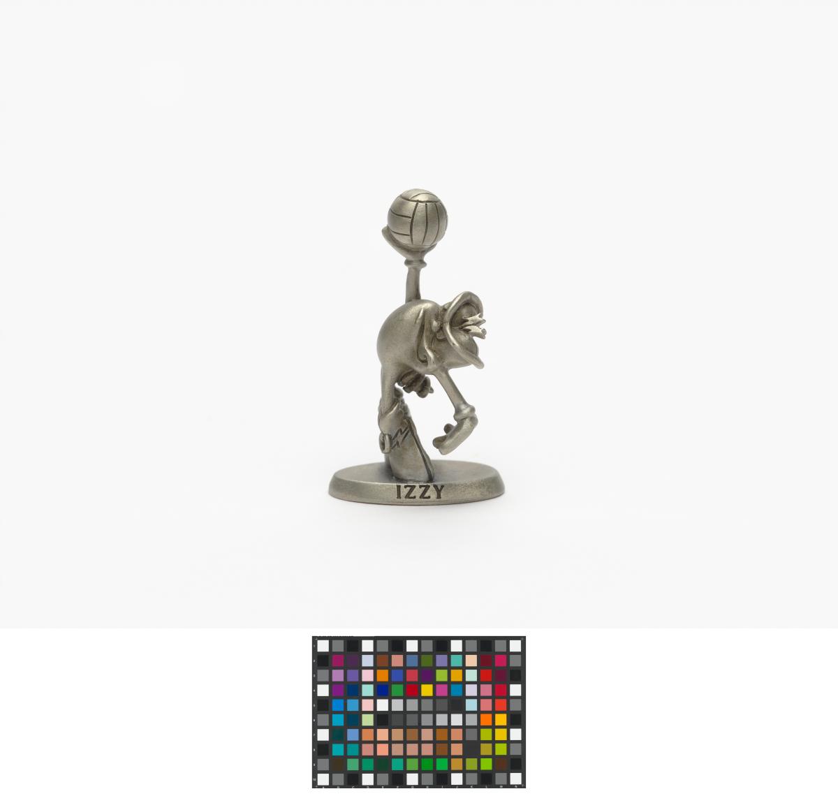 Mascotte sur une base avec la légende: "Izzy".
