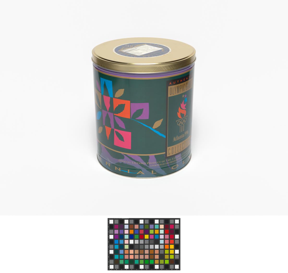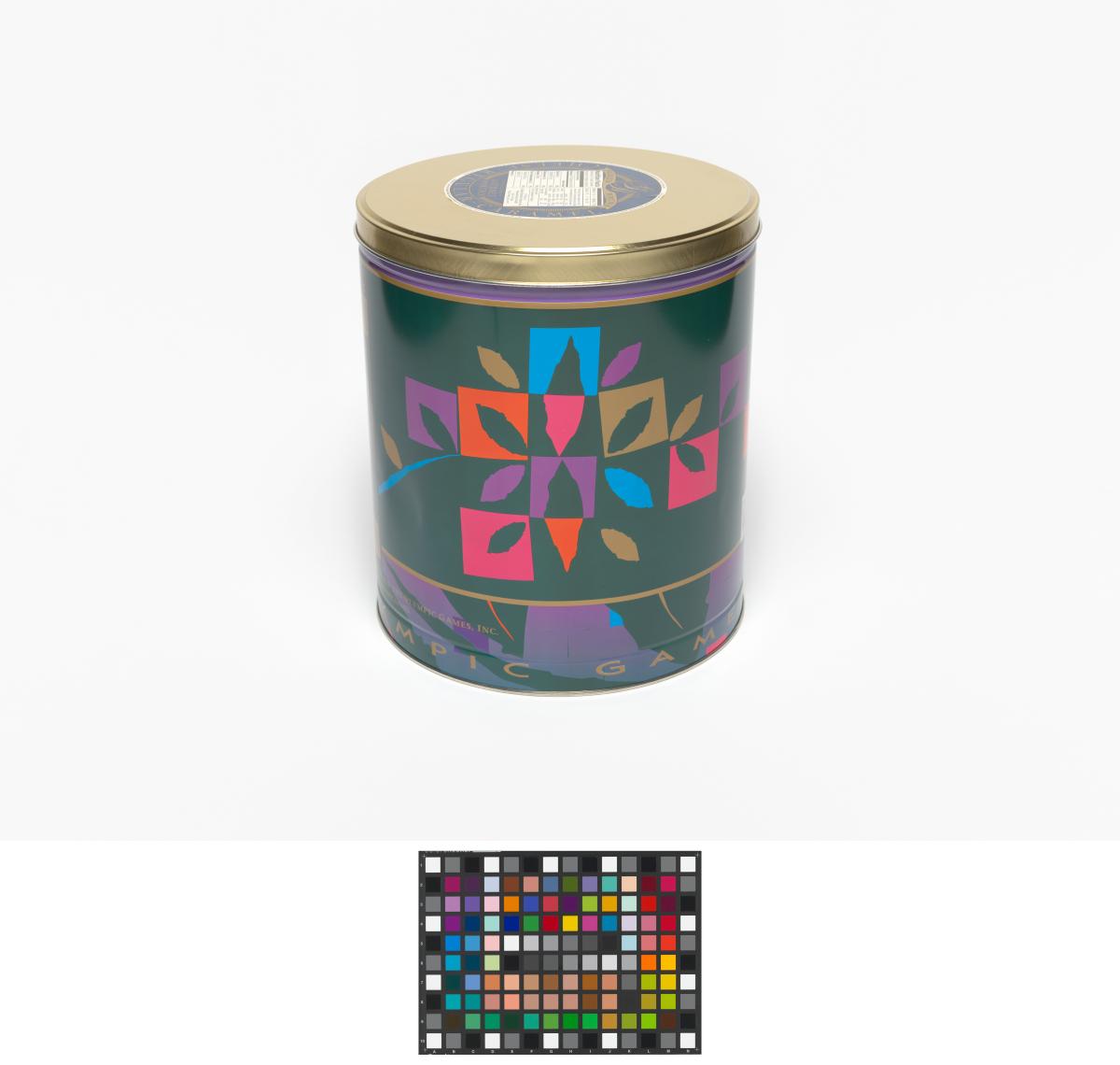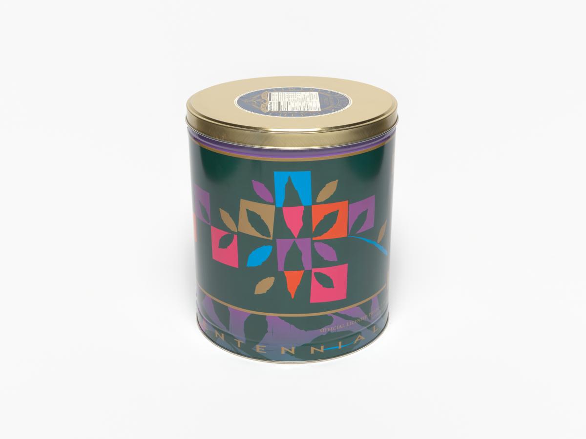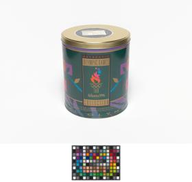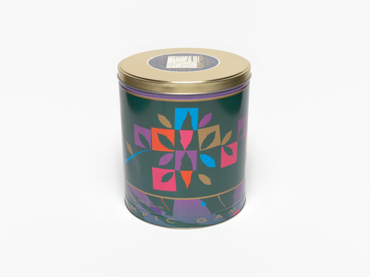 Boîte de forme cylindrique avec l'emblème des Jeux et le logo du Centenaire.