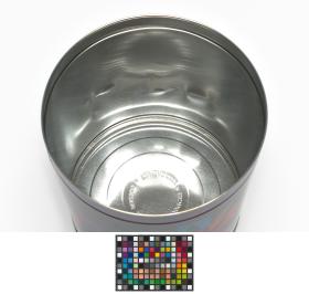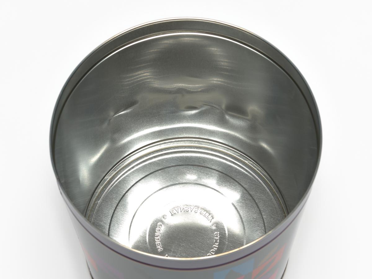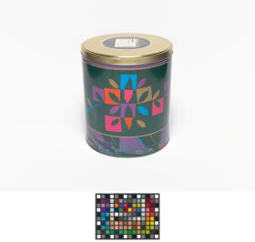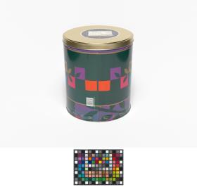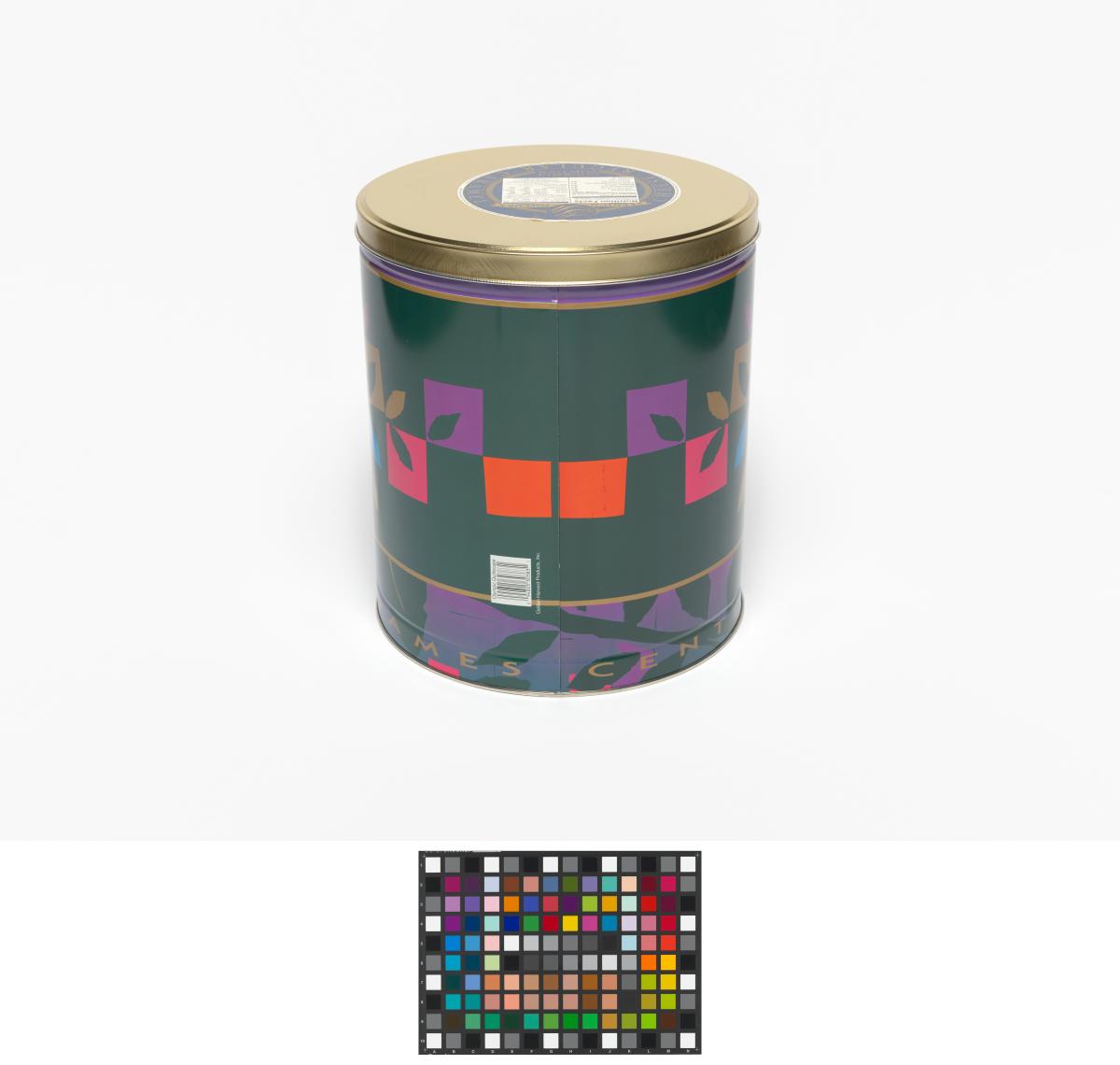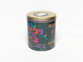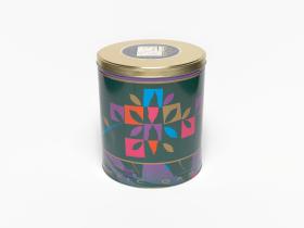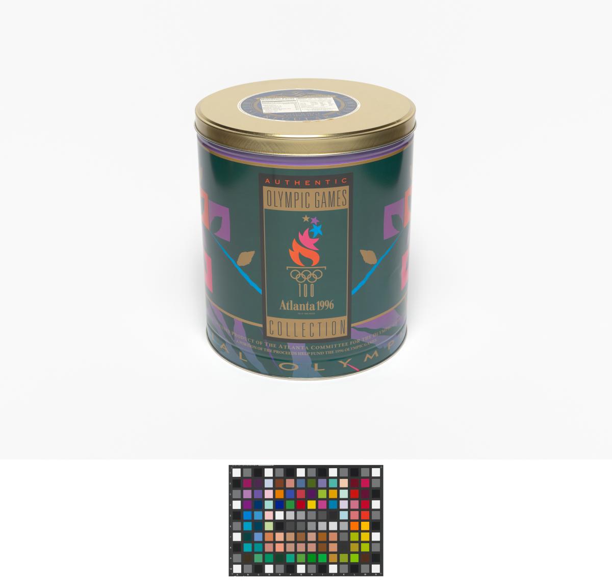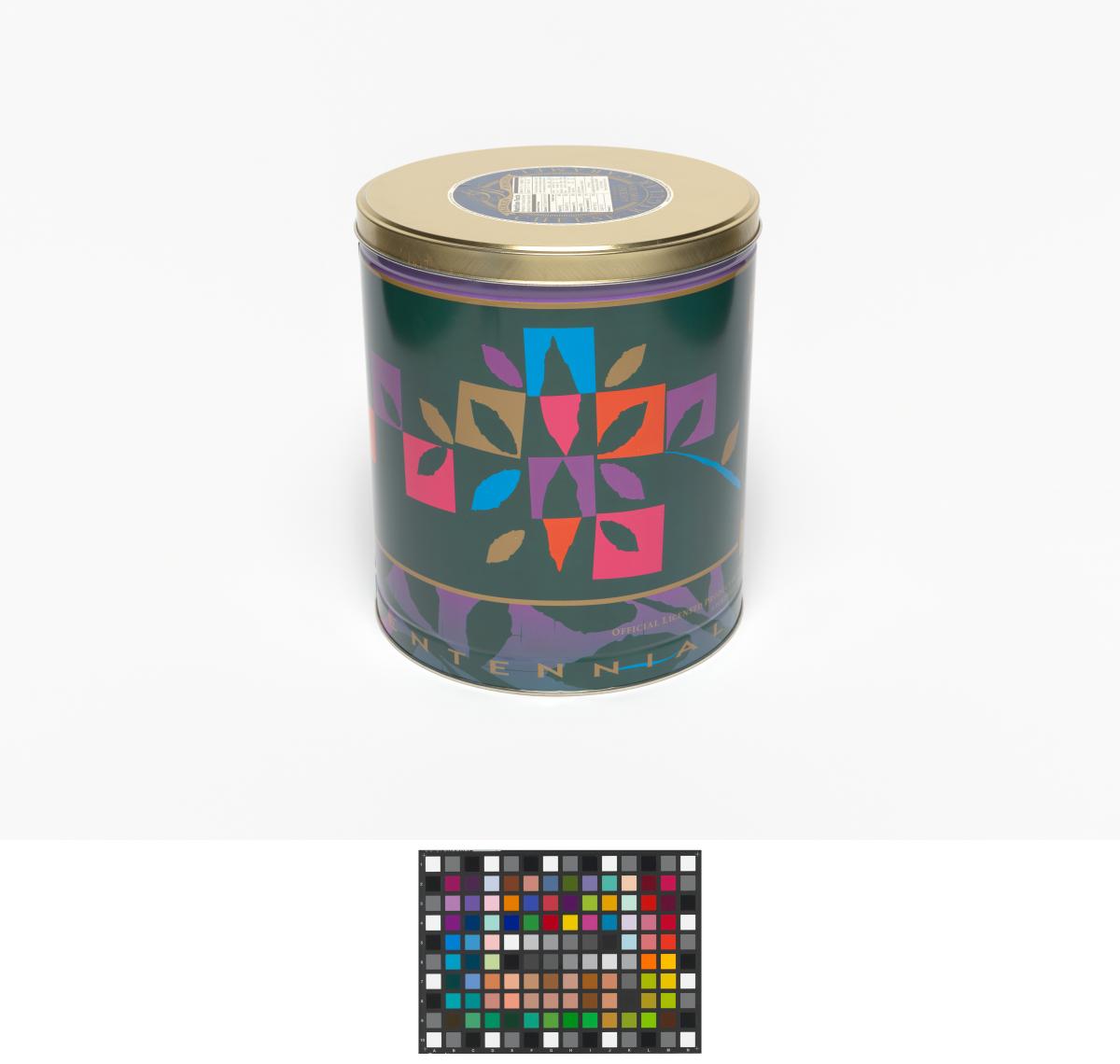 Boîte de forme cylindrique avec l'emblème des Jeux et le logo du Centenaire.