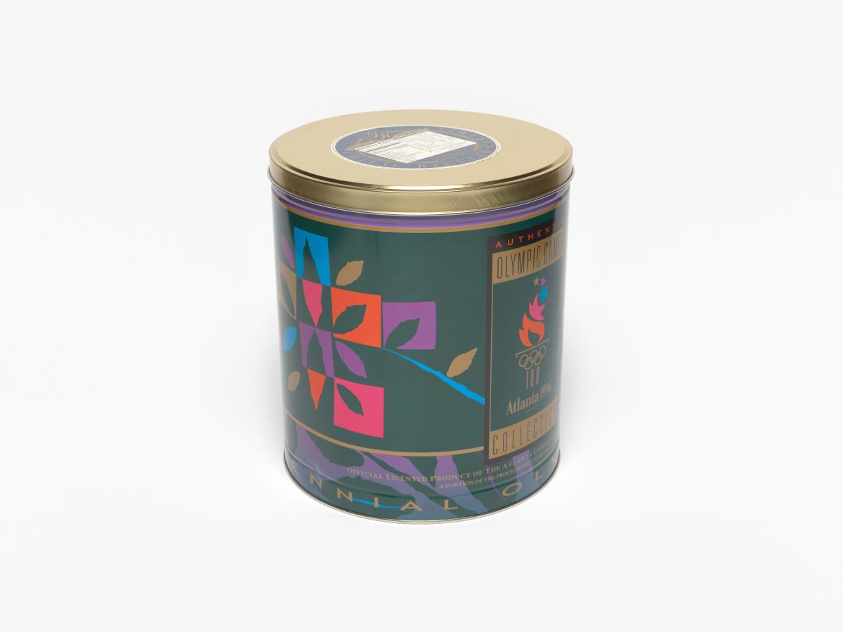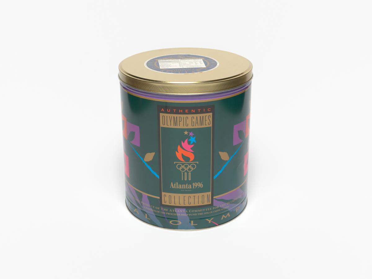Atlanta 1996, boîte à popcorn avec l'emblème des Jeux et le logo Centenaire.