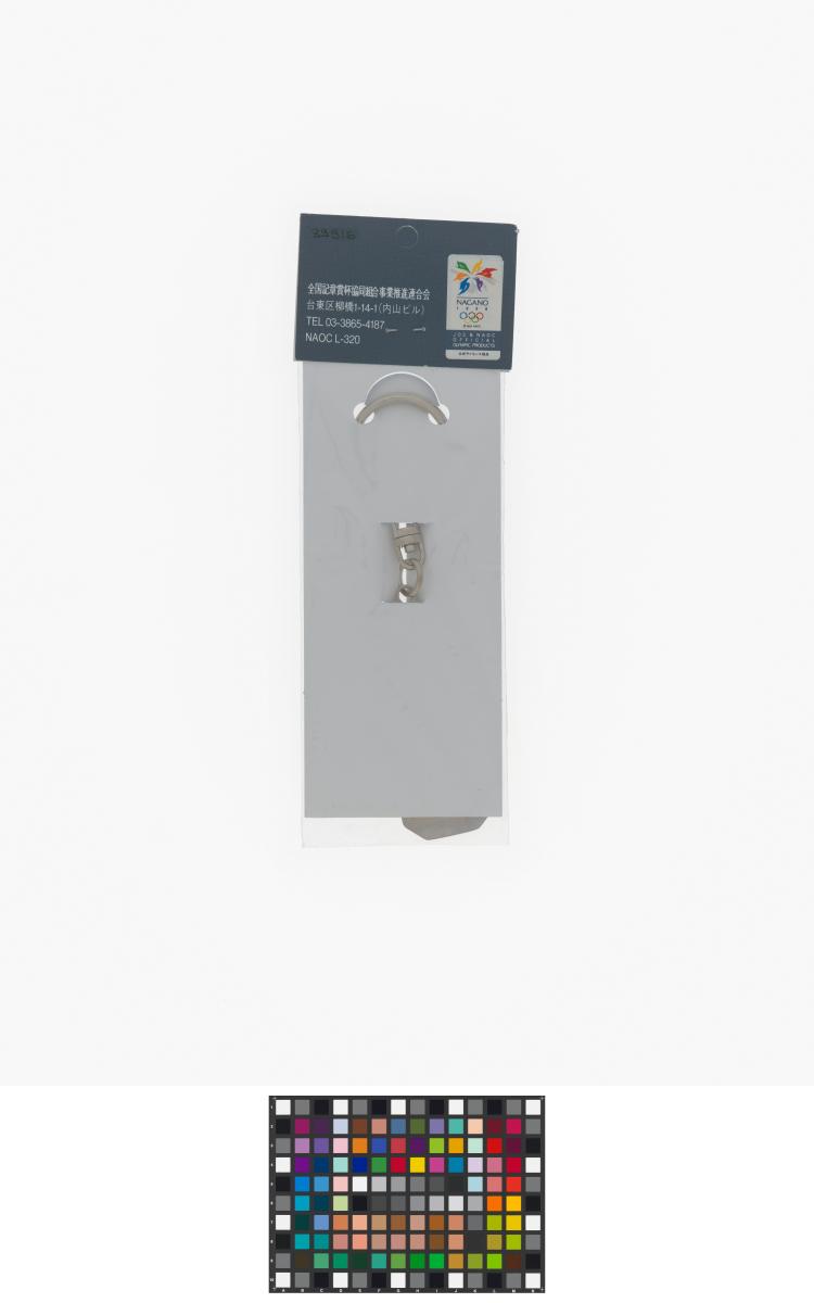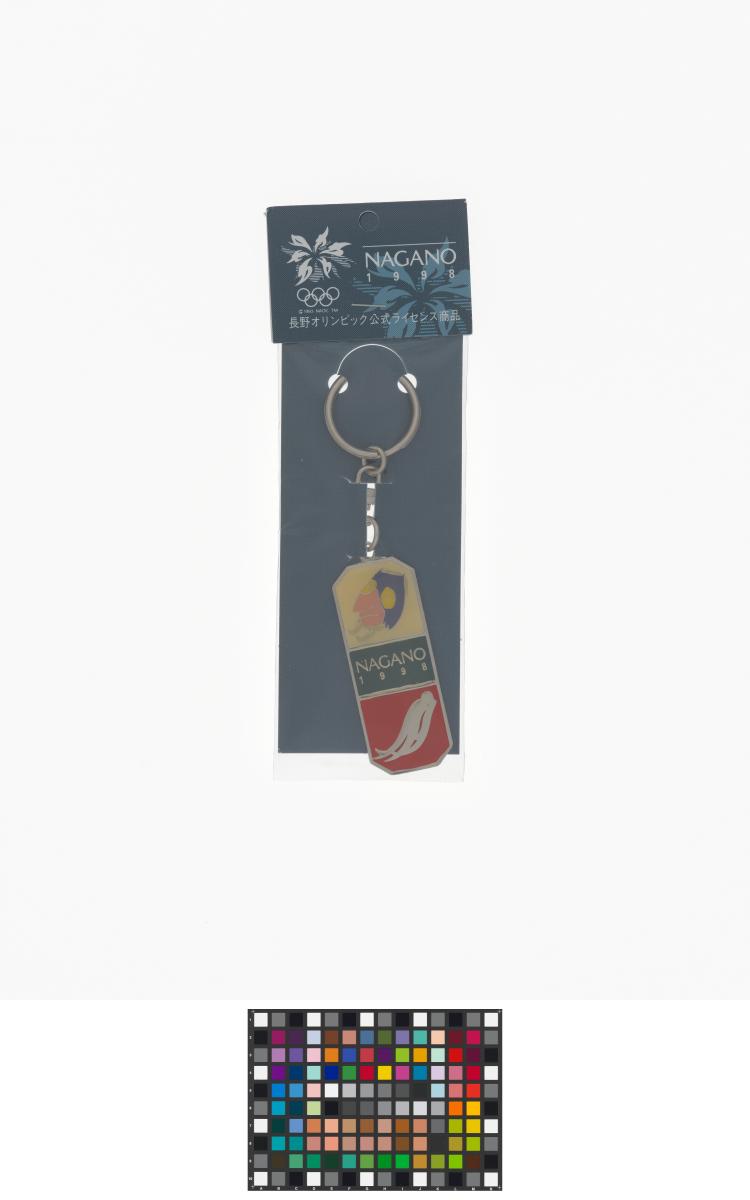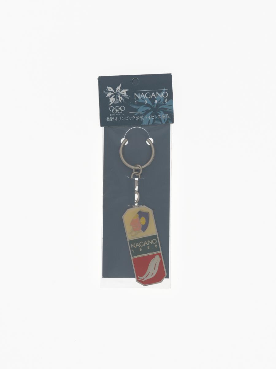 Nagano 1998, porte-clés avec Sukki, une des mascottes des Jeux, faisant de la luge et le pictogramme de la luge.