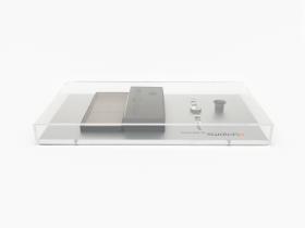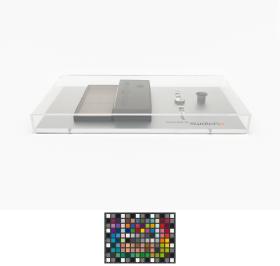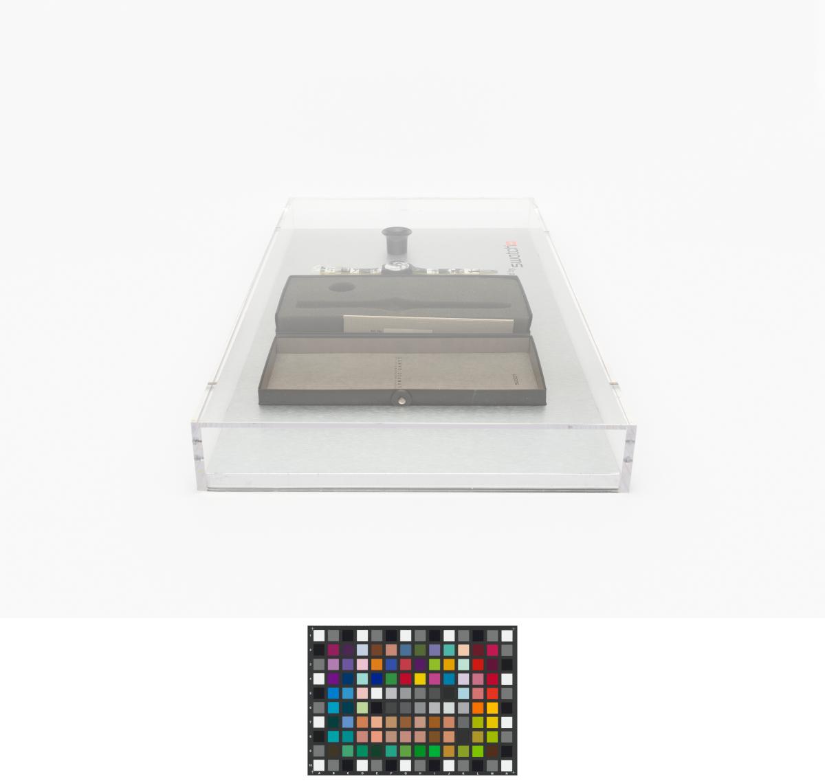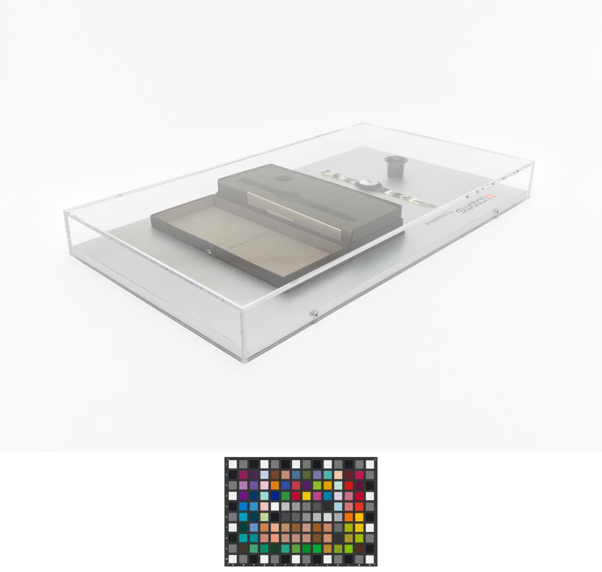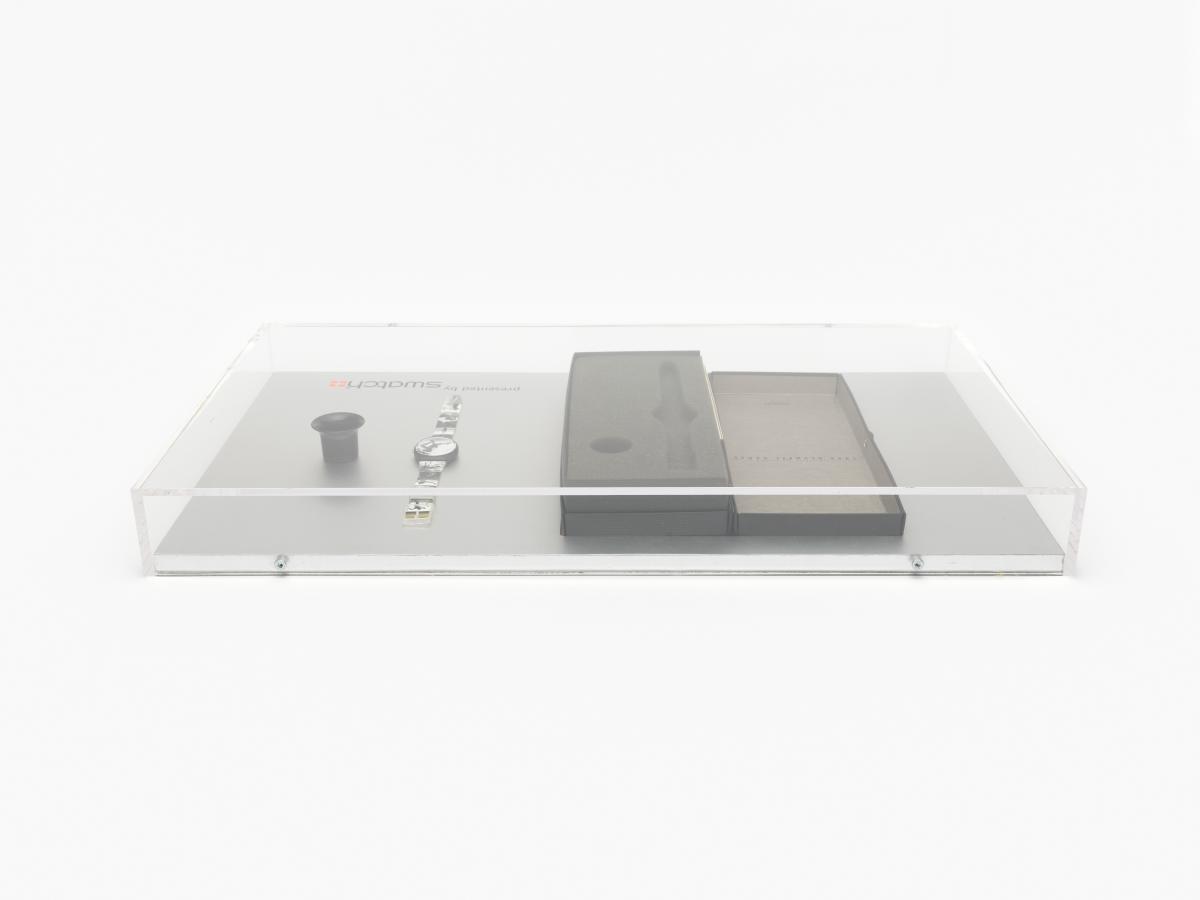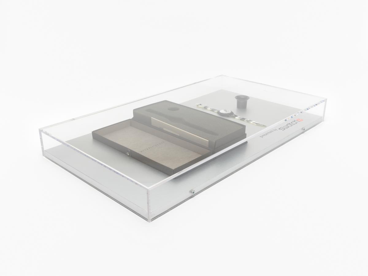 Montre avec des photos sur le bracelet et le cadran, écrin et loupe d'horloger.
