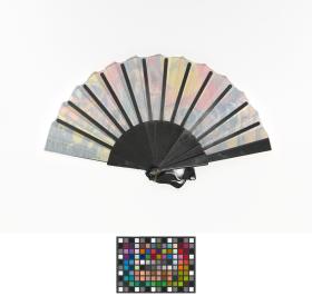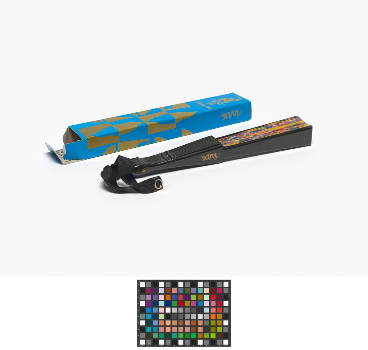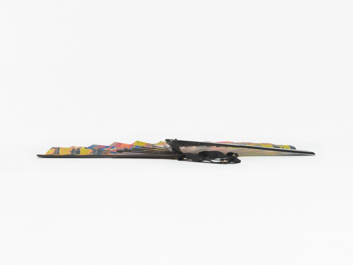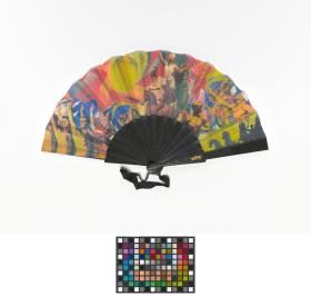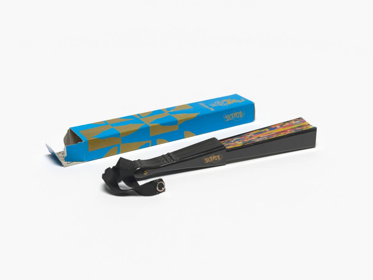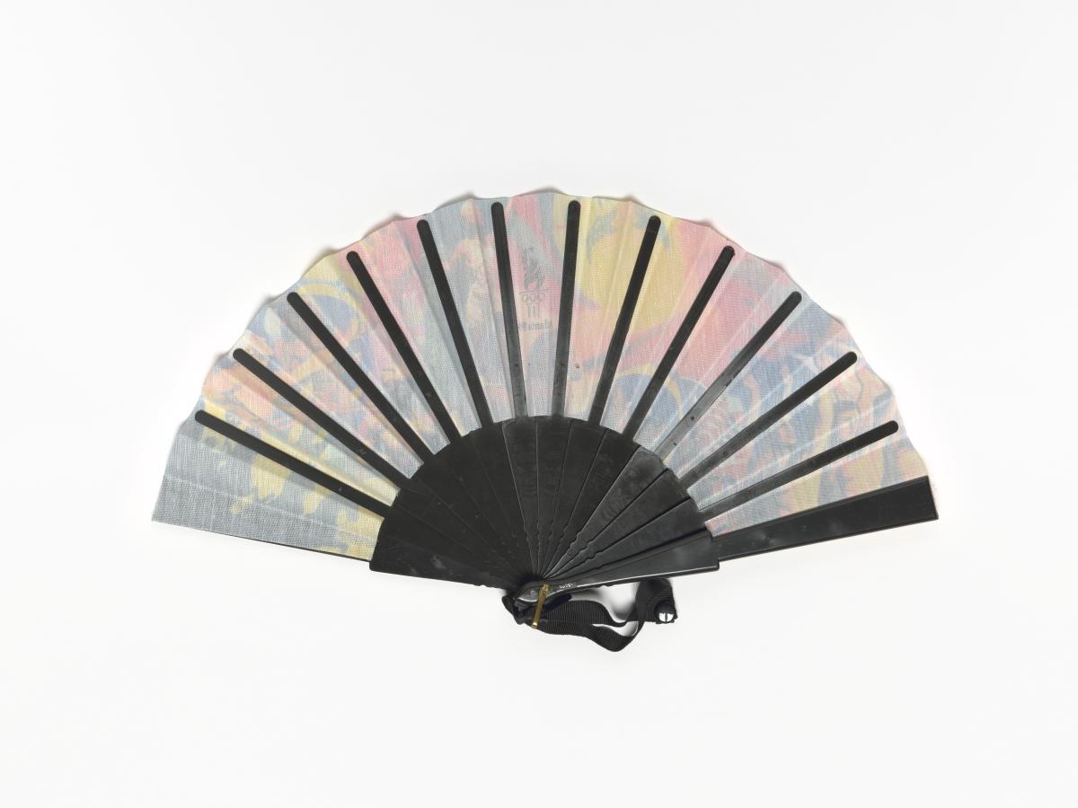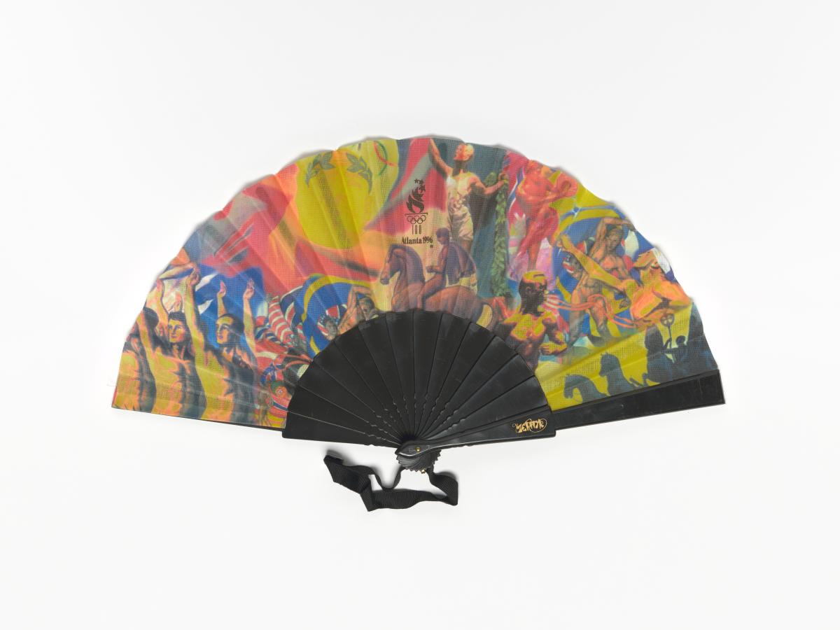 Atlanta 1996, éventail avec l'emblème des Jeux et des portions de plusieurs affiches officielles.