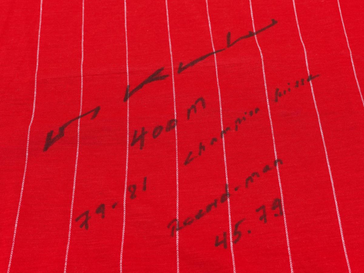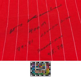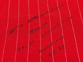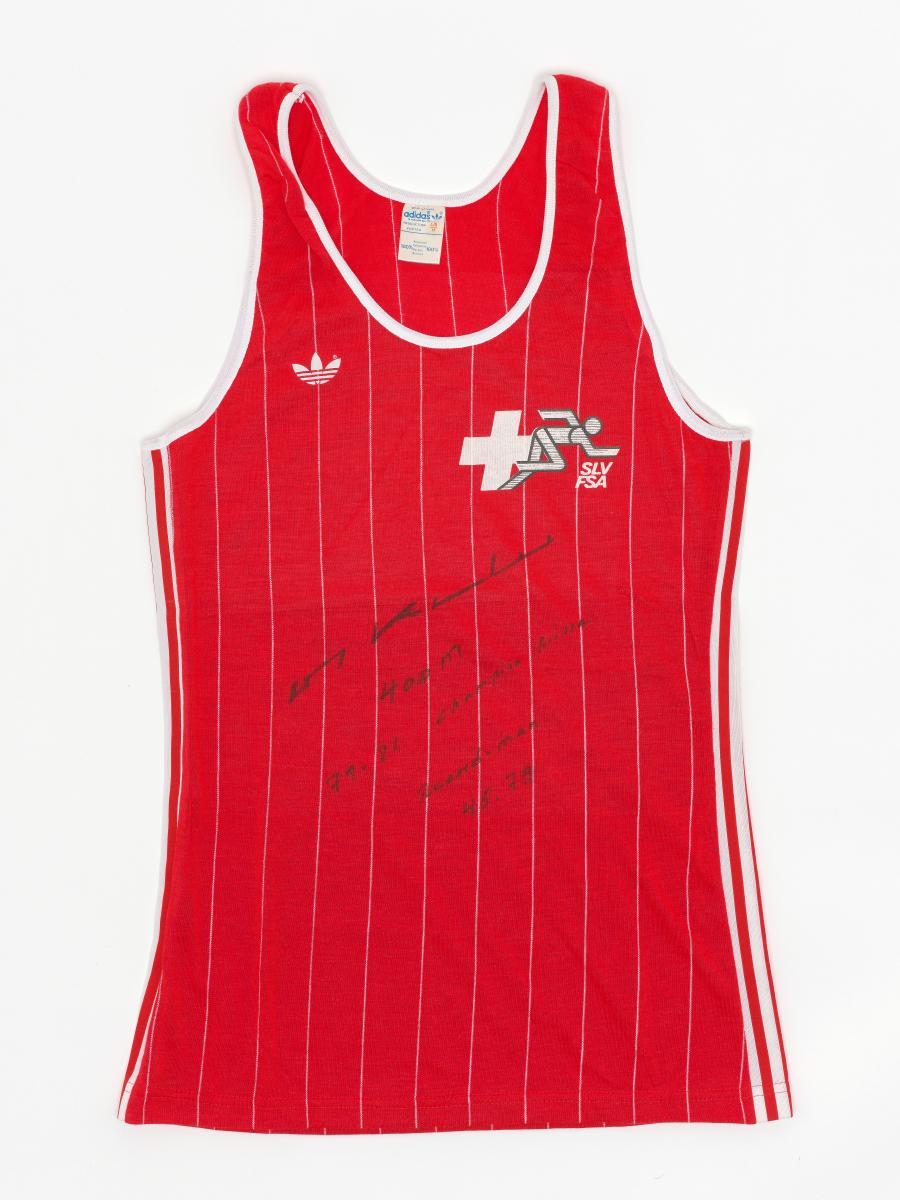 Maillot avec le logo de la Fédération Suisse d'Athlètisme et la légende: "Signature de l'athlète / 400m / 79-81 Champion Suisse / Record-man / 45.79". Taille M.