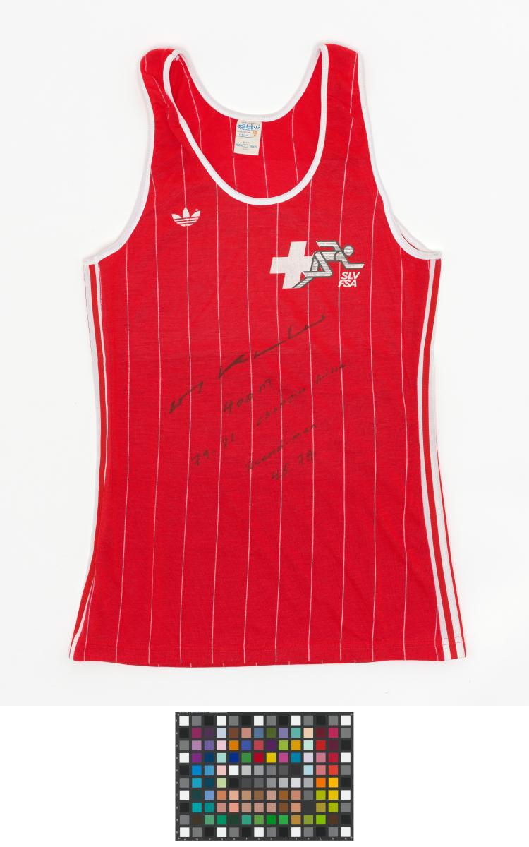 Maillot Adidas porté par Urs KAMBER (SUI), membre de l'équipe suisse du 4x400m aux Jeux de Moscou 1980.