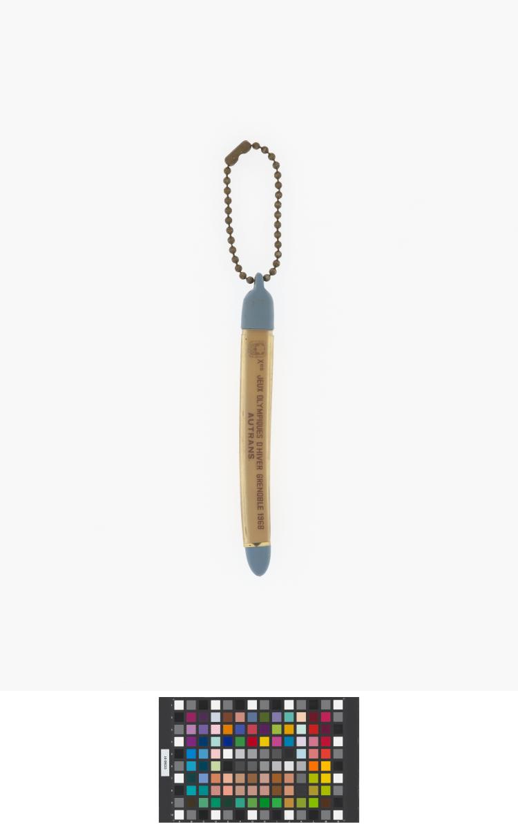 Le porte-clés porte au dos l'emblème des Jeux et l'inscription "Xes Jeux olympiques d'hiver Grenoble 1968, Autrans".