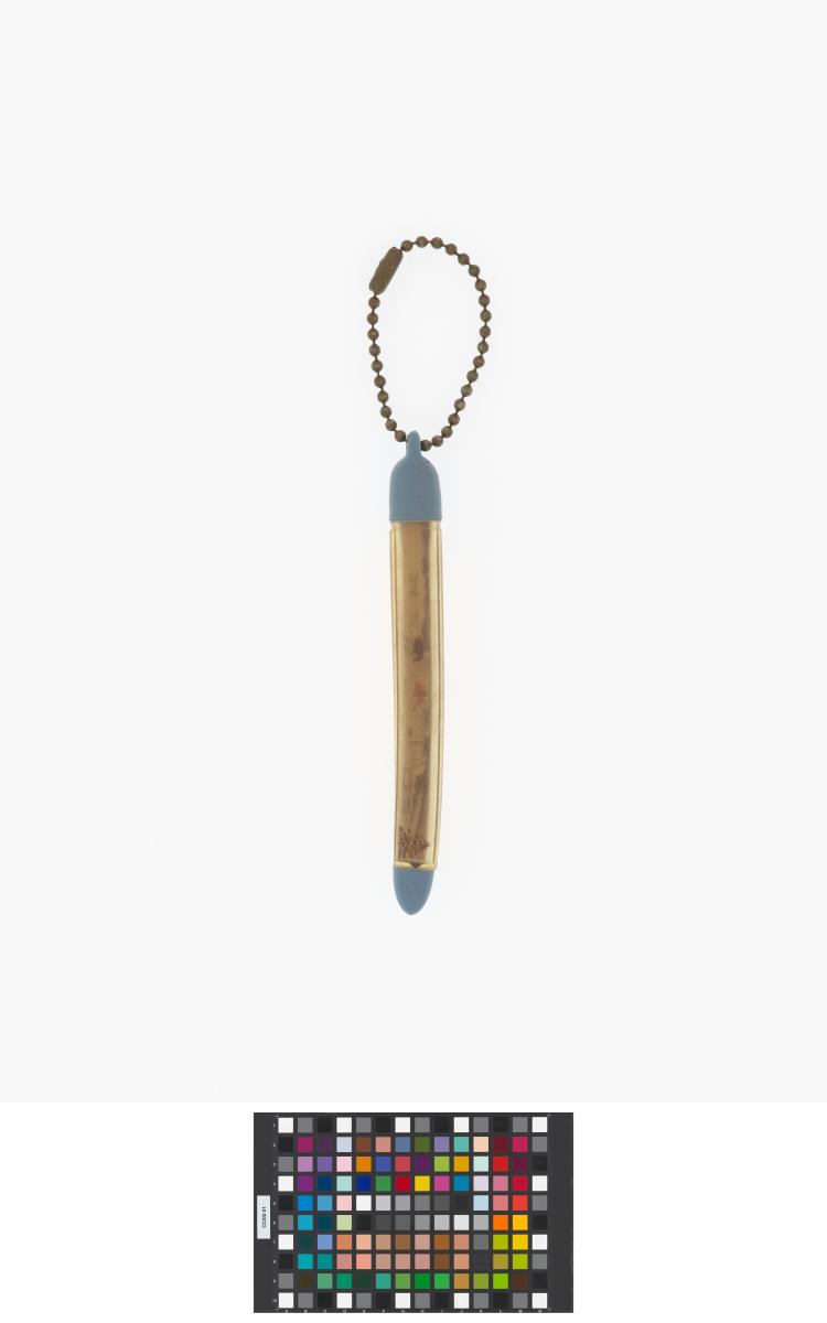 Grenoble 1968, porte-clés en forme de tube avec des skieurs et des maisons en arrière fond.