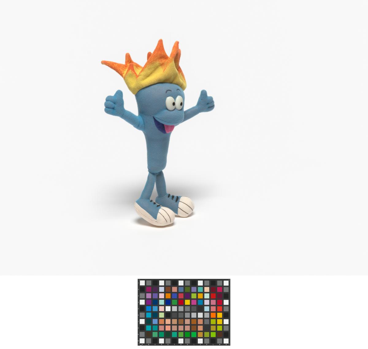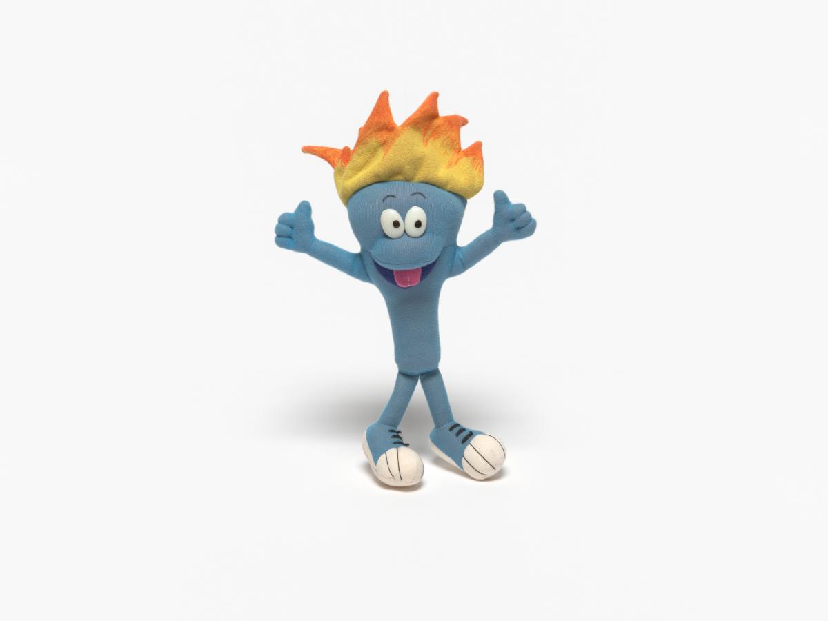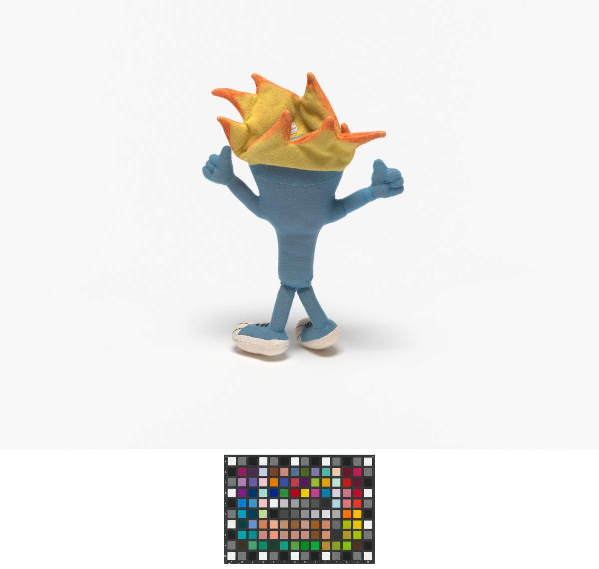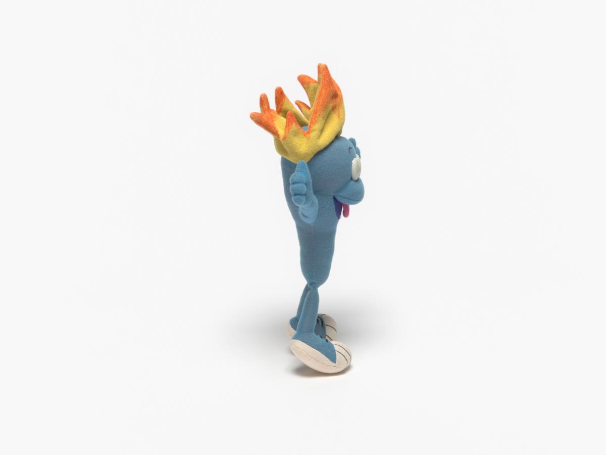 Cet exemplaire a la langue tirée, ses yeux sont en plastique, ses sourcils dessinés sur le tissu et sa flamme est jaune et orange.