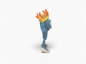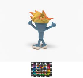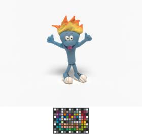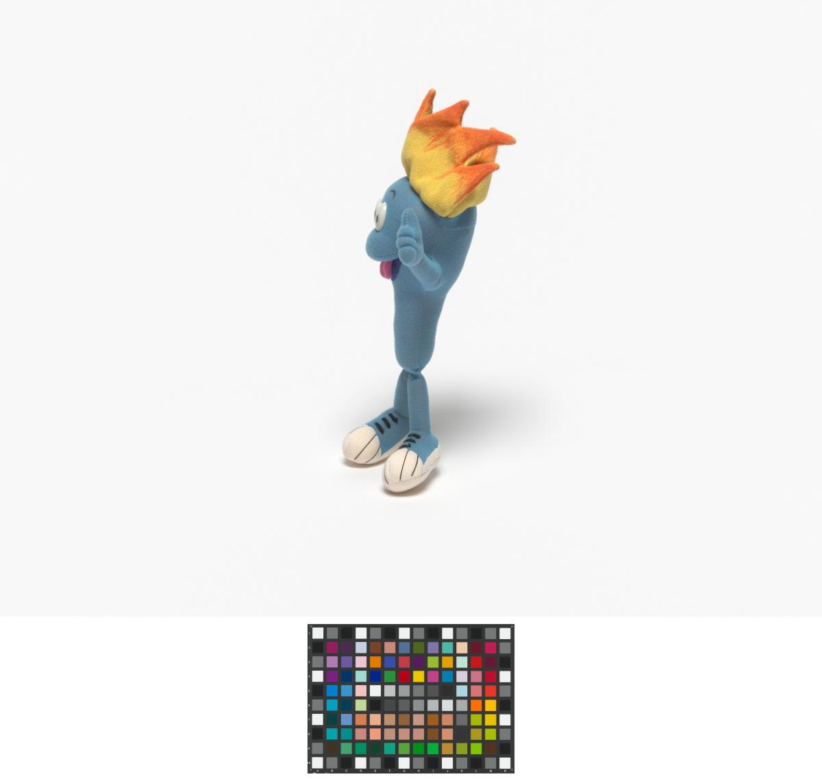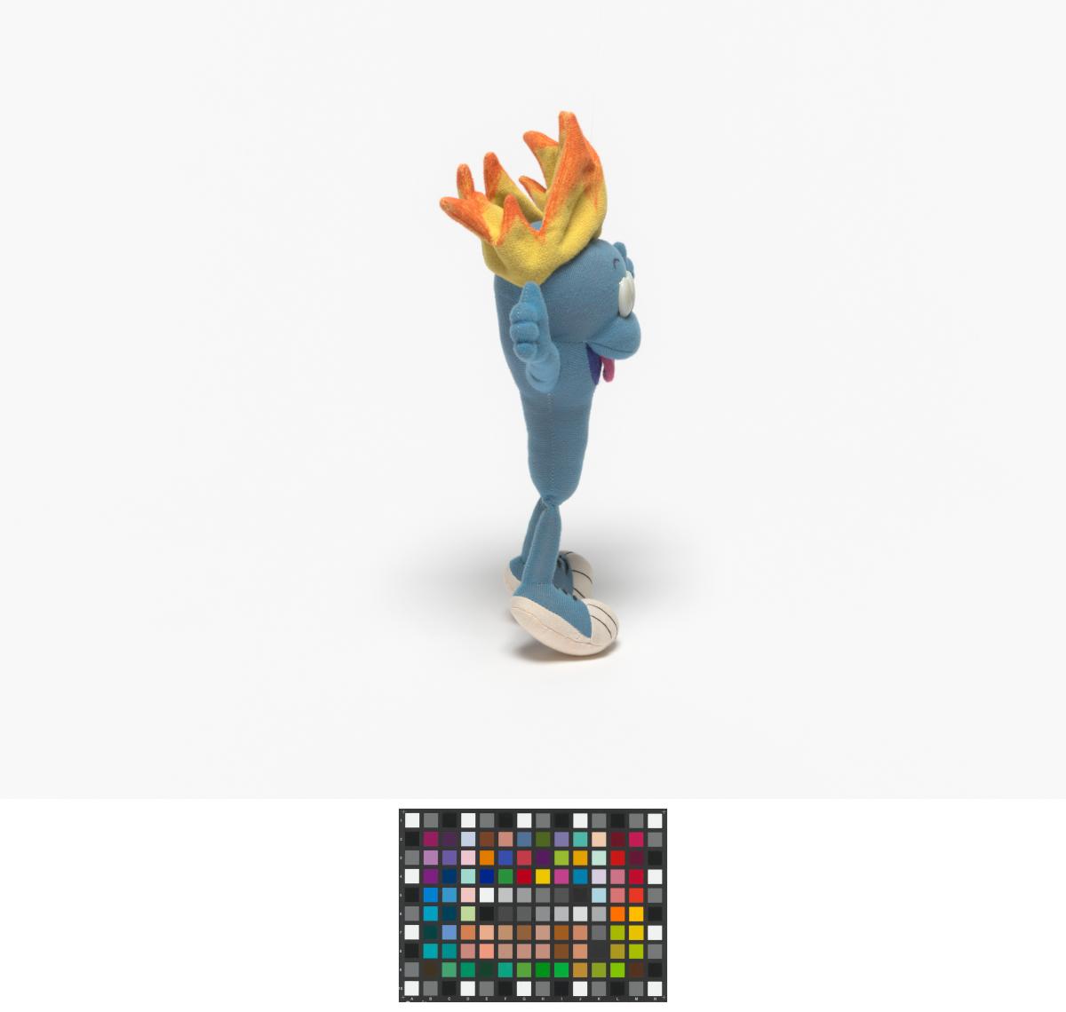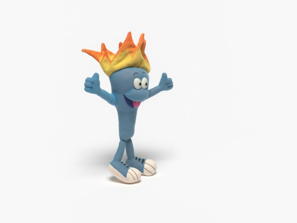 Cet exemplaire a la langue tirée, ses yeux sont en plastique, ses sourcils dessinés sur le tissu et sa flamme est jaune et orange.