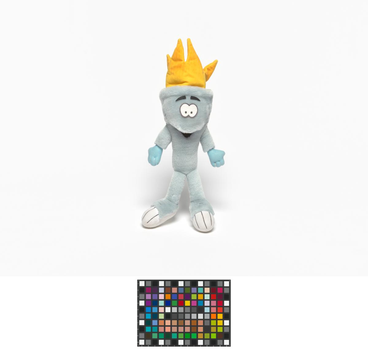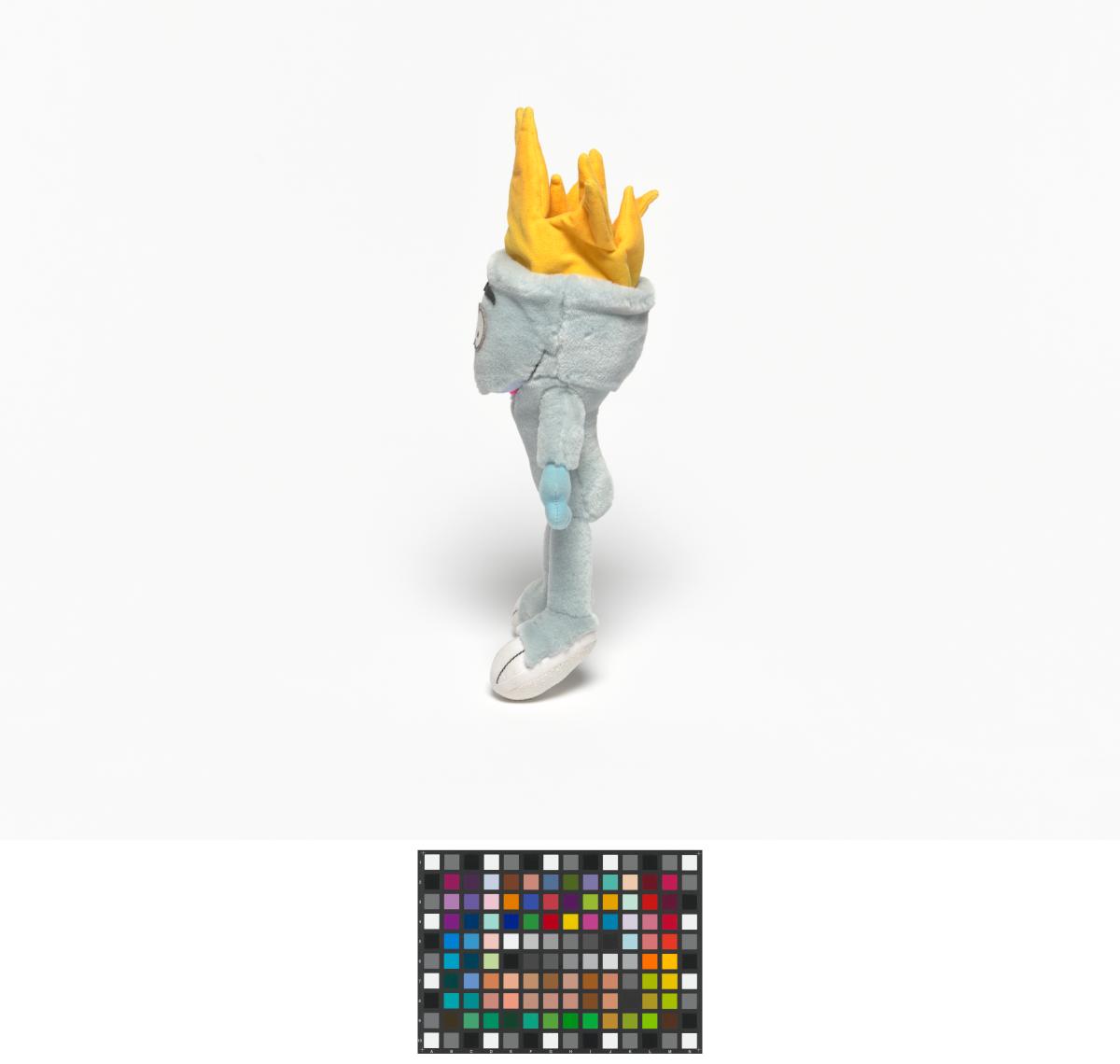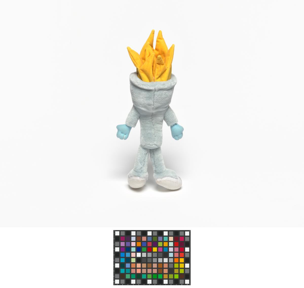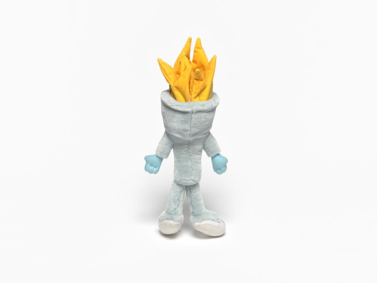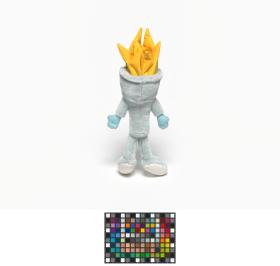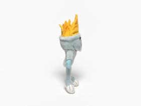 Cet exemplaire a des yeux et des sourcils en tissu et sa flamme jaune-orangé. Ses mains sont d'un matériau différent.