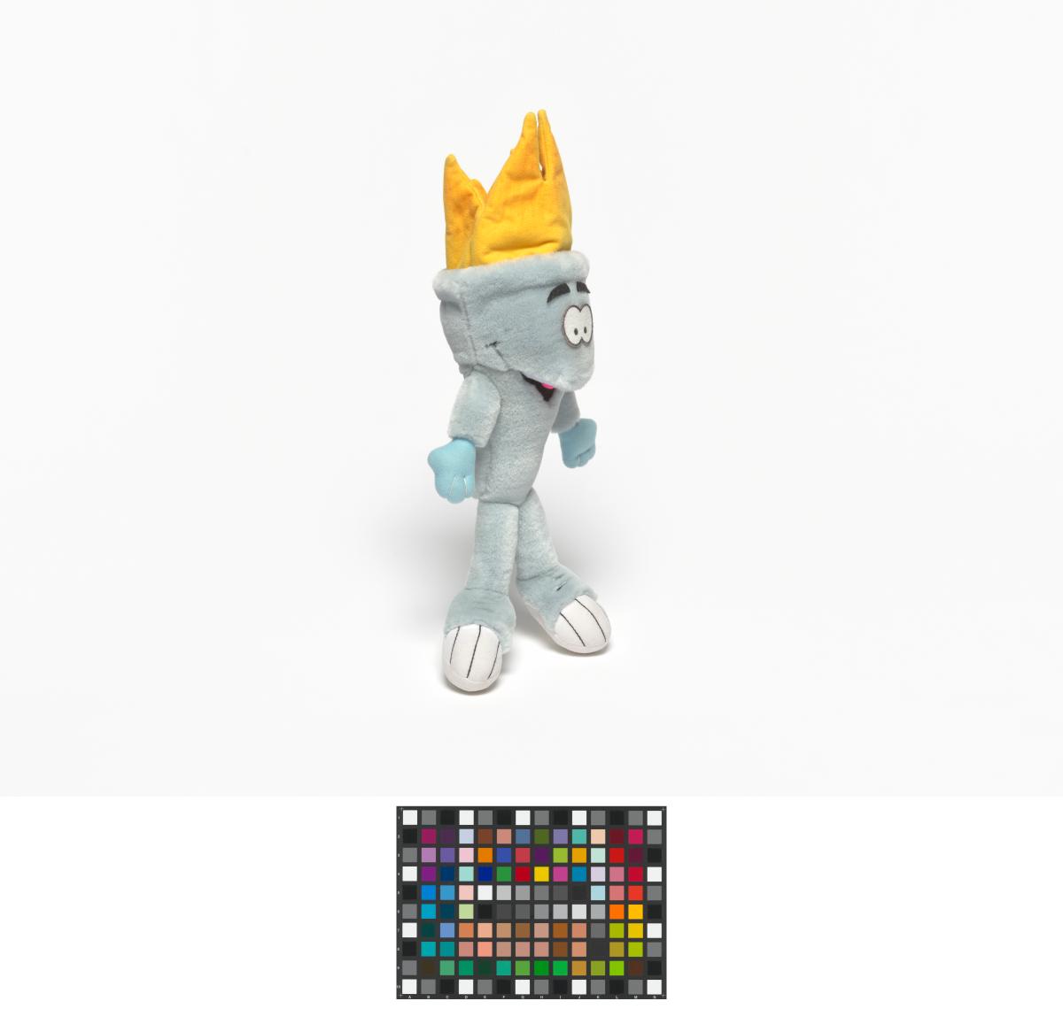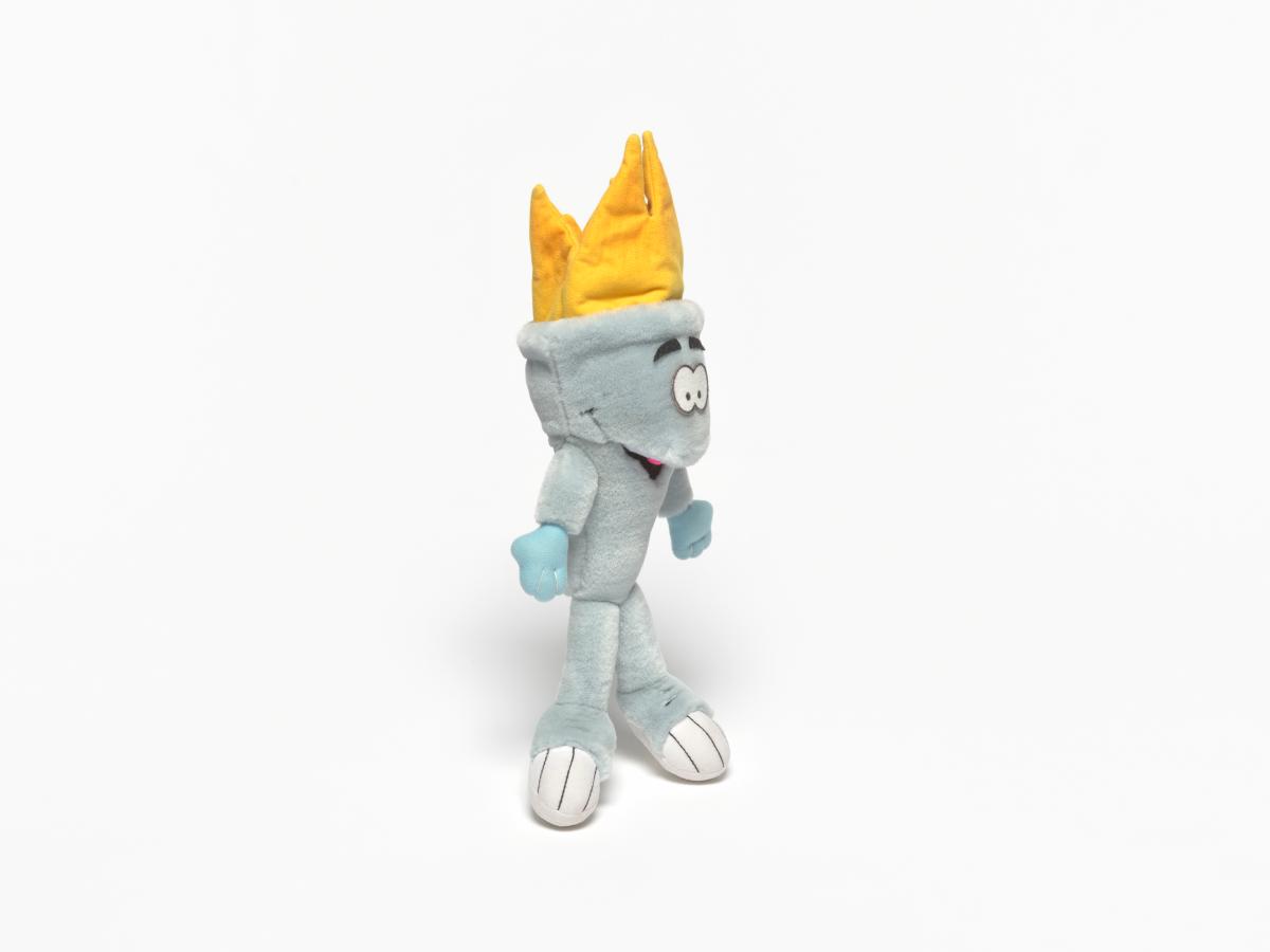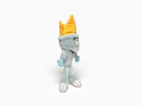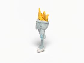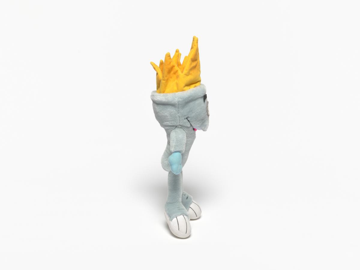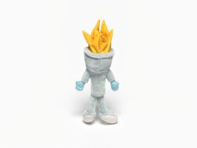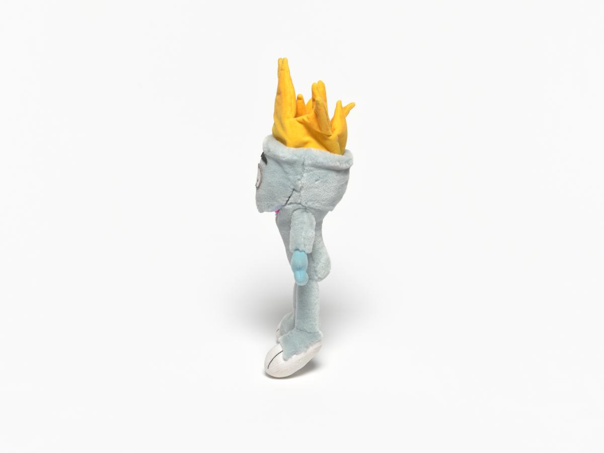 Cet exemplaire a des yeux et des sourcils en tissu et sa flamme jaune-orangé. Ses mains sont d'un matériau différent.