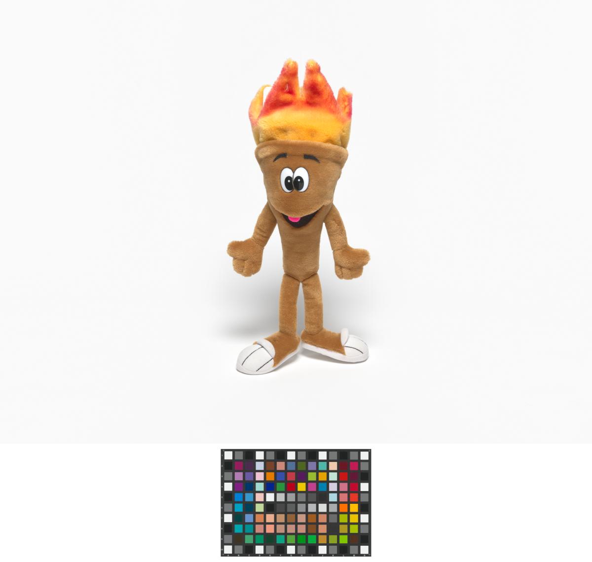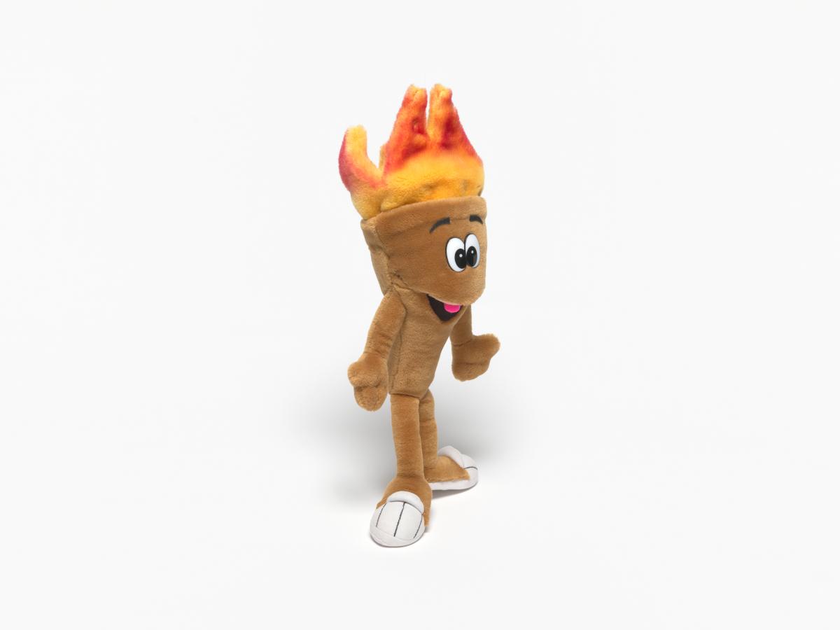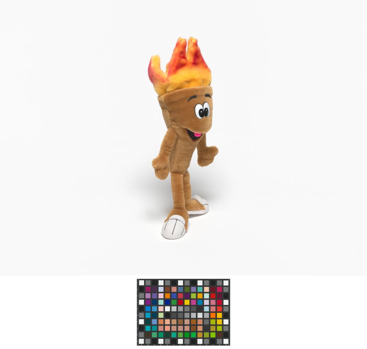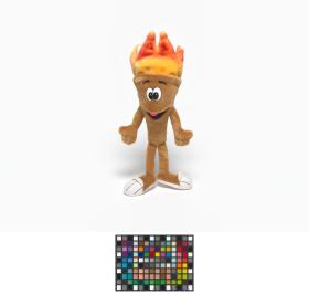 Cet exemplaire a des yeux en plastique et des sourcils en tissu et sa flamme est rouge orangé.
