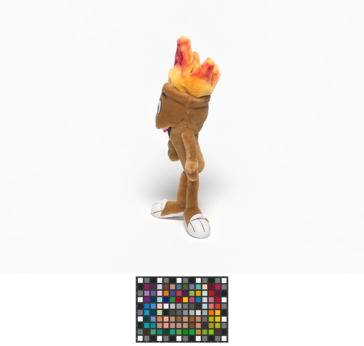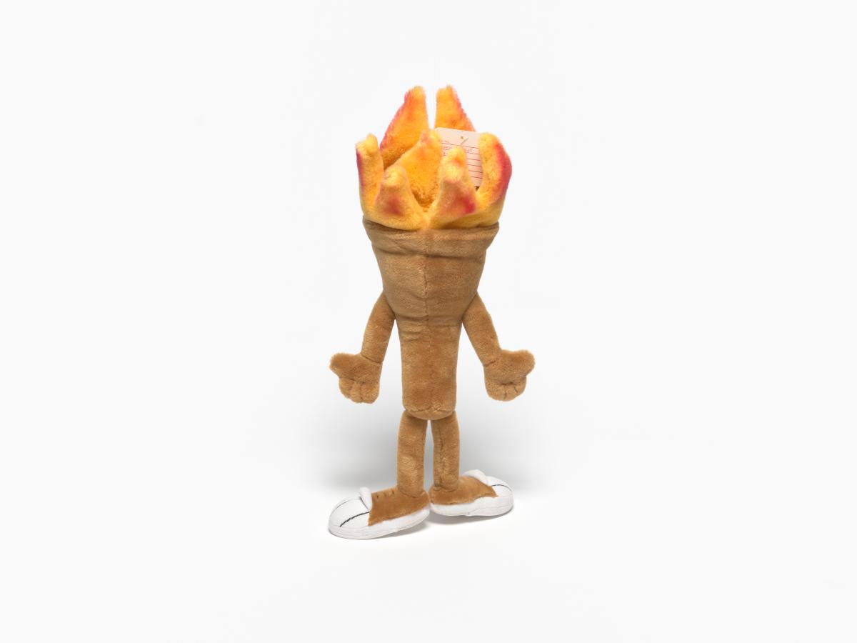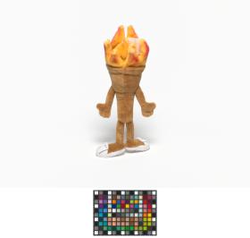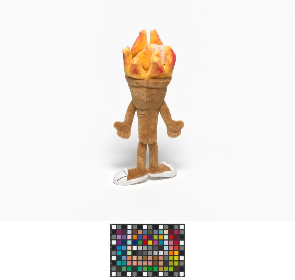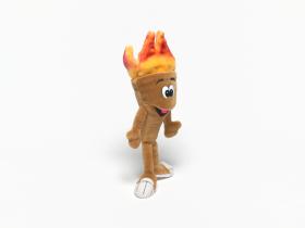 Cet exemplaire a des yeux en plastique et des sourcils en tissu et sa flamme est rouge orangé.