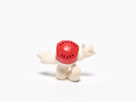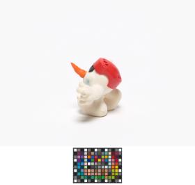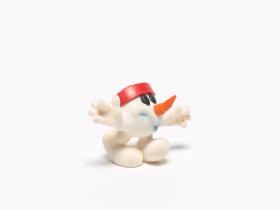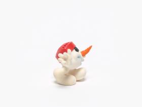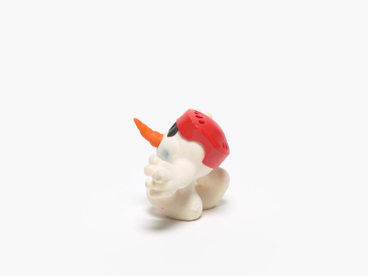 Mascotte en forme de bonhomme de neige portant un casque et une crosse de hockey rouges.