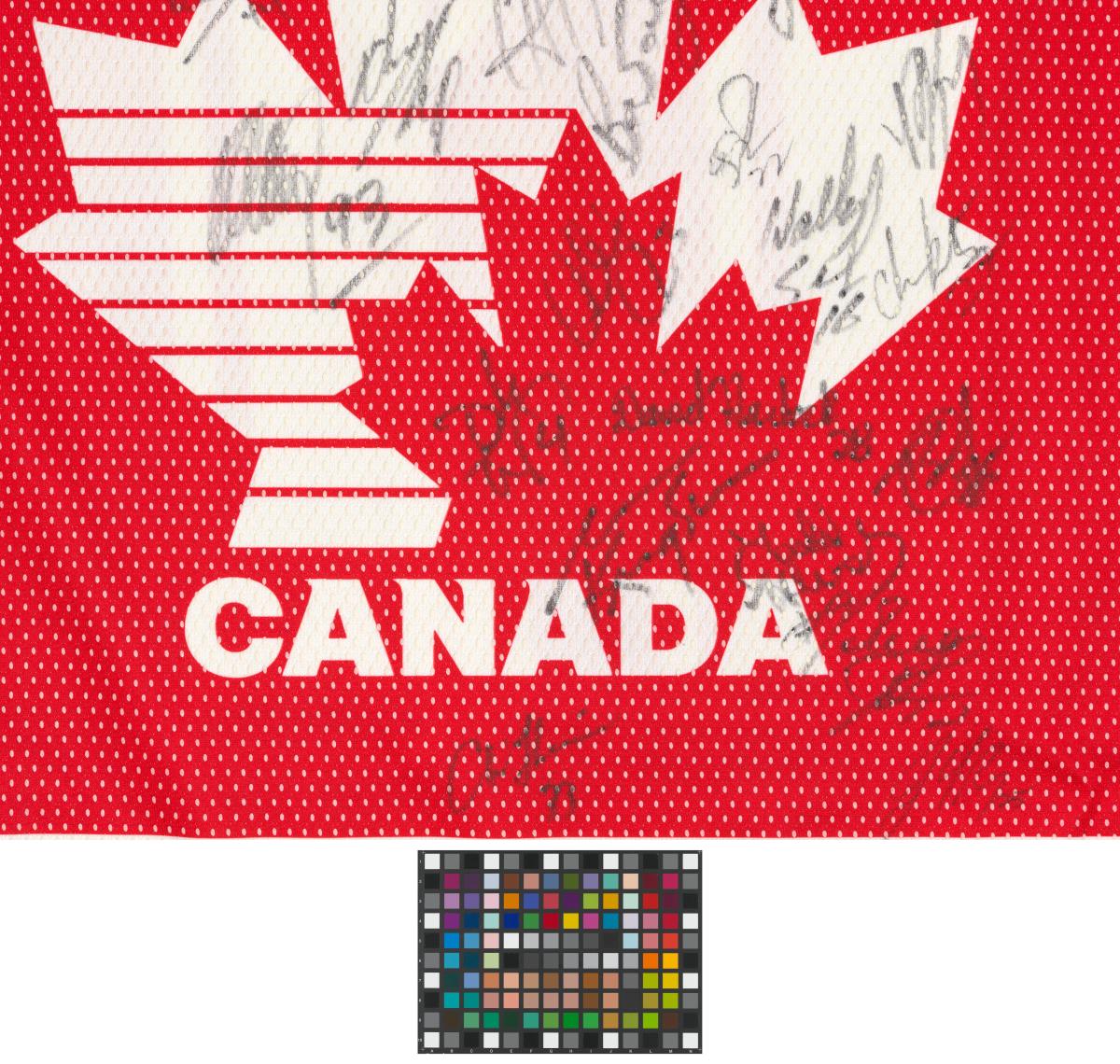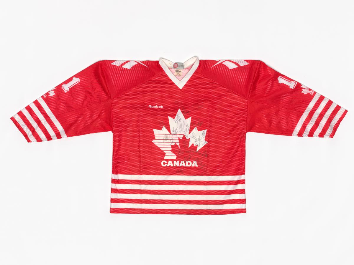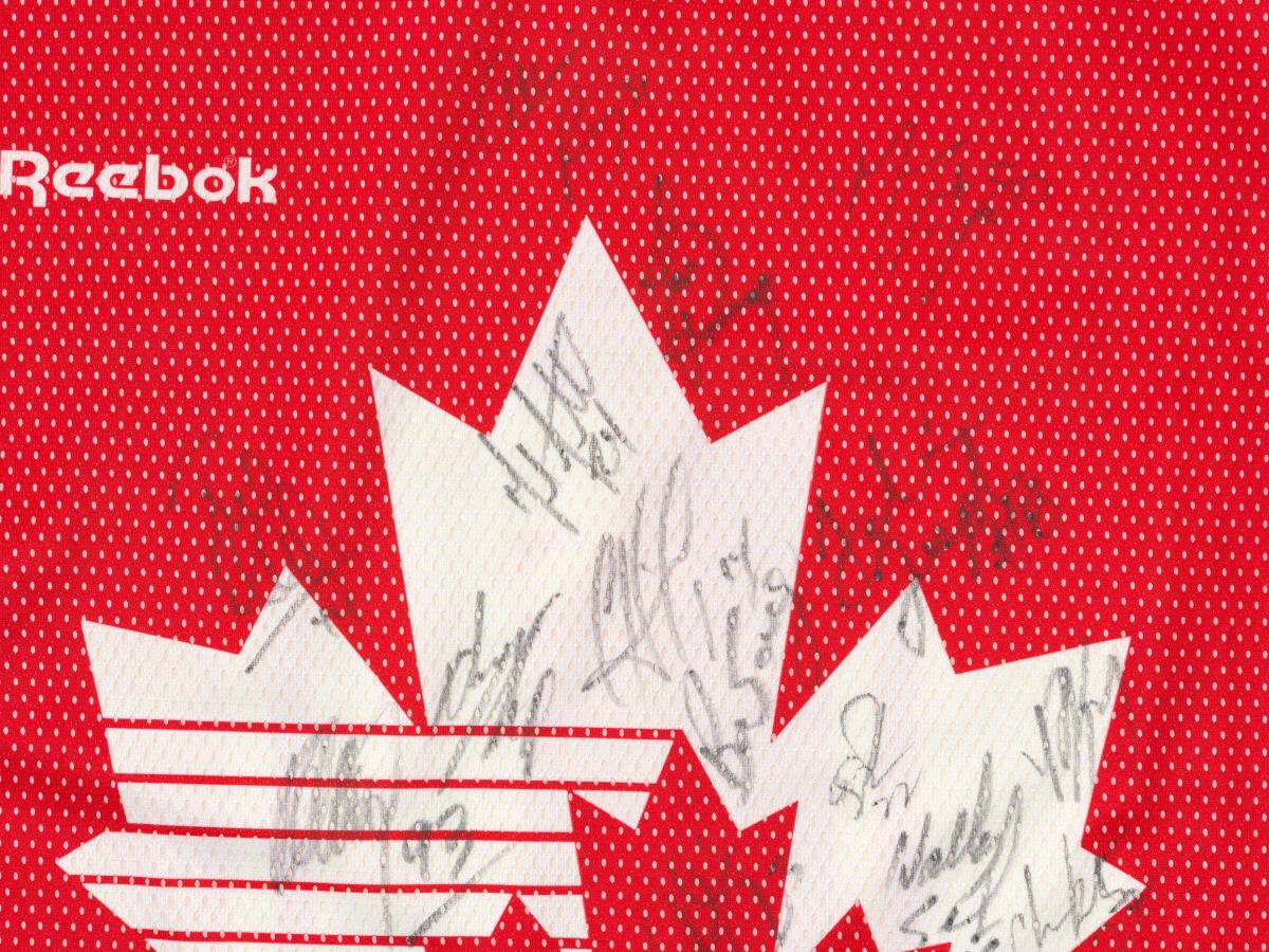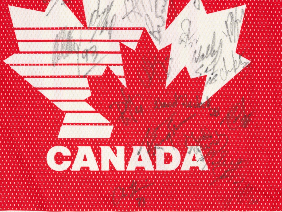 Lillehammer 1994, maillot de hockey de l'équipe canadienne, dédicacé par les joueurs.