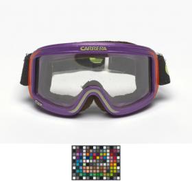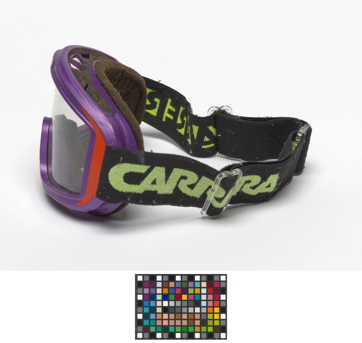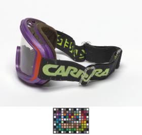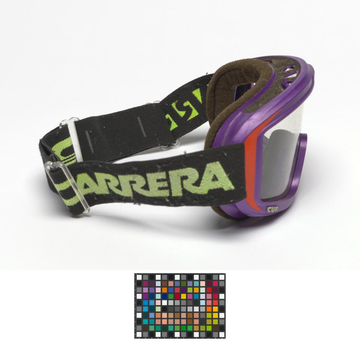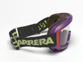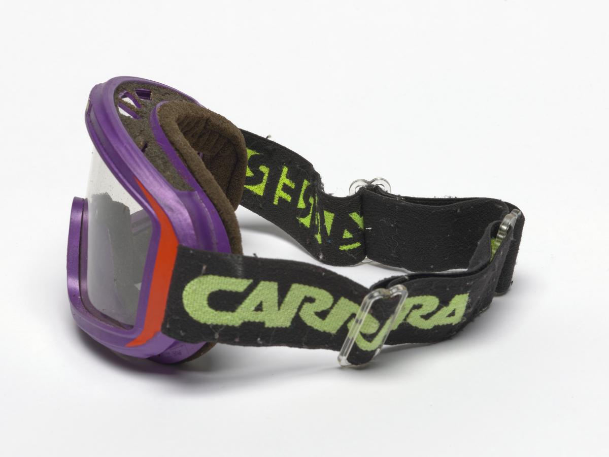 Lunettes Carrera, modèle Cup en plastique violet et rouge, élastique noir avec inscriptions jaunes.