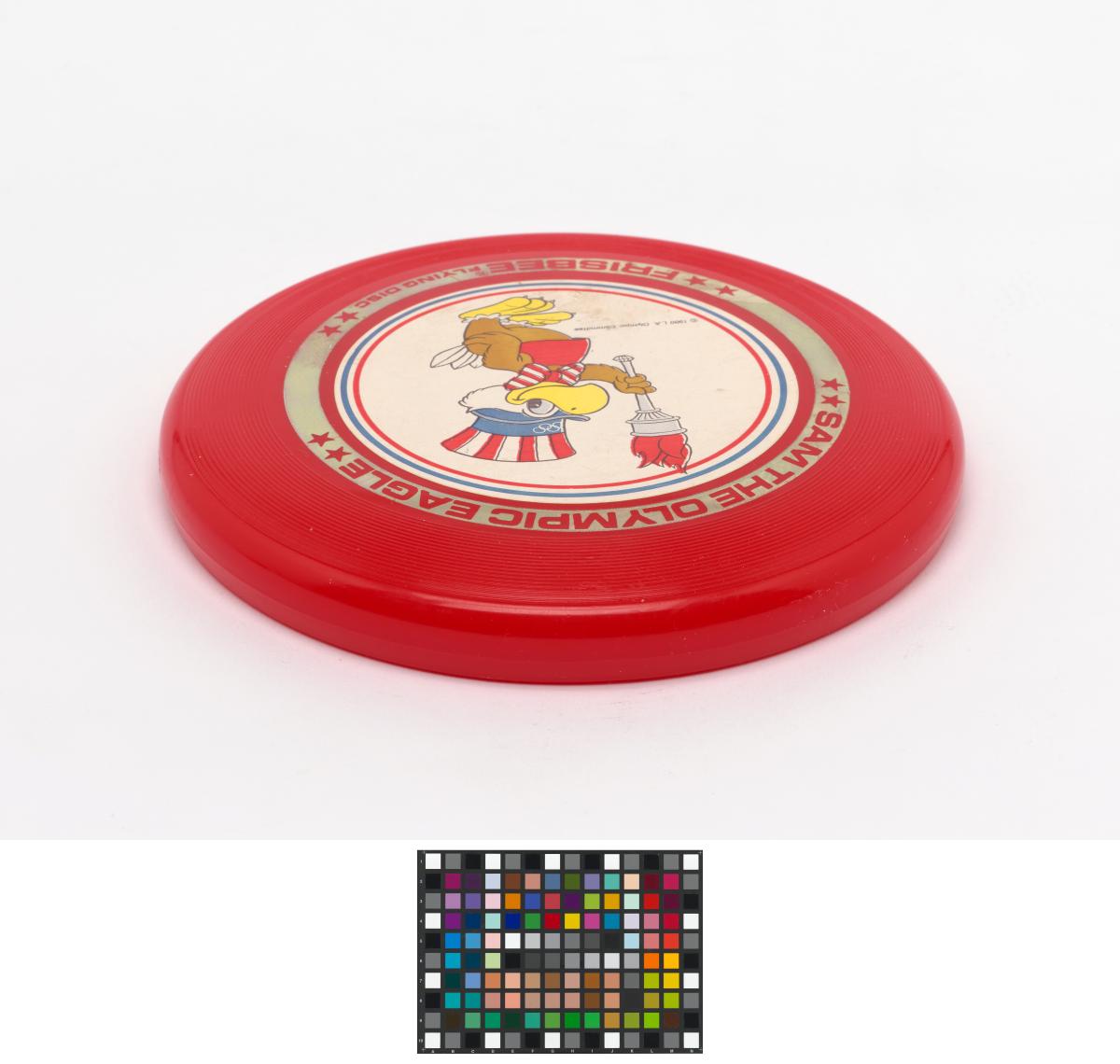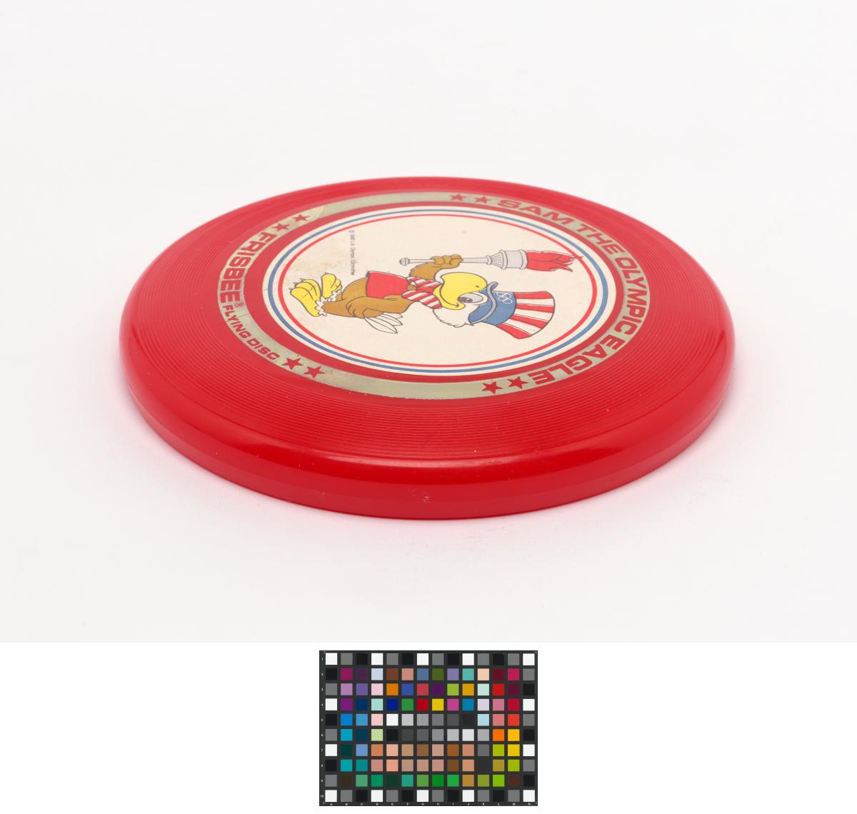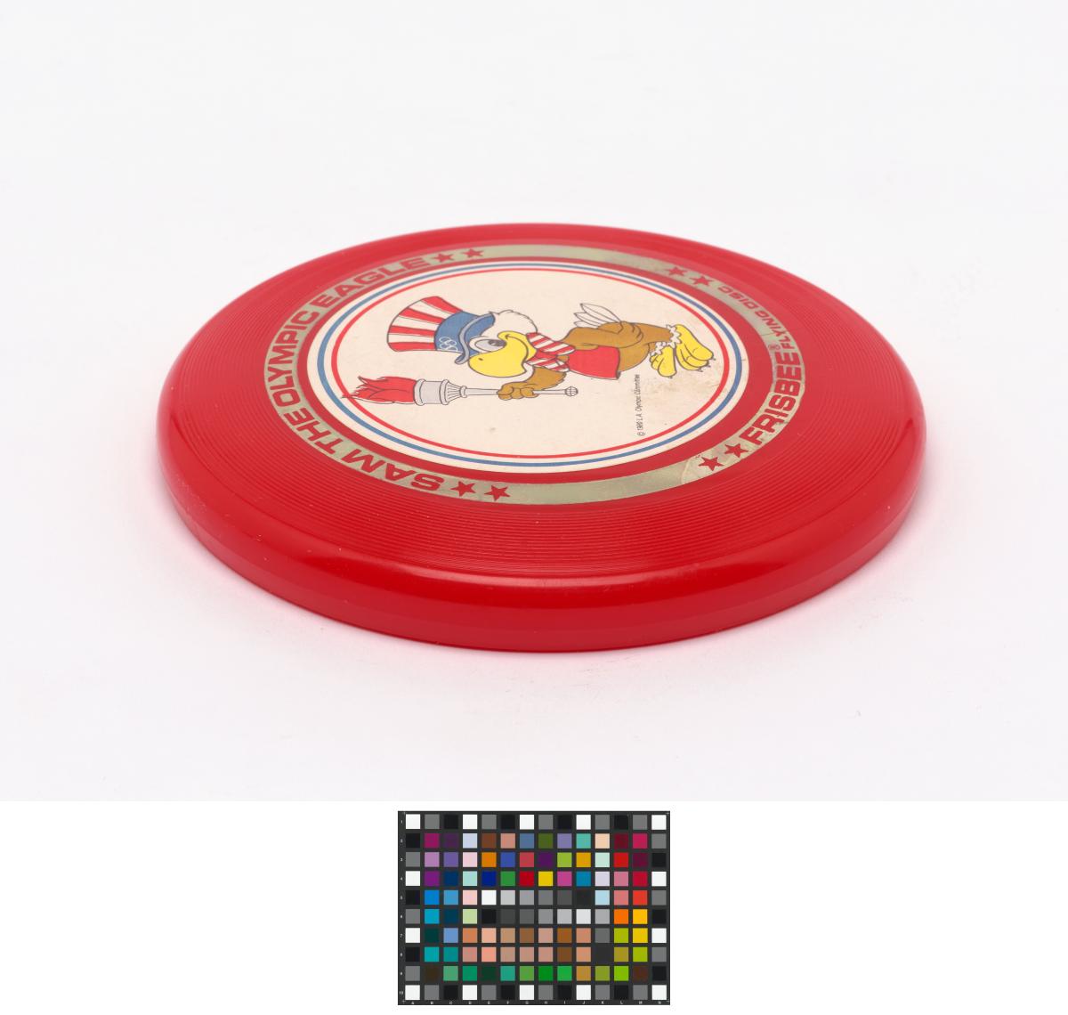 Légende: "Sam the Olympic eagle", "frisbee (flying disc)".