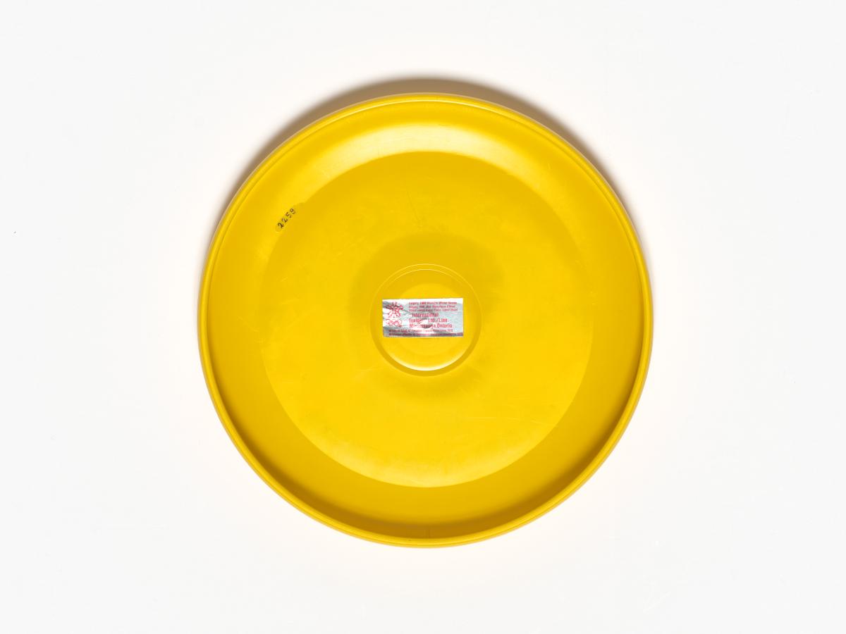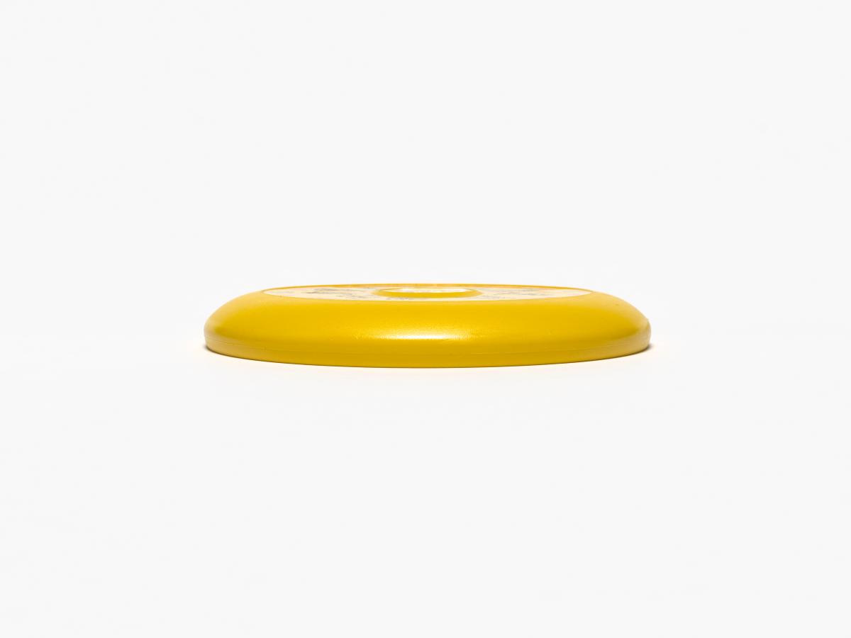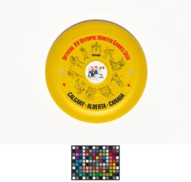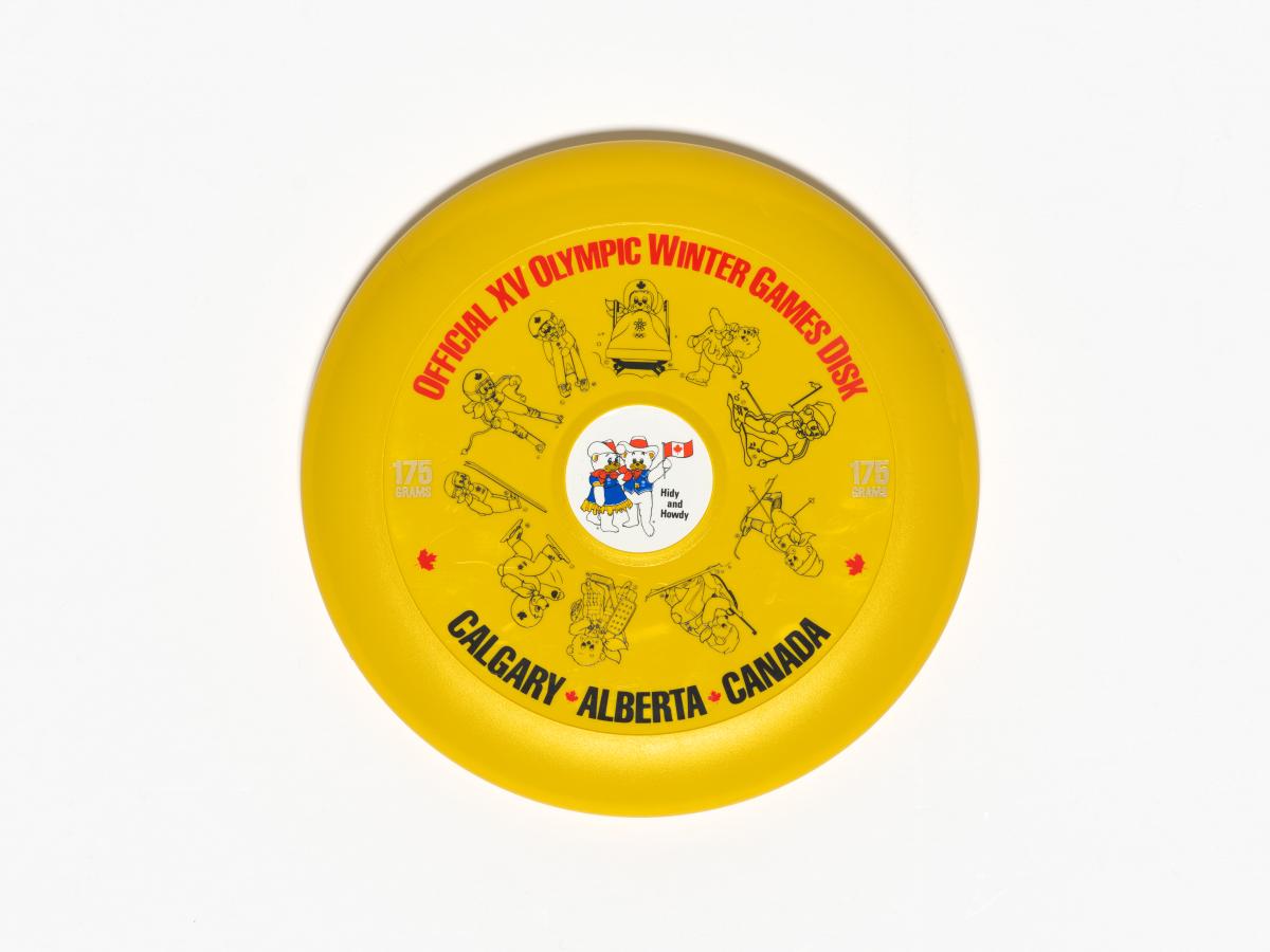 Frisbee jaune avec Hidy et Howdy, les mascottes des Jeux, pratiquant différents sports d'hiver.